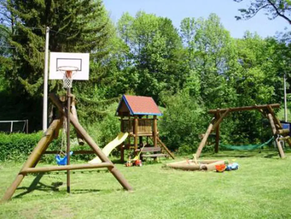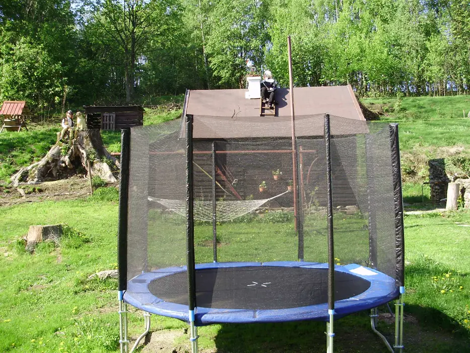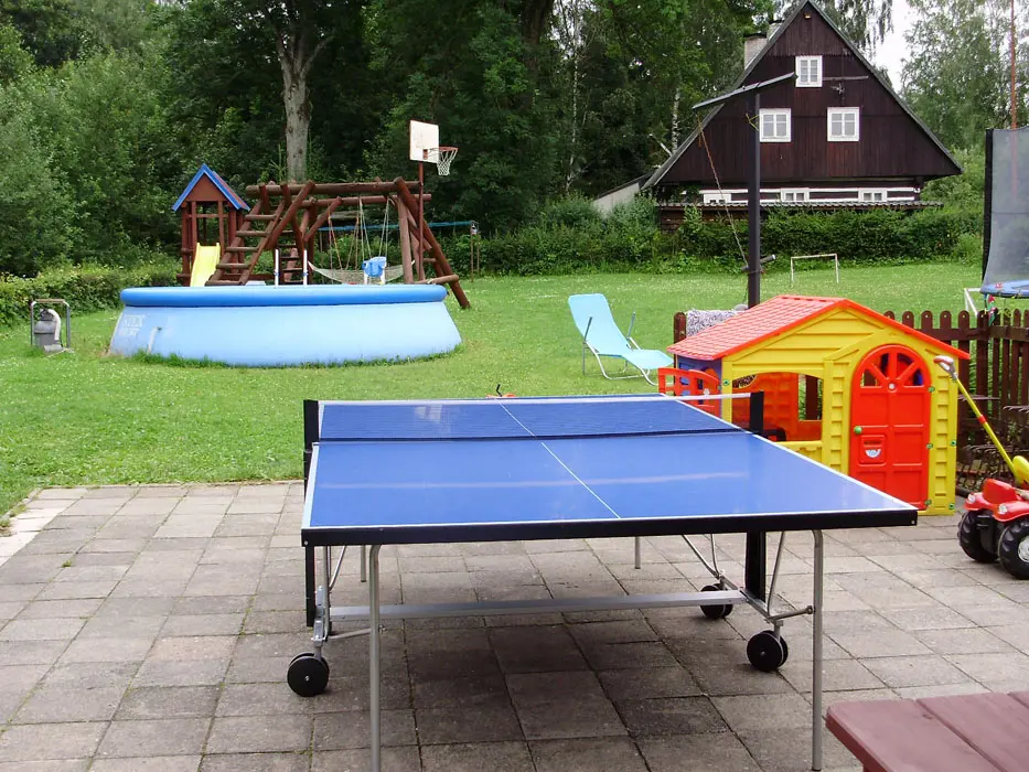 Dřevěné posezení pod pergolou, zahradní nábytek, prolézačky, houpačky, skluzavka, zahradní krb, bazén, trampolína, slunečníky, pískoviště, dětský domeček, volejbalové hřiště, koš na basketbal, kolárna, lyžárna, nový výběh pro ovce