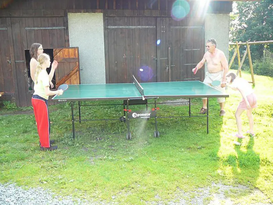 Velké travnaté hřiště - nohejbal, volejbal, kryté posezení - krb - grilování na kameni, zapuštěný venkovní bazén cca 7,5 x 4m, stolní tenis, houpačky, pískoviště