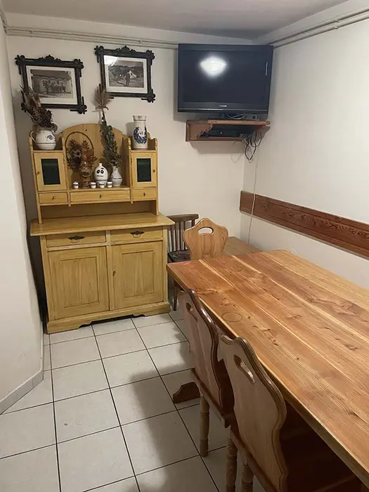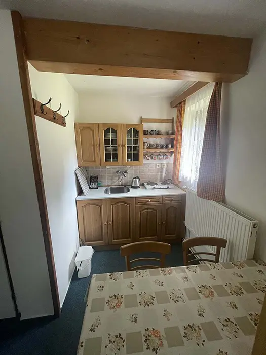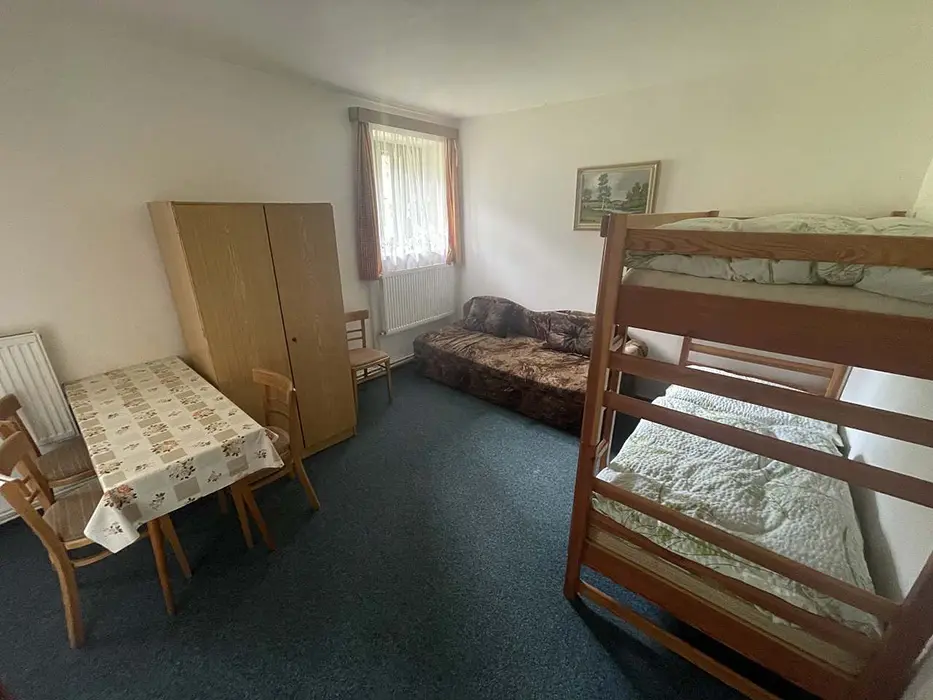 Velká společenská místnost s posezením, TV, lednice a mikrovlnka. V původní stylové části - společná kuchyně s kachlovými kamny - myčka nádobí, el. sporák, TV, nádobí. 2 ložnice 2x5 lůžek. Soc. zařízení - 2 koupelny - 1x s vanou a WC, 1x s WC. V nové části - 3 ložnice 3x2 lůžka + 6 přistýlek. Na každém pokoji soc. zařízení a kuchyňka. Topení - automatické plynové, ve stylové chalupě kachlová kamna