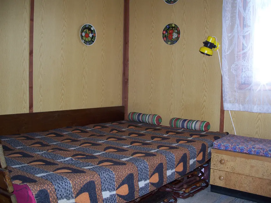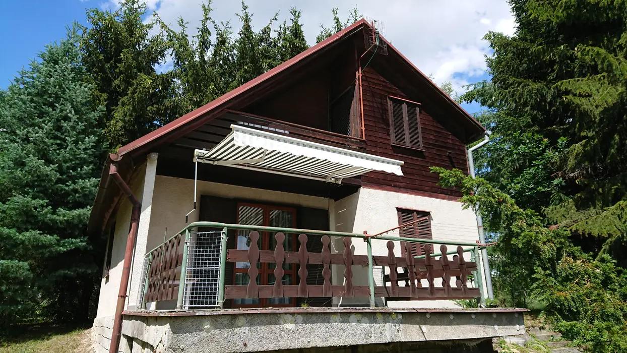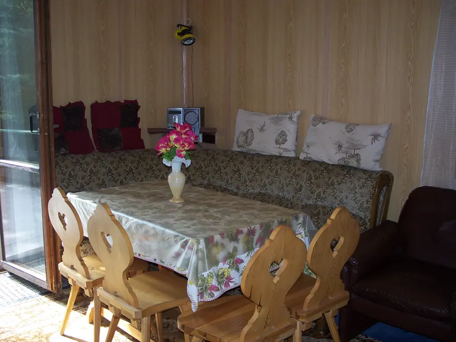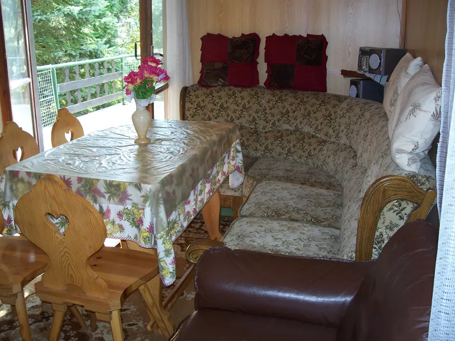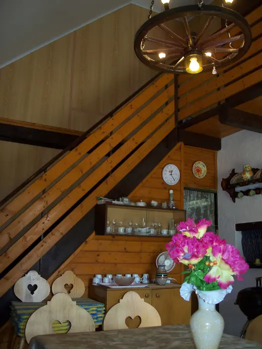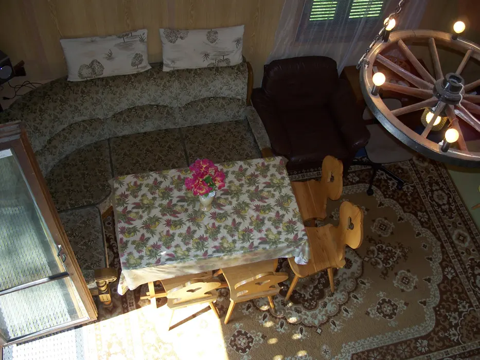 V přízemí obývací pokoj s posezením, TV, vstup na terasu s posezením. Kuchyně - el. dvoukolový vařič, mikrovlnka, lednice, varná konvice, nádobí. 3 ložnice - v přízemí 1x2 lůžka, v patře - 2x1 + 1,5 rozkládací lůžko. V oknech sítě proti hmyzu. Soc. zařízení - koupelna se sprchou, samostatné WC. Topení - tuhá paliva + elektrické přímotopy