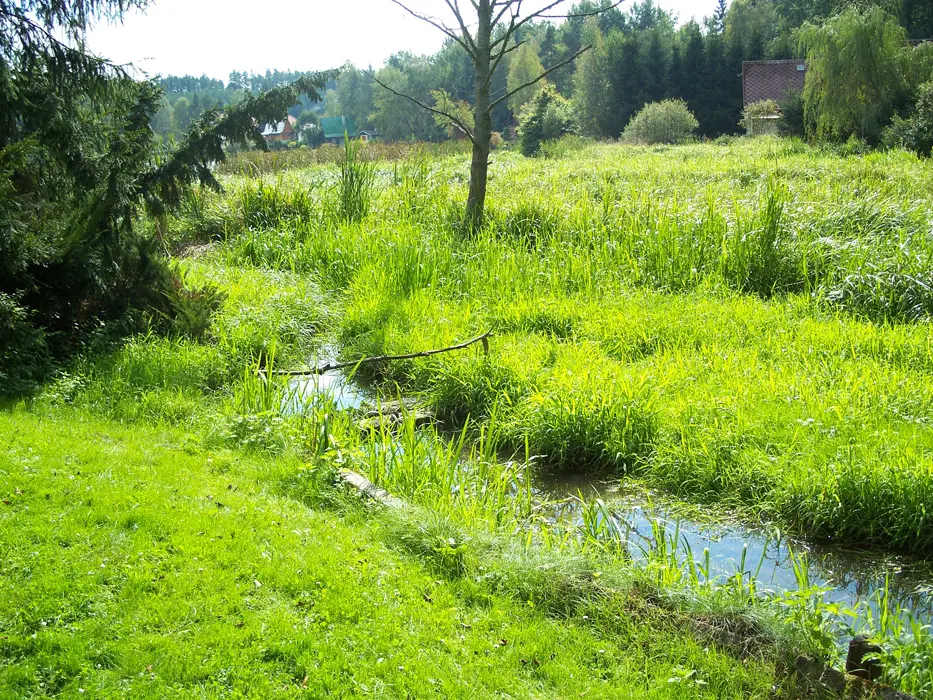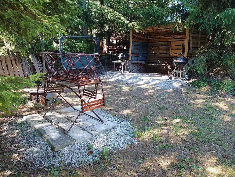 Posezení s ohništěm, další posezení na terase - 19m2, vstup z obývacího pokoje, k dispozici gril. Na okraji pozemku teče potůček