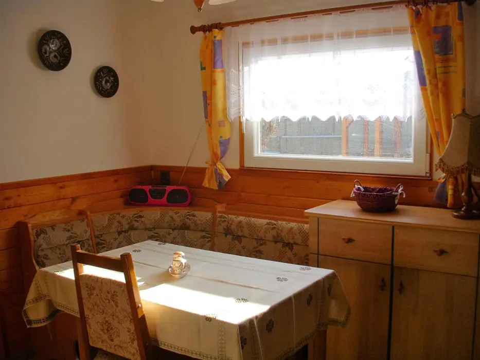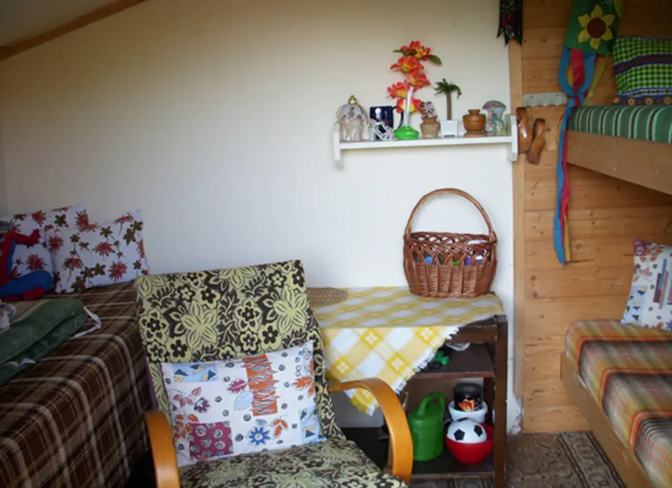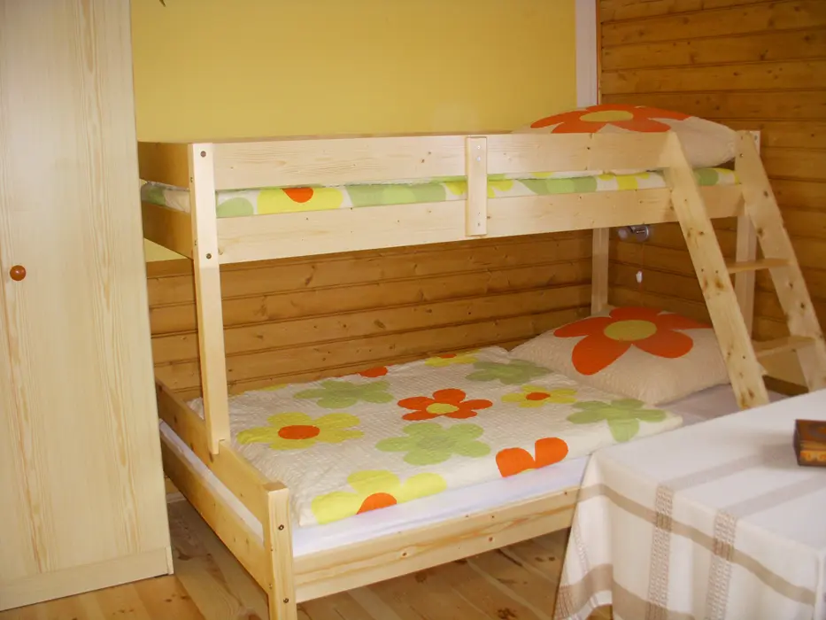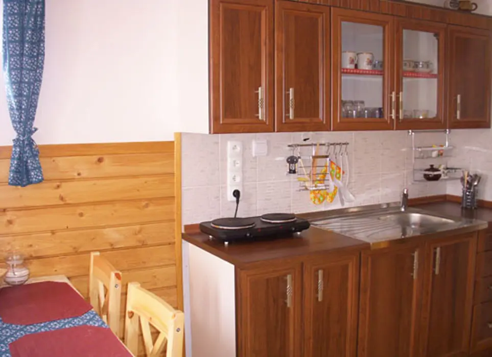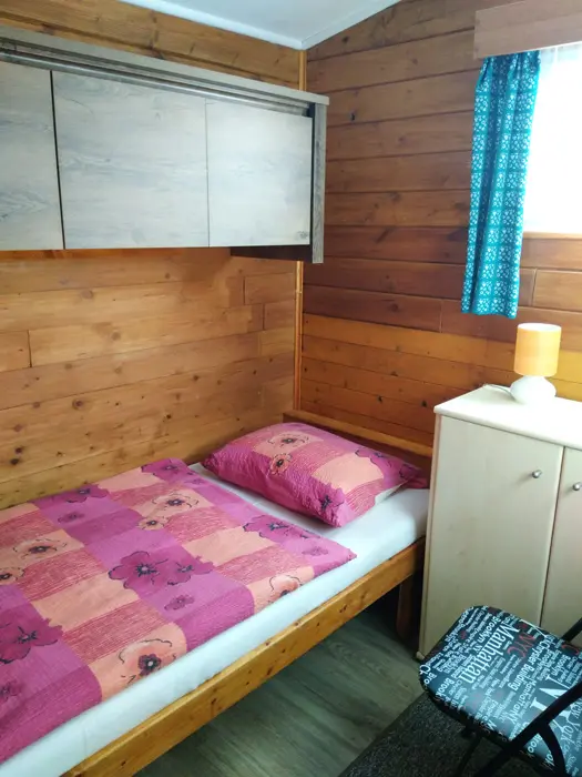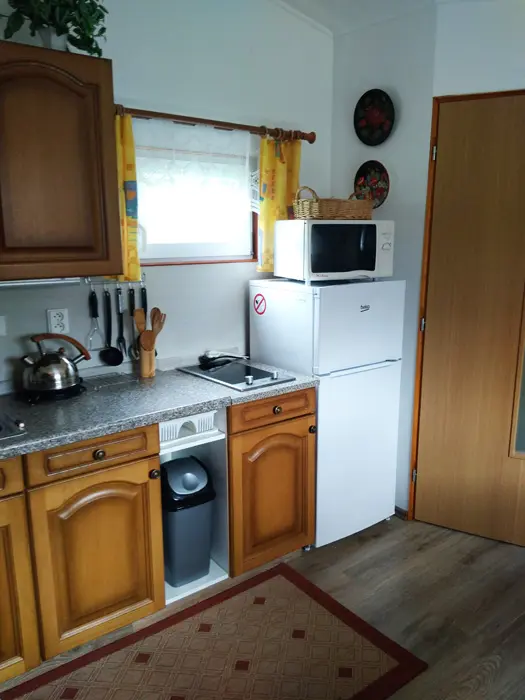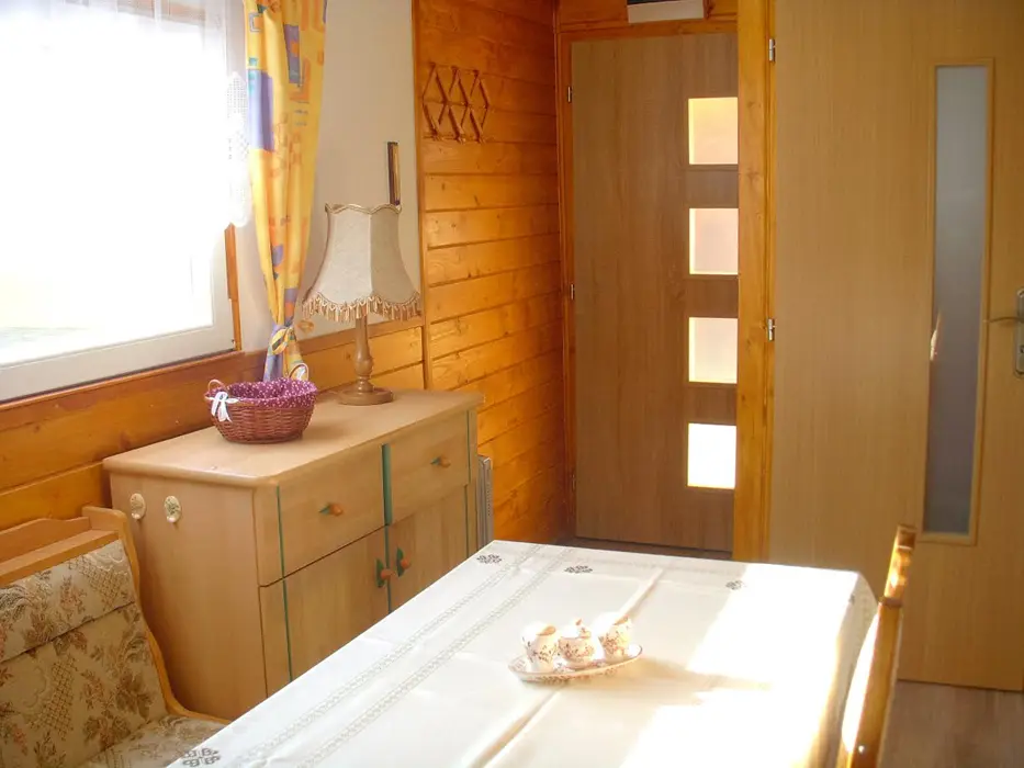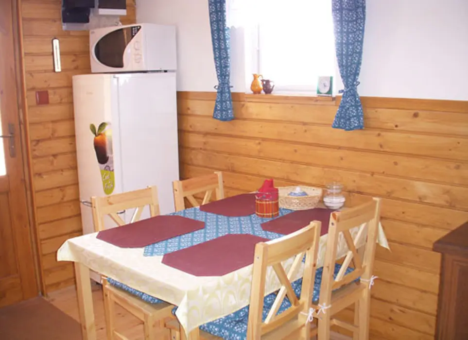 Kapacita - 4 os. Samostatná kuchyně plně vybavena - kuchyňská linka, lednice s mrazákem, el. vařič dvouplotýnkový, varná konvice, mikrovlnná trouba a základní nádobí, jídelní stůl se židlemi. Obývací pokoj - posezení, 2x válenda, malá obývací stěna s televizí, konferenční stolek a 2 křesla. 1 ložnice - palanda + válenda. Koupelna - masážní sprchový kout, WC. Topení el. přímotopy.