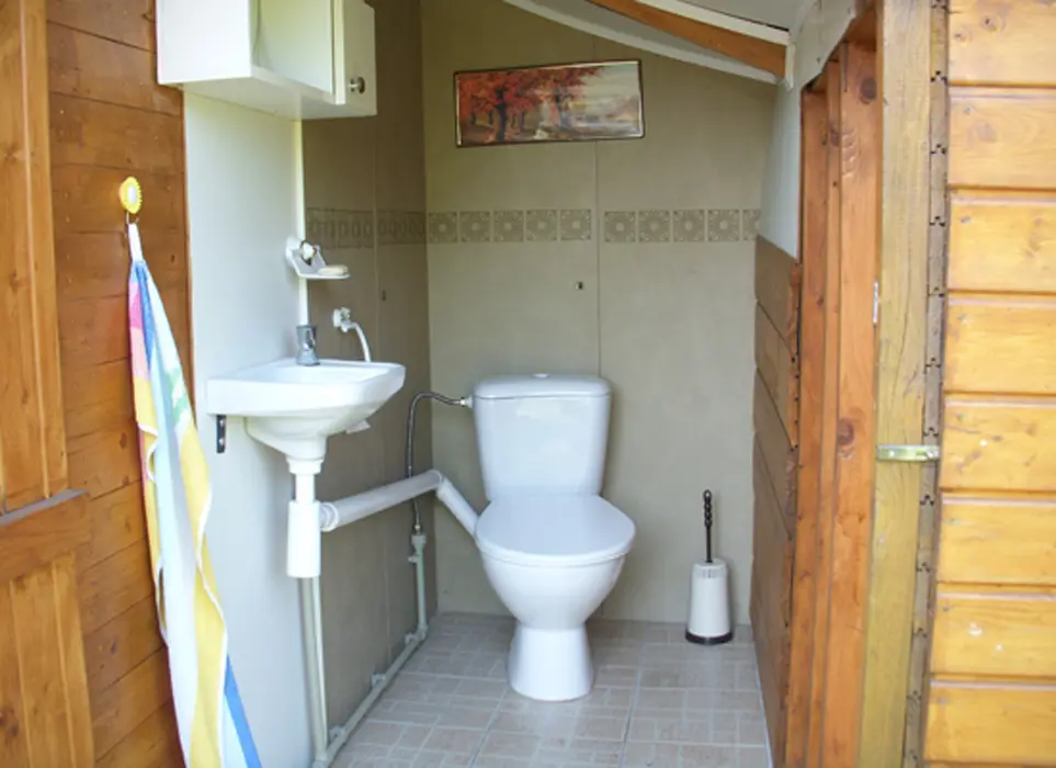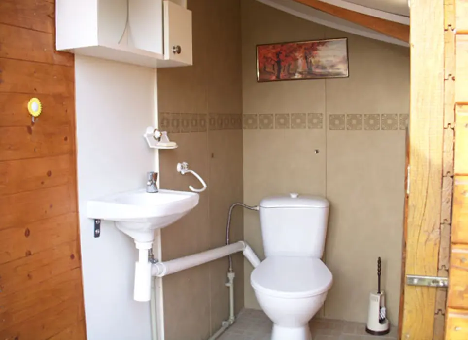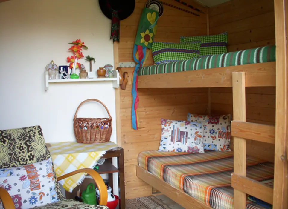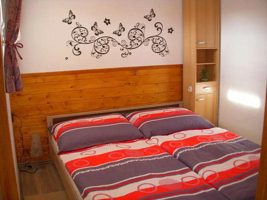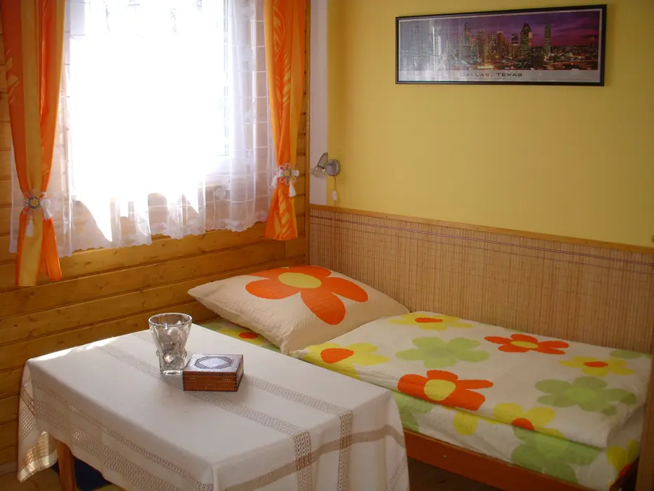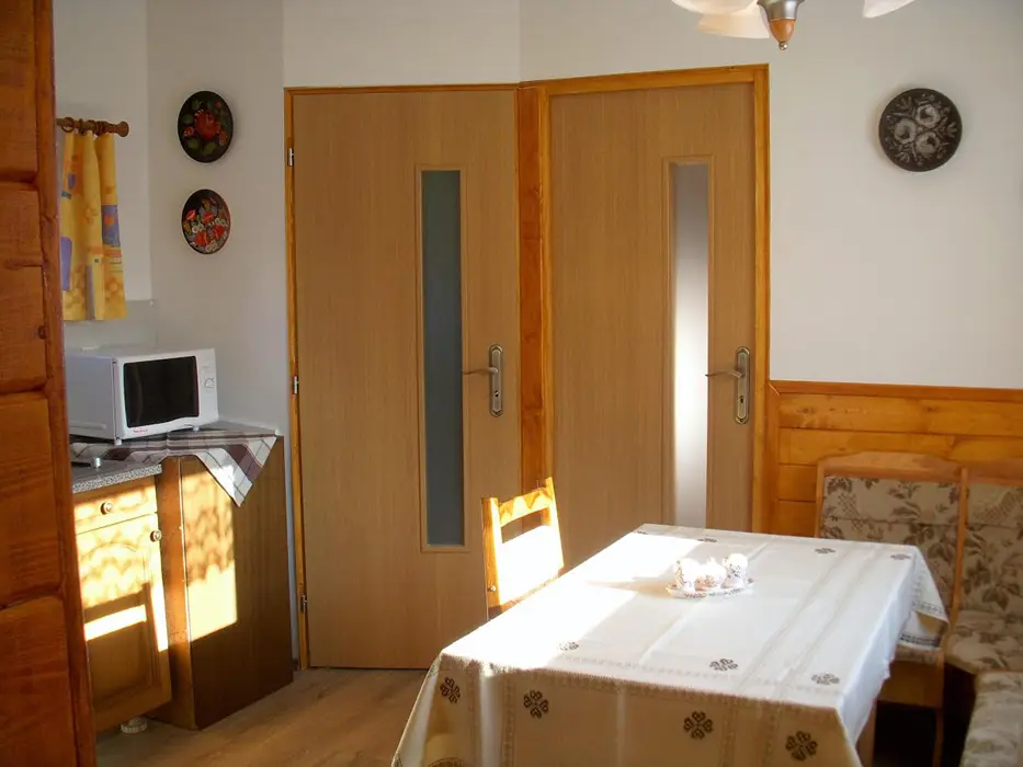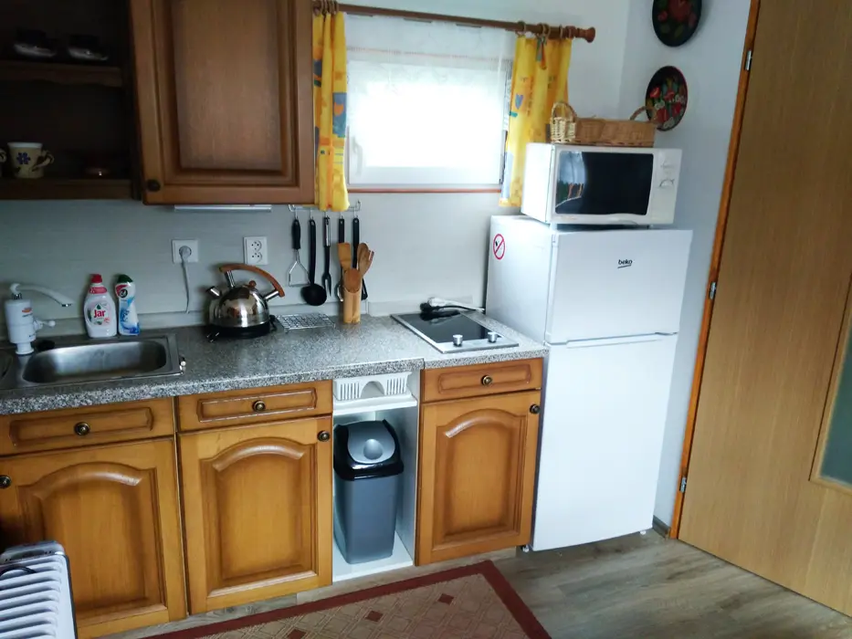 Kapacita - 4 os. Samostatná kuchyně plně vybavena - kuchyňská linka, lednice s mrazákem, el. vařič dvouplotýnkový, varná konvice, mikrovlnná trouba a základní nádobí, jídelní stůl se židlemi. Obývací pokoj - posezení, 2x válenda, malá obývací stěna s televizí, konferenční stolek a 2 křesla. 1 ložnice - palanda + válenda. Koupelna - masážní sprchový kout, WC. Topení el. přímotopy.