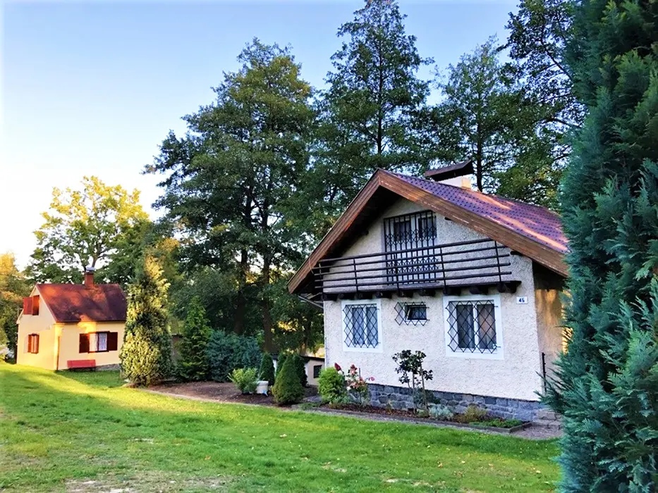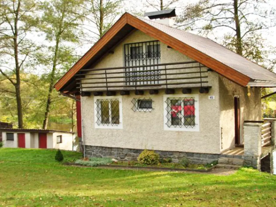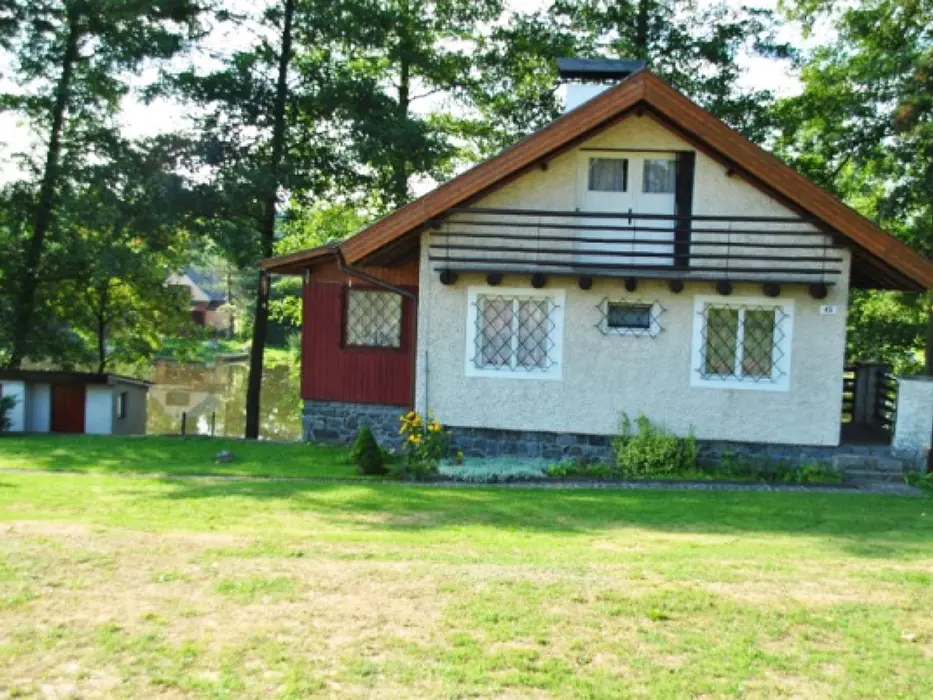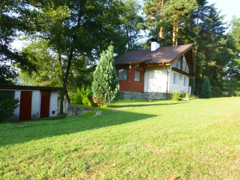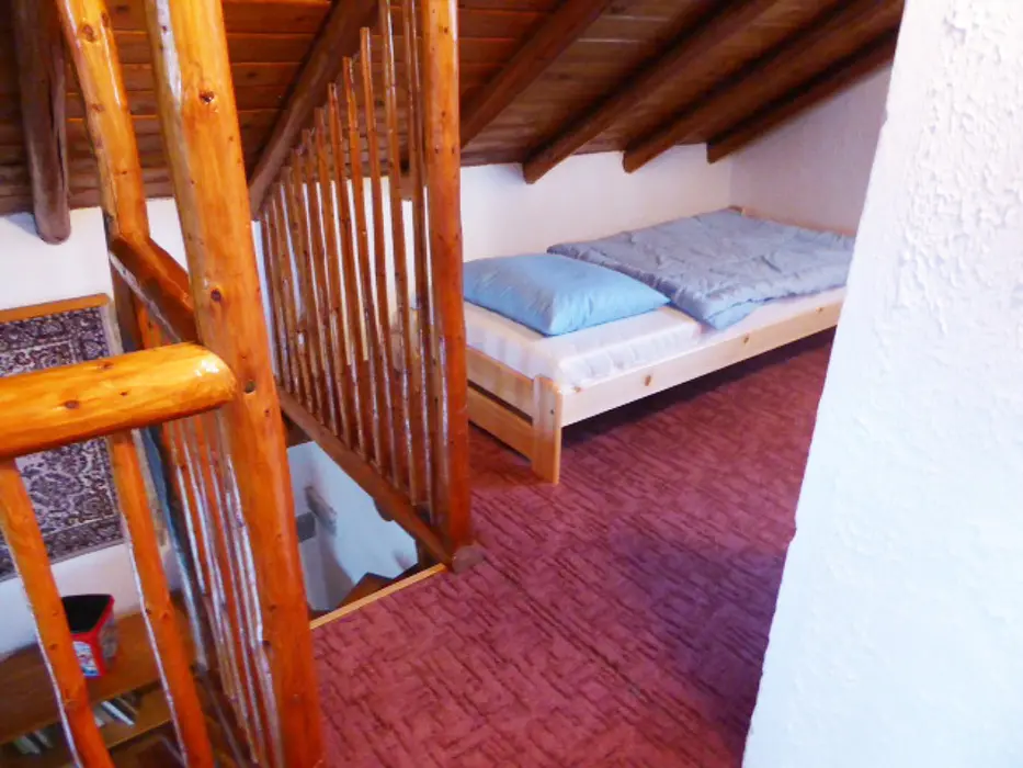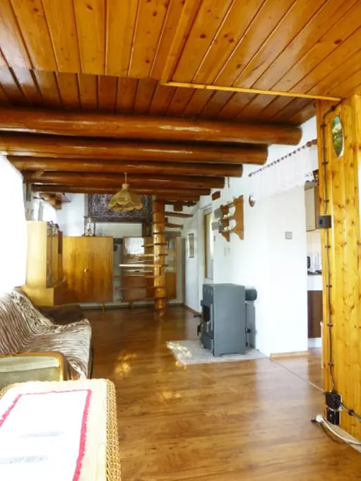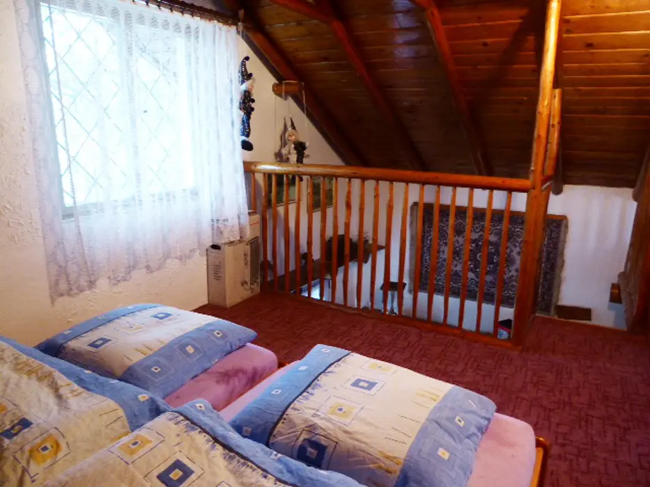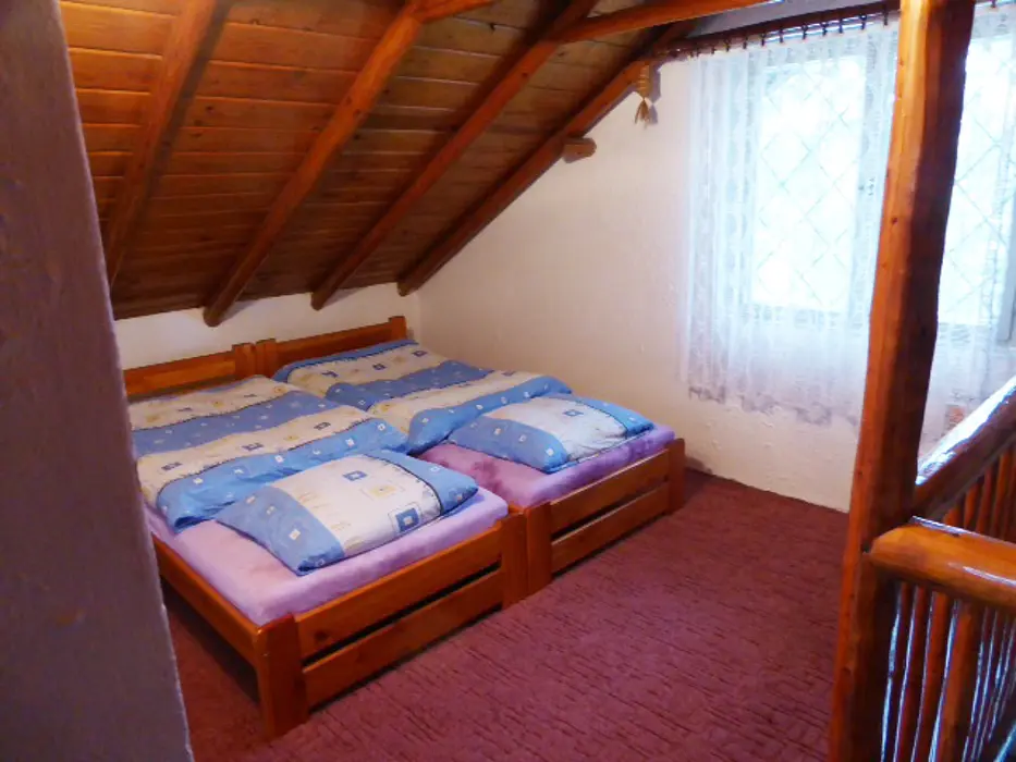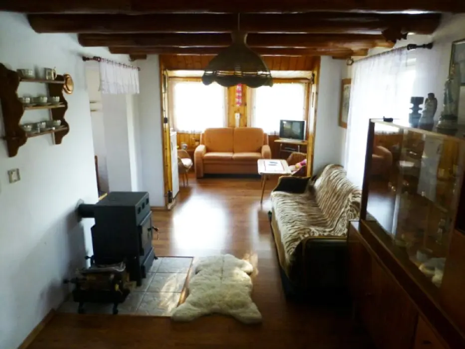 Obývací pokoj s posezením, TV, rádio, krb. Samostatná kuchyně - jídelní stůl a židle, pl. sporák, mikrovlnka, varná konvice, lednice 120 l s mrazícím boxem, nádobí. V patře - 2 ložnice - 1x3 lůžka - tyto jsou v otevřeném prostoru, 1x2 lůžka - uzavřená. Soc. zařízení - sprchový kout, umyvadlo, WC. Topení - el. přímotopy. V objektu je pouze užitková voda !!