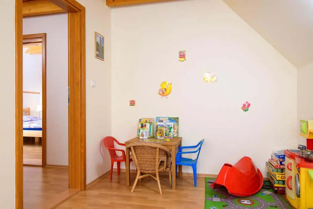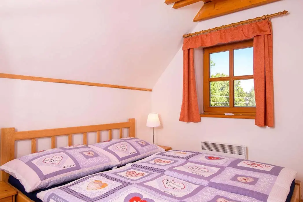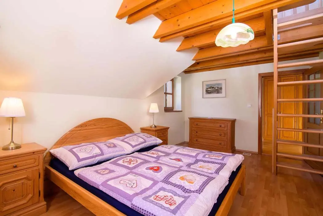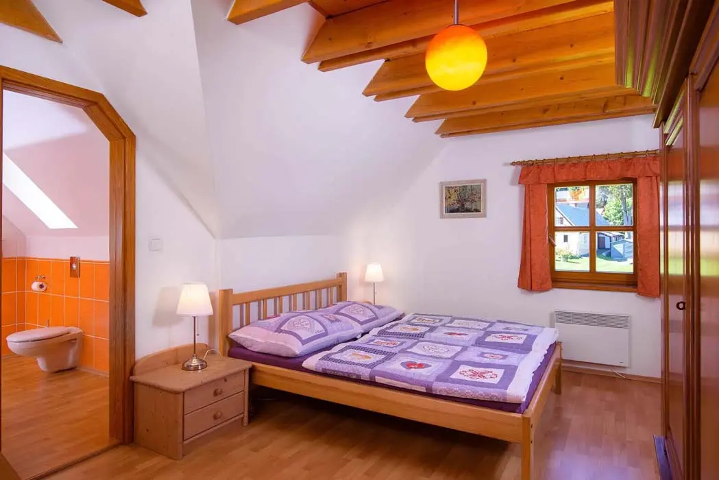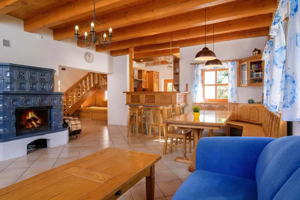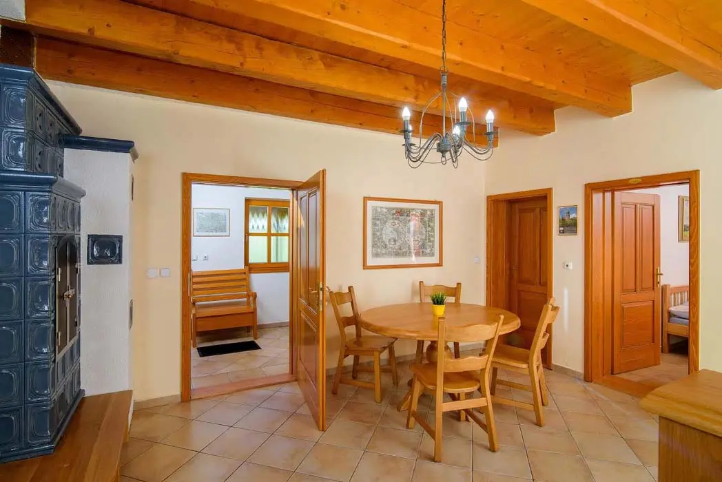 V přízemí prostorný obývací pokoj s posezením, sedací souprava, TV, satelit, jídelní stůl, kachlová kamna, navazuje kuchyně oddělená barem - plynový sporák + litinová grilovací deska, elektrická trouba, myčka, lednice s mrazákem, mikrovlnná trouba, bar s pípou. Celkem 4 ložnice - v přízemí pokoj Studnice 1x manželská postel, samostatné WC a masážní sprchový kout vedle pokoje. V patře 3x mezonetový apartmán - pro 4 - 6 osob. Pokoj Královka – 1x manželská postel, v podkroví další 4 lůžka, masážní vana pro 2 osoby, WC. Pokoj Slovanka – 1x manželská postel, v podkroví další 2 lůžka, v koupelně je masážní sprchový kout a WC. Pokoj Bramberk – 1x manželská postel a jedno lůžko v přízemí apt, jedno lůžko v podkroví, v koupelně je masážní sprchový kout a WC. V přízemí pod schodištěm se nachází útulný lůžkový prostor, který může sloužit jako 3 přistýlky. Topení - elektrické podlahové vytápění + elektrické přímotopy, kachlová kamna na dřevo v obývacím pokoji (dřevo k dispozici za poplatek). Další vybavení – audio přehrávač, satelit, centrální vysavač, dětská jídelní židlička, dětský koutek