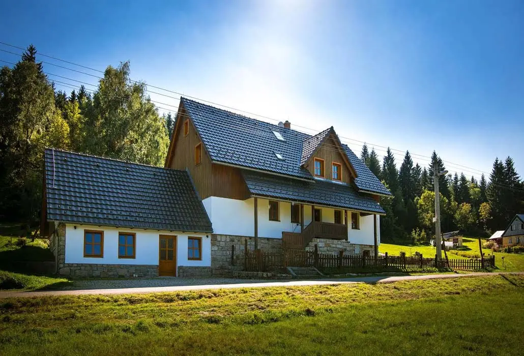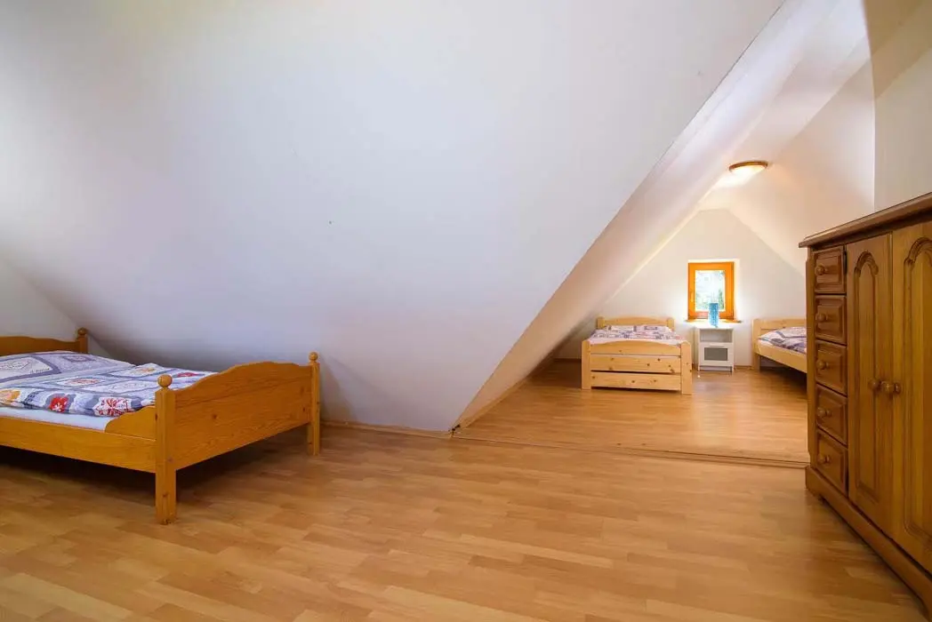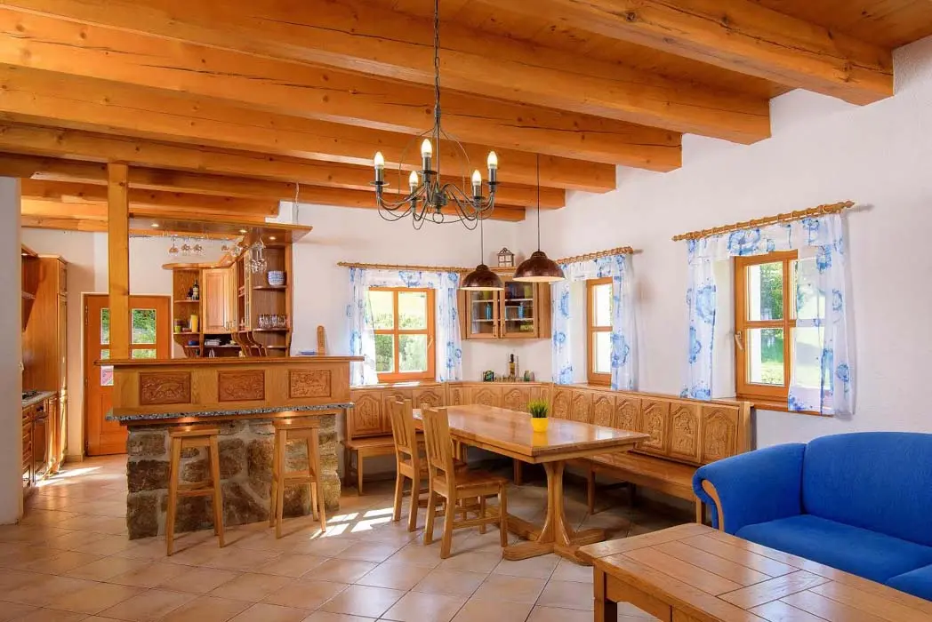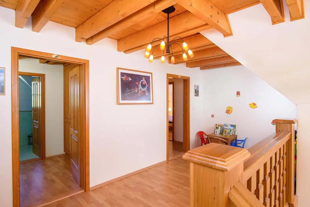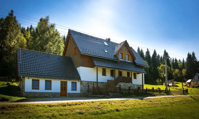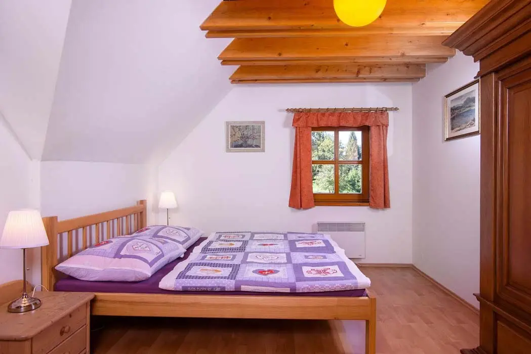 V přízemí prostorný obývací pokoj s posezením, sedací souprava, TV, satelit, jídelní stůl, kachlová kamna, navazuje kuchyně oddělená barem - plynový sporák + litinová grilovací deska, elektrická trouba, myčka, lednice s mrazákem, mikrovlnná trouba, bar s pípou. Celkem 4 ložnice - v přízemí pokoj Studnice 1x manželská postel, samostatné WC a masážní sprchový kout vedle pokoje. V patře 3x mezonetový apartmán - pro 4 - 6 osob. Pokoj Královka – 1x manželská postel, v podkroví další 4 lůžka, masážní vana pro 2 osoby, WC. Pokoj Slovanka – 1x manželská postel, v podkroví další 2 lůžka, v koupelně je masážní sprchový kout a WC. Pokoj Bramberk – 1x manželská postel a jedno lůžko v přízemí apt, jedno lůžko v podkroví, v koupelně je masážní sprchový kout a WC. V přízemí pod schodištěm se nachází útulný lůžkový prostor, který může sloužit jako 3 přistýlky. Topení - elektrické podlahové vytápění + elektrické přímotopy, kachlová kamna na dřevo v obývacím pokoji (dřevo k dispozici za poplatek). Další vybavení – audio přehrávač, satelit, centrální vysavač, dětská jídelní židlička, dětský koutek