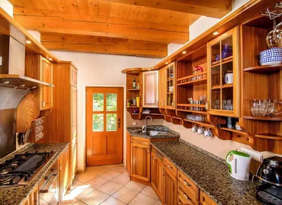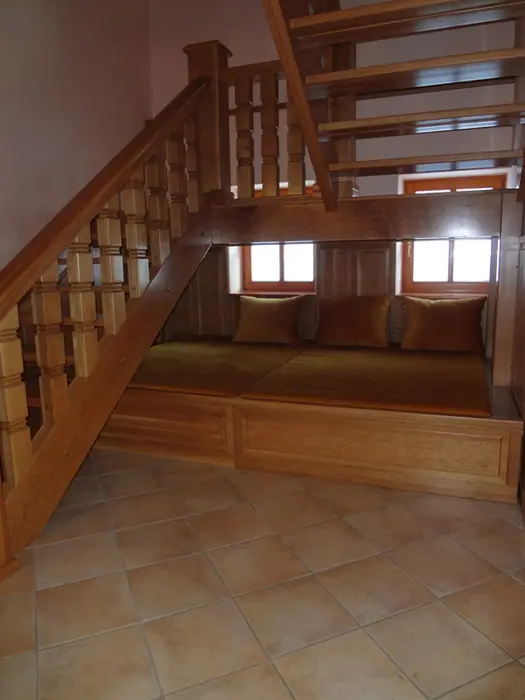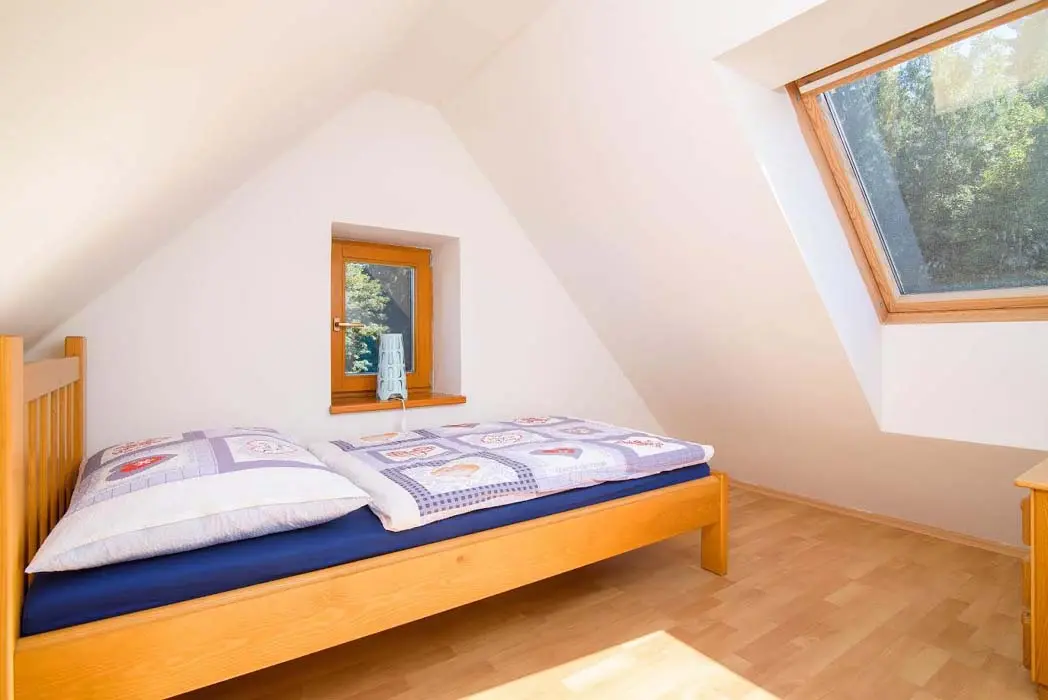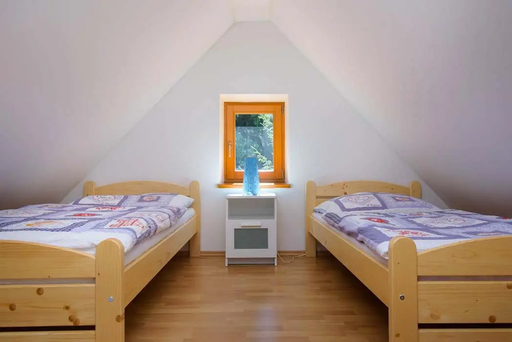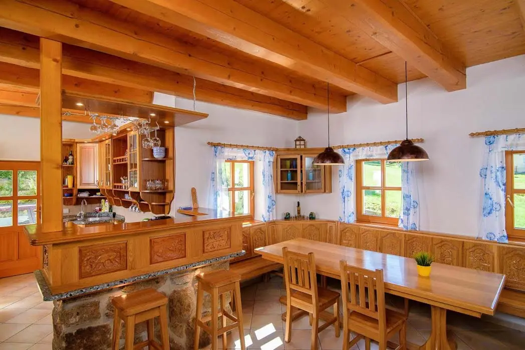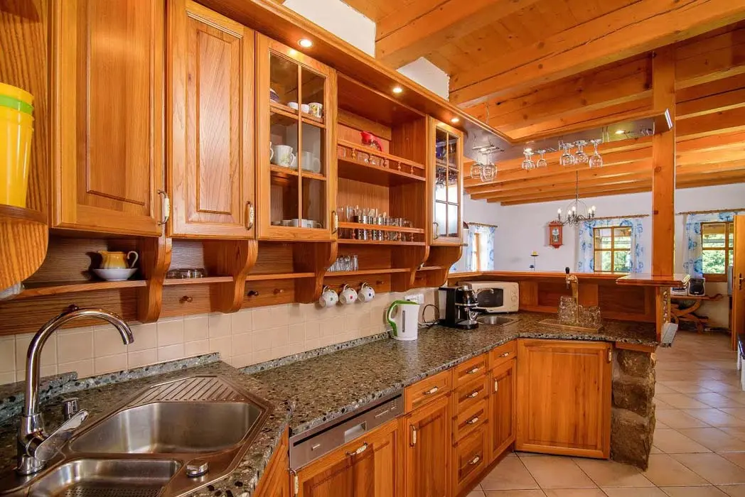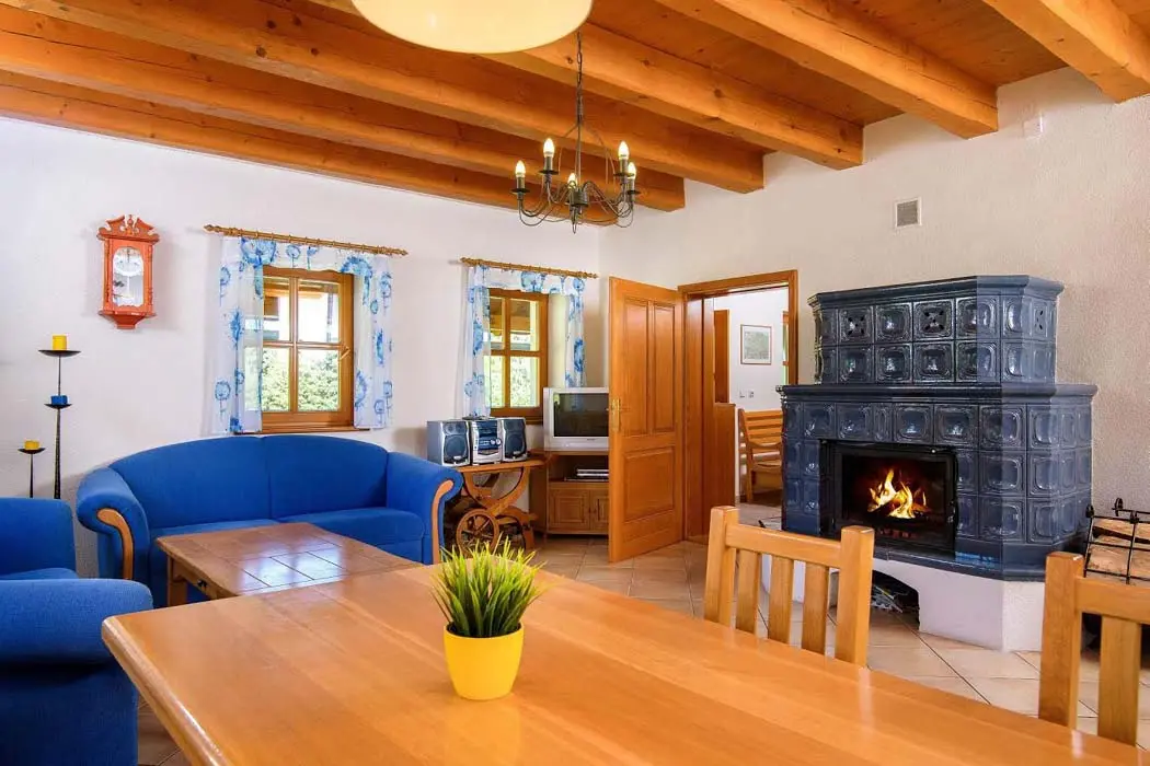 V přízemí prostorný obývací pokoj s posezením, sedací souprava, TV, satelit, jídelní stůl, kachlová kamna, navazuje kuchyně oddělená barem - plynový sporák + litinová grilovací deska, elektrická trouba, myčka, lednice s mrazákem, mikrovlnná trouba, bar s pípou. Celkem 4 ložnice - v přízemí pokoj Studnice 1x manželská postel, samostatné WC a masážní sprchový kout vedle pokoje. V patře 3x mezonetový apartmán - pro 4 - 6 osob. Pokoj Královka – 1x manželská postel, v podkroví další 4 lůžka, masážní vana pro 2 osoby, WC. Pokoj Slovanka – 1x manželská postel, v podkroví další 2 lůžka, v koupelně je masážní sprchový kout a WC. Pokoj Bramberk – 1x manželská postel a jedno lůžko v přízemí apt, jedno lůžko v podkroví, v koupelně je masážní sprchový kout a WC. V přízemí pod schodištěm se nachází útulný lůžkový prostor, který může sloužit jako 3 přistýlky. Topení - elektrické podlahové vytápění + elektrické přímotopy, kachlová kamna na dřevo v obývacím pokoji (dřevo k dispozici za poplatek). Další vybavení – audio přehrávač, satelit, centrální vysavač, dětská jídelní židlička, dětský koutek