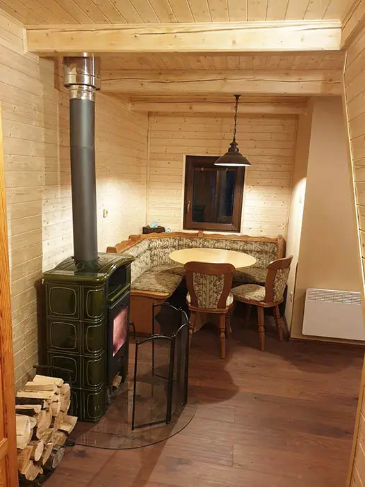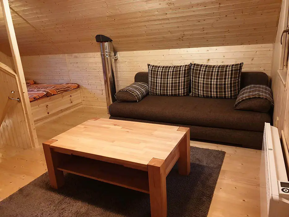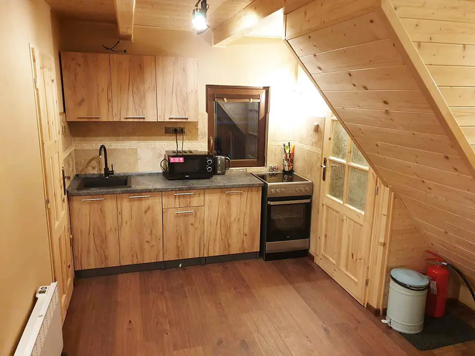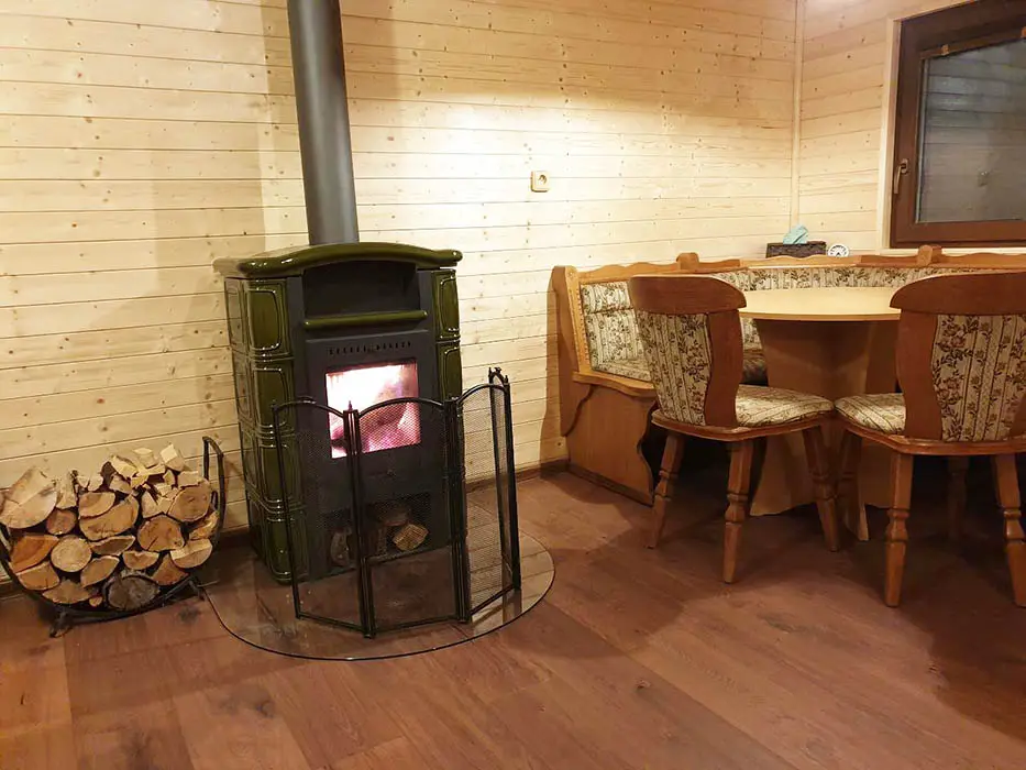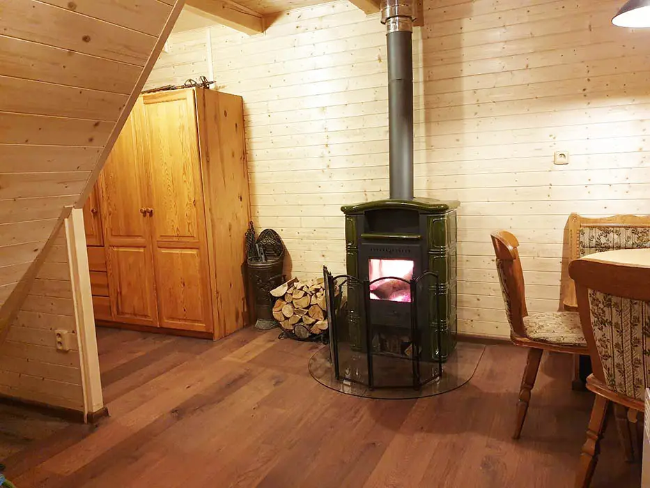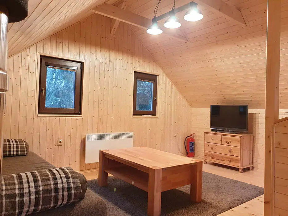 V přízemí - obytná část spojená s kuchyní - rohová lavice se stolem, TV, krbová kamna, vybavení kuchyně - el. sporák s troubou, mikrovlnka, varná konvice, stolní gril, lednice s mrazákem, nádobí. V patře ( vedou příkré schody ) - 1 ložnice - 4 lůžka + 2 přistýlky. Soc. zařízení - sprchový kout, umyvadlo, WC. Topení - tuhá paliva, el. přímotopy