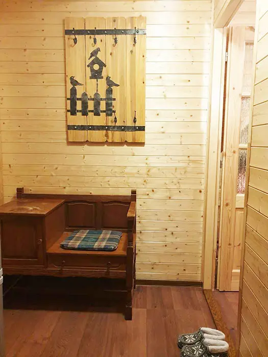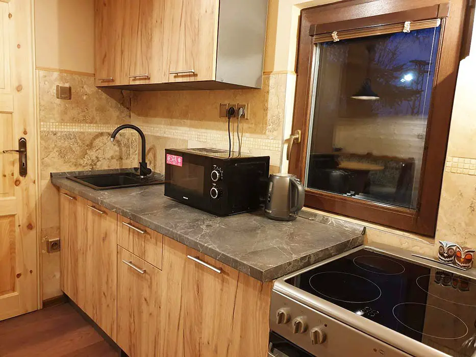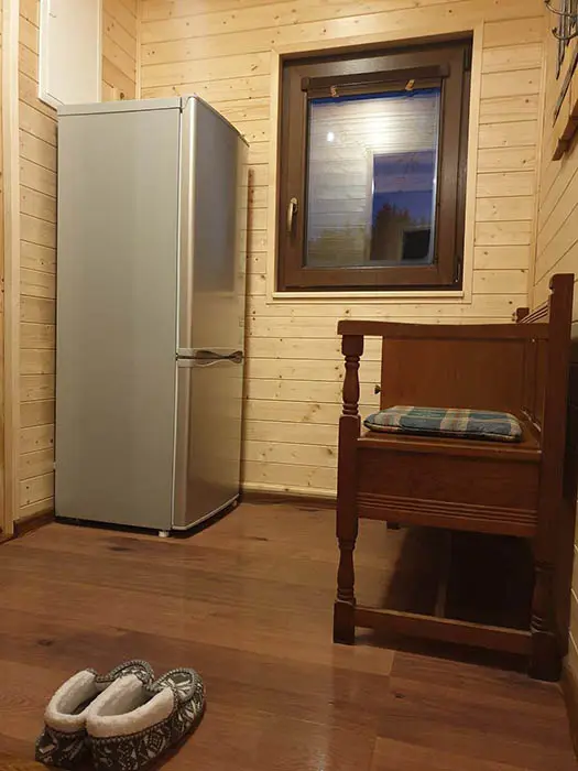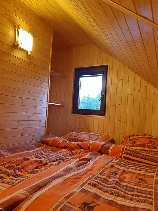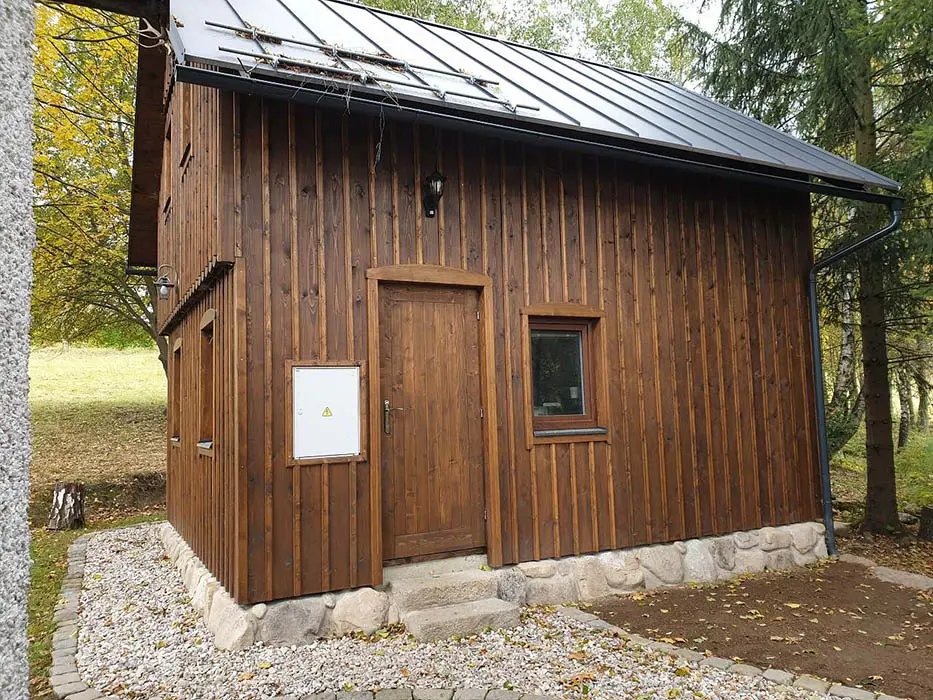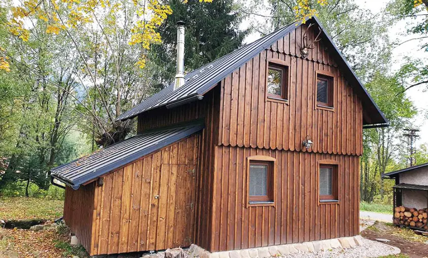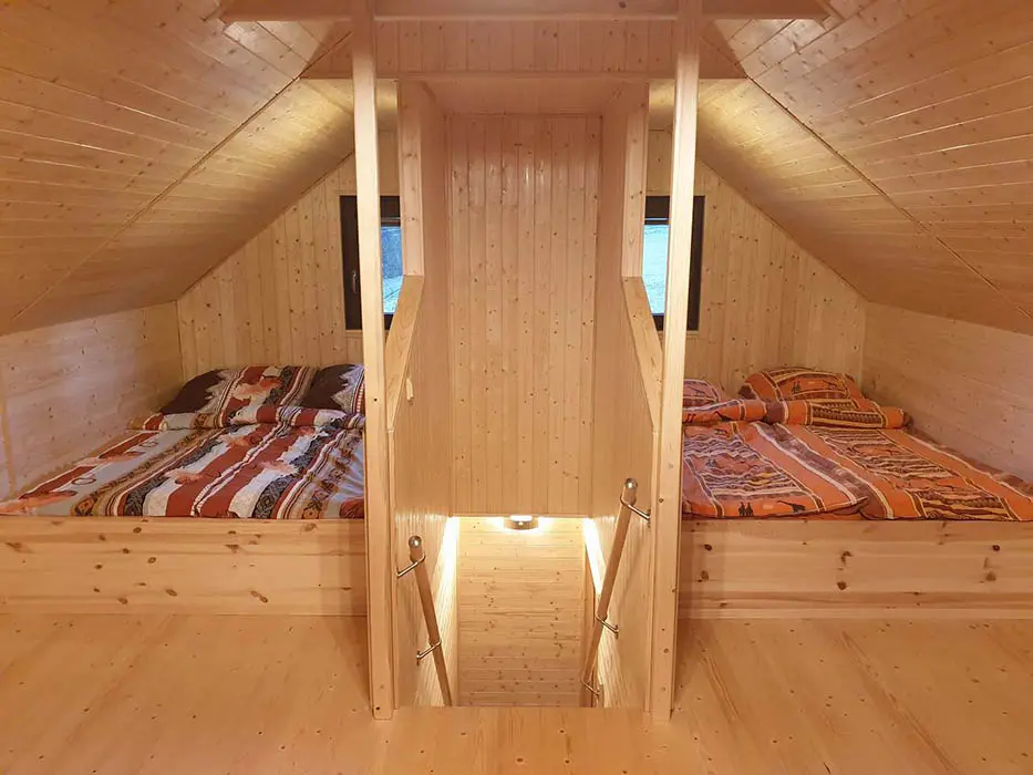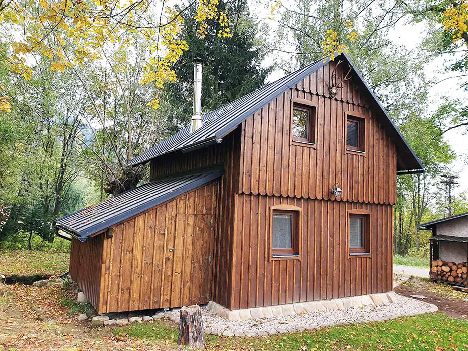 V přízemí - obytná část spojená s kuchyní - rohová lavice se stolem, TV, krbová kamna, vybavení kuchyně - el. sporák s troubou, mikrovlnka, varná konvice, stolní gril, lednice s mrazákem, nádobí. V patře ( vedou příkré schody ) - 1 ložnice - 4 lůžka + 2 přistýlky. Soc. zařízení - sprchový kout, umyvadlo, WC. Topení - tuhá paliva, el. přímotopy