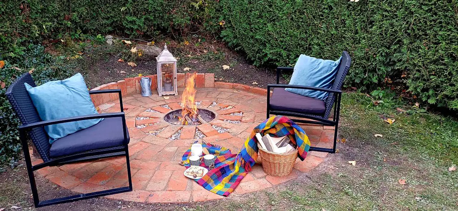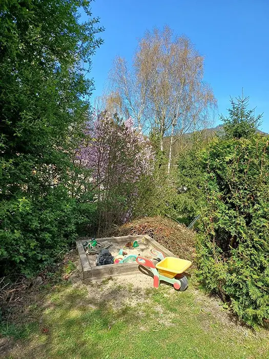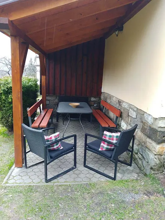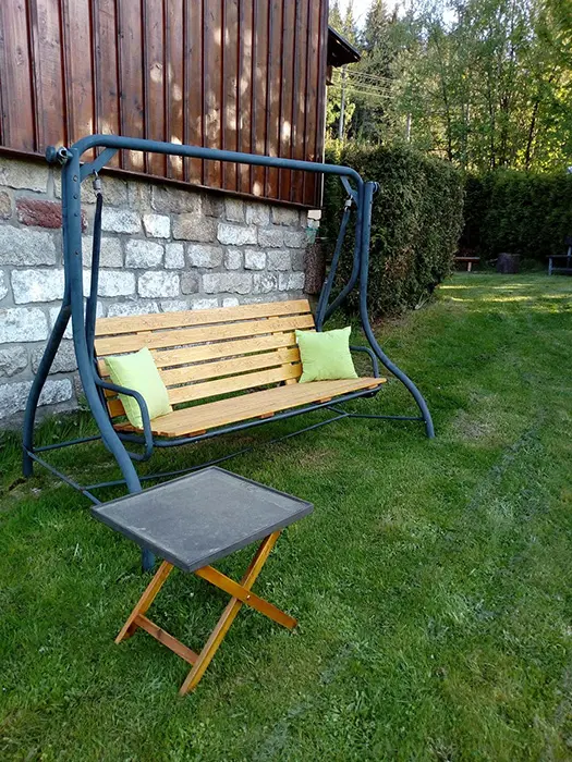 Na neoplocené zahradě ohniště s posezením z pařezů, lavičky, gril, zahradní nábytek, hračky pro děti, velká vytápěná veranda