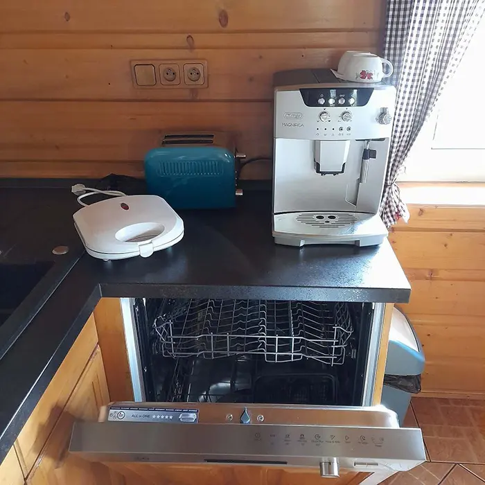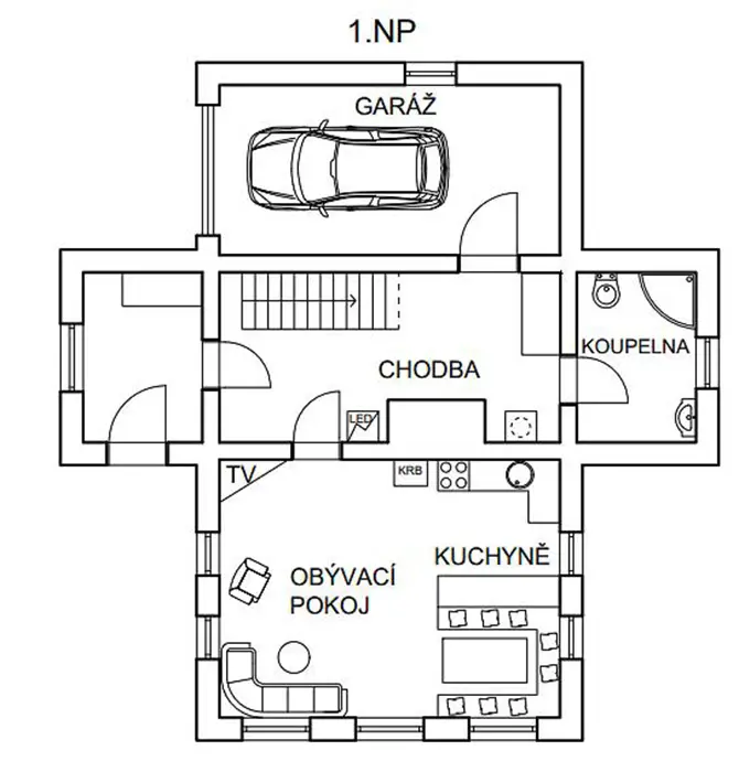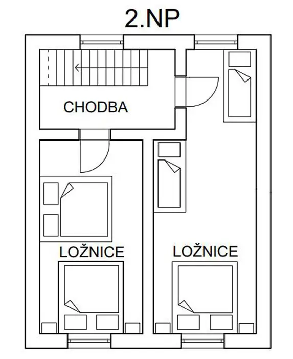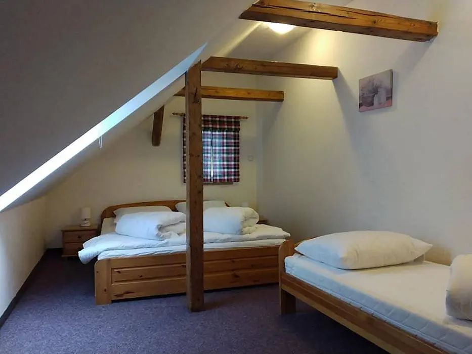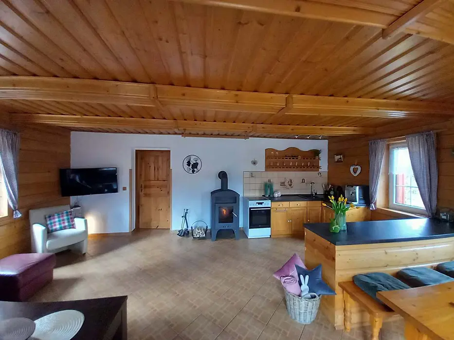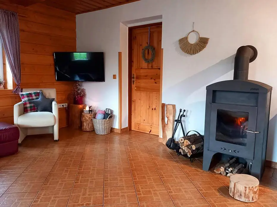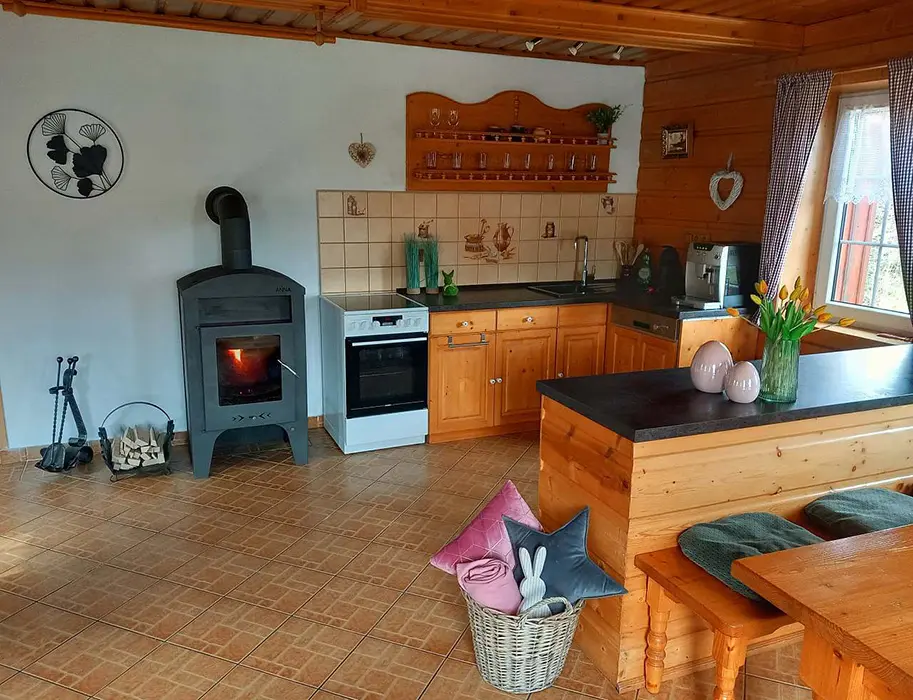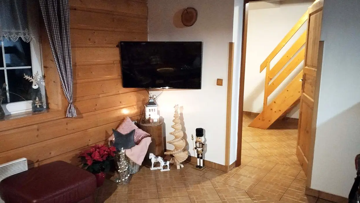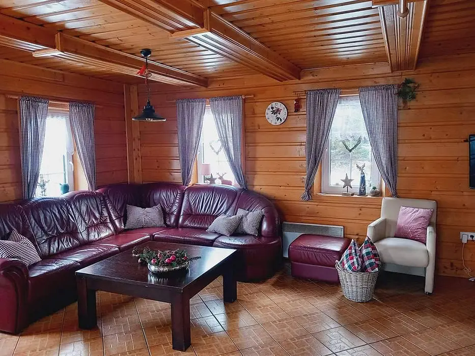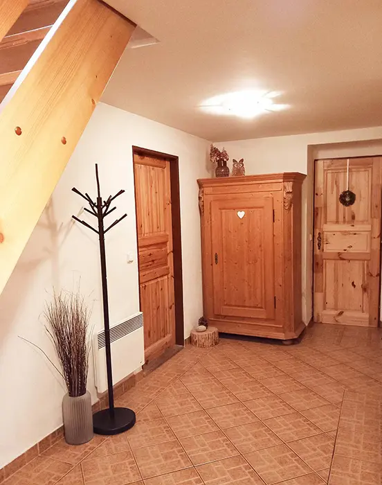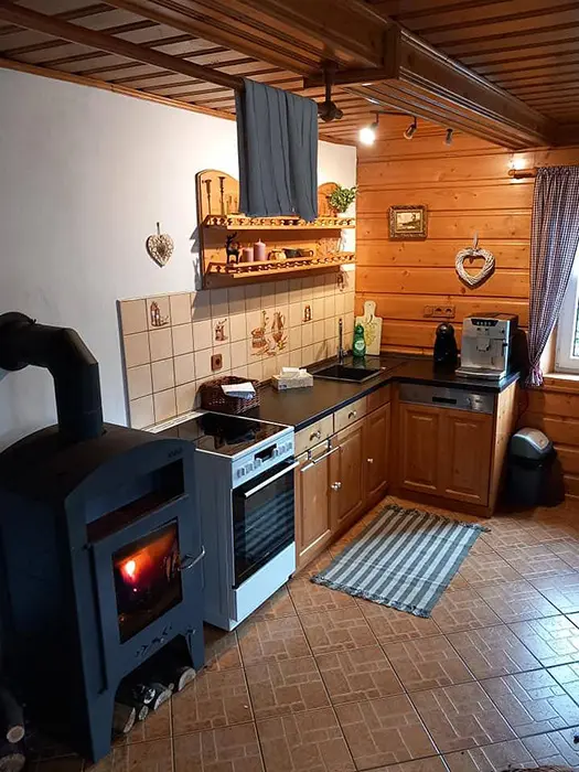 V přízemí prostorná velká obytná část spojená s kuchyní - masivní stůl a židle, rohová kožená sedací souprava, LCDTV, SAT, DVD, krbová kamna, vybavení kuchyně - el. sporák se sklokeramickou varnou deskou, mikrovlnka, lednice, myčka, varná konvice, kávovar, toustovač, topinkovač, základní nádobí. V patře 2 ložnice - 2x4 lůžka. Soc. zařízení - koupelna se sprchovým koutem, umyvadlo, WC v koupelně. Topení - el. přímotopy, krbová kamna, v koupelně podlahové topení
