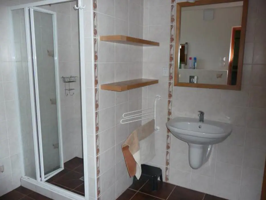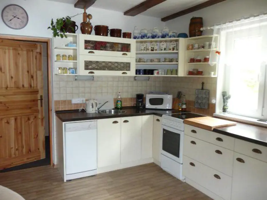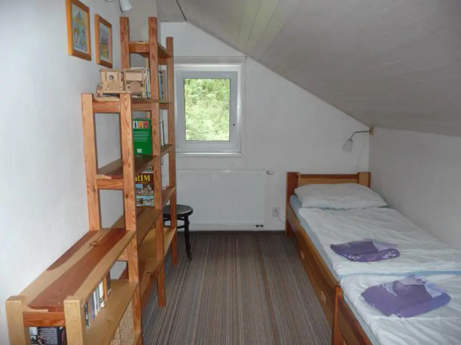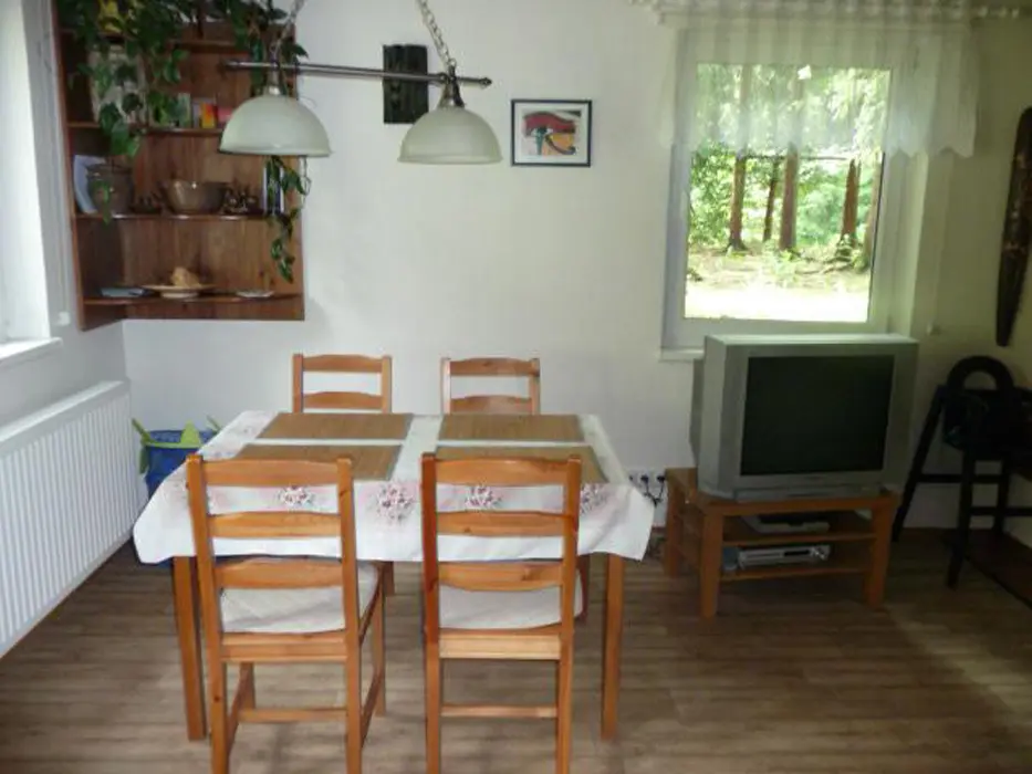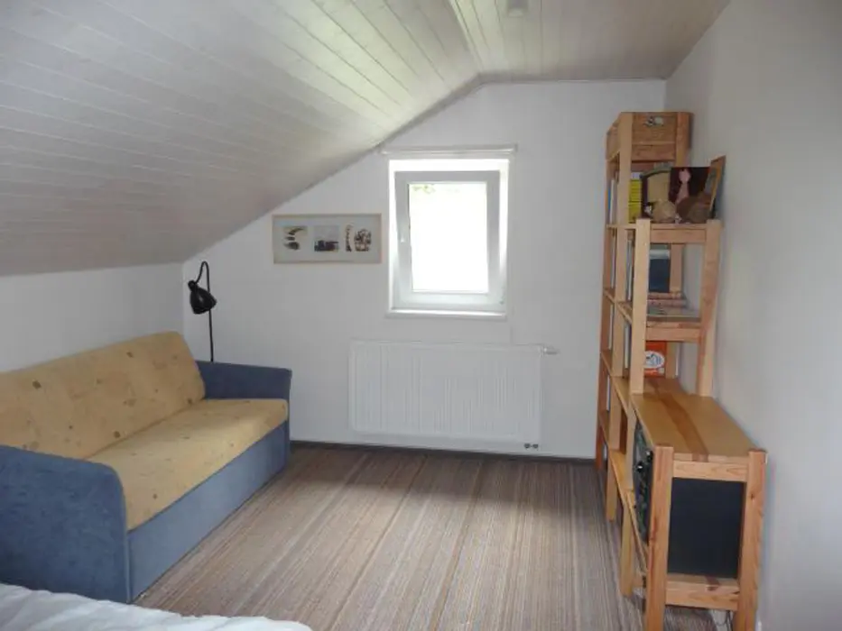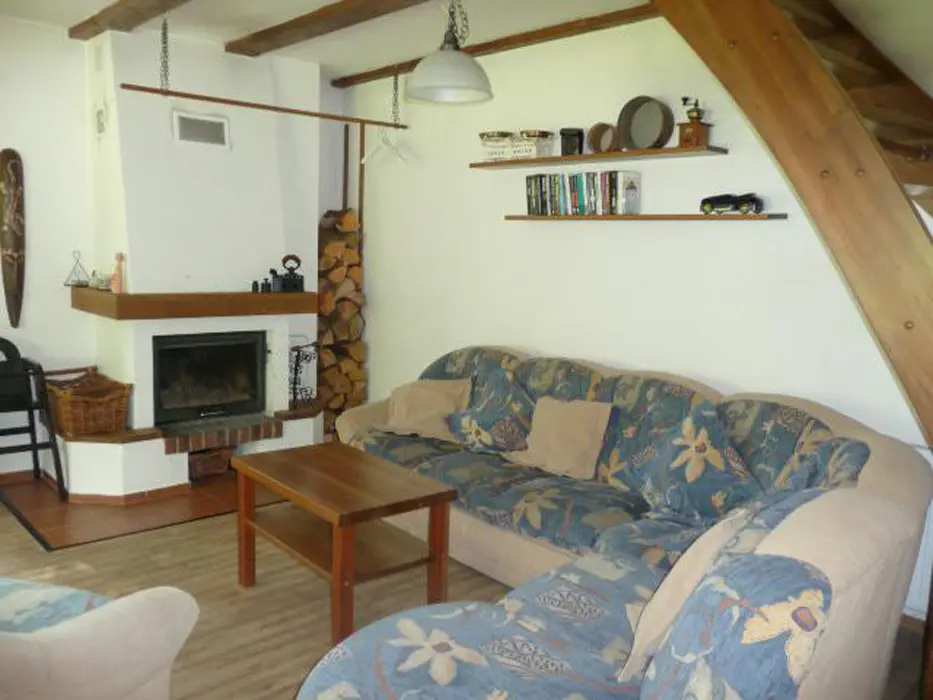 Obývací pokoj - spojený s kuchyní, krb, rozkládací sedačka, TV, jídelní stůl. 2 ložnice v patře - 1x5 (manželská postel + rozkládací gauč ), 1x2 lůžka. Sociální zařízení - koupelna se sprchovým koutem, WC. Topení - elektřina, krb.