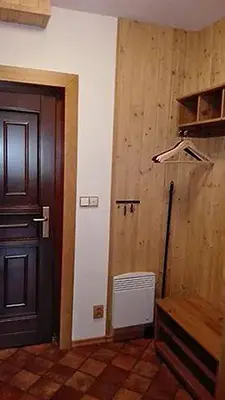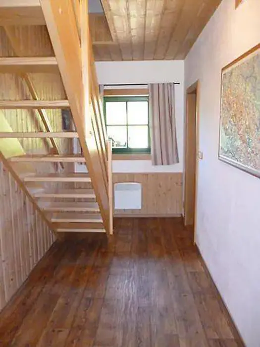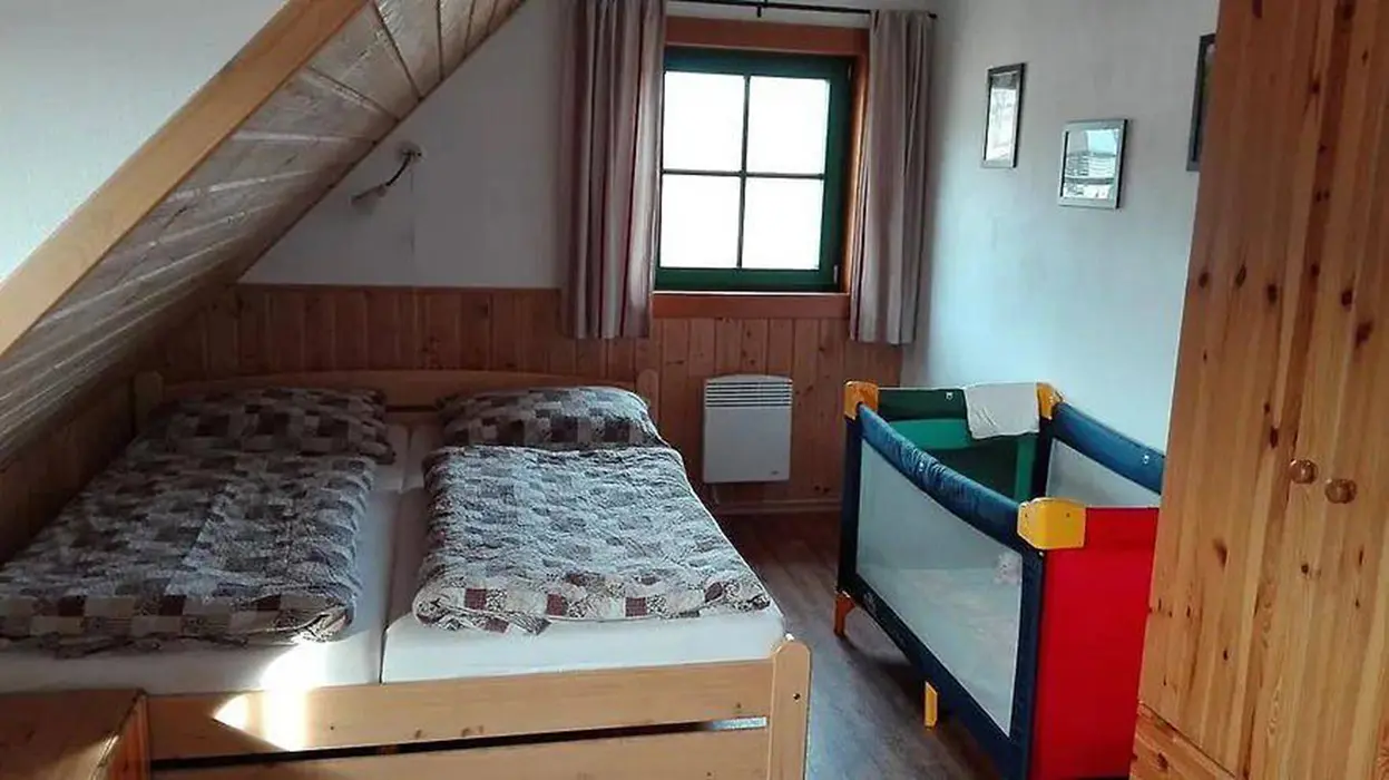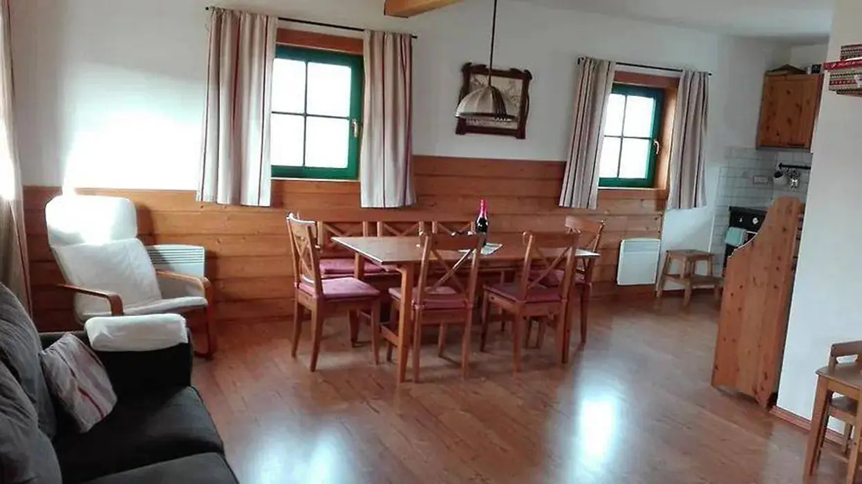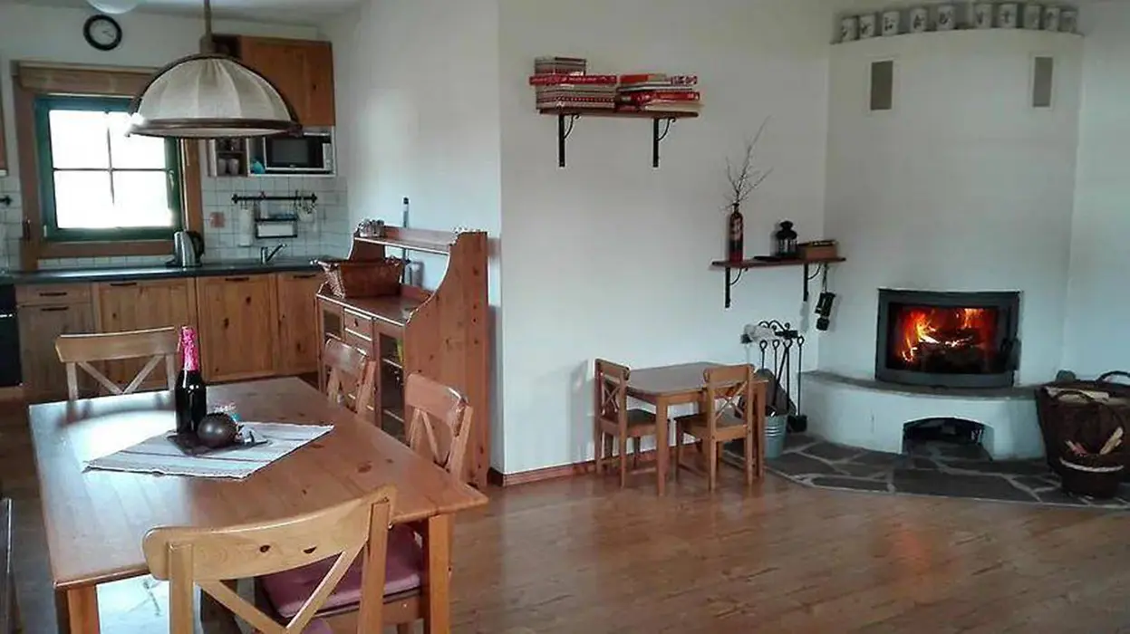 Obývací část s posezením, jídelní stůl, SAT-TV, krb, spojená s kuchyní - myčka nádobí, lednice s mrazákem, elektrická trouba, sklokeramická varná deska, mikrovlnná trouba, varná konvice, nádobí, utěrky, mycí prostředky. Pro děti - hrací koutek, stoleček s židličkami, plastové nádobí pro děti. V patře 2 ložnice 2x3 lůžka s úložným prostorem. Sociální zařízení - sprchový kout, ručníky, osušky, 2x WC, topný žebřík. Topení - krb + el. přímotopy