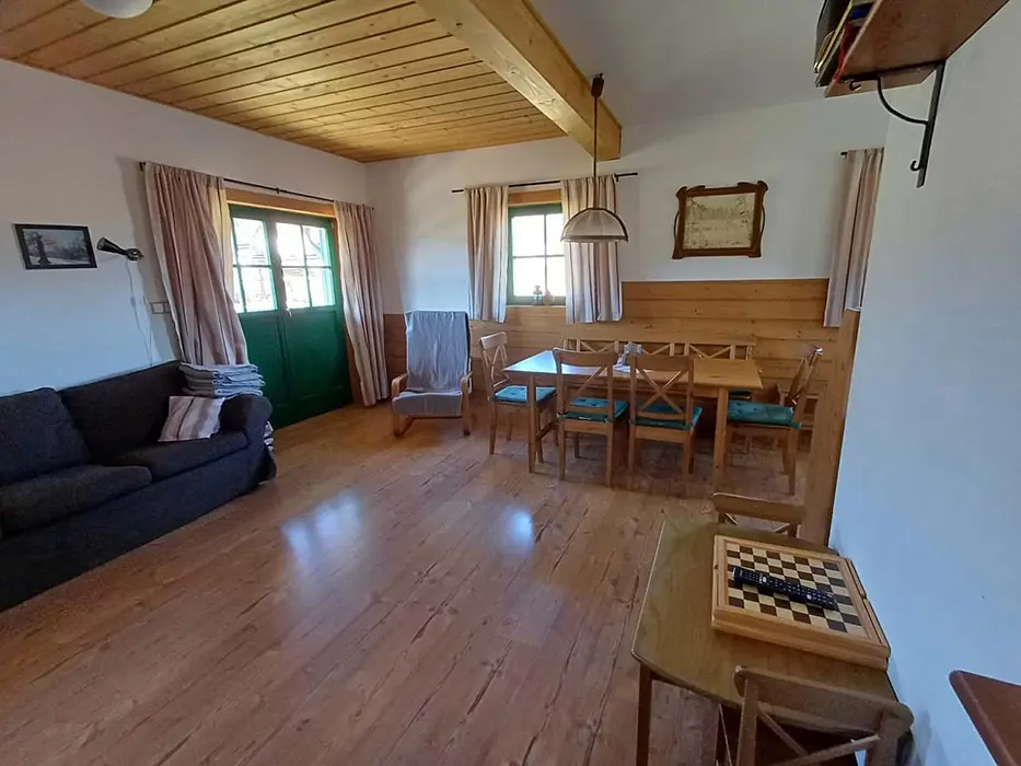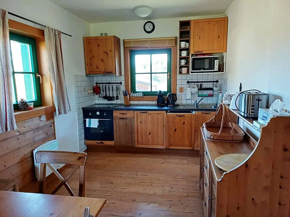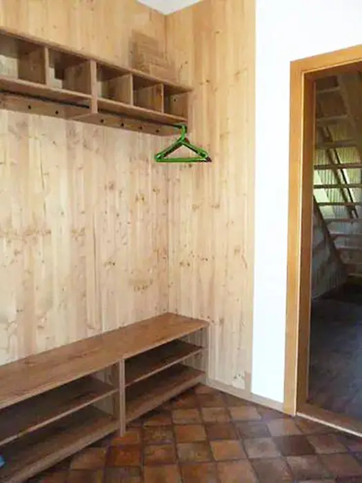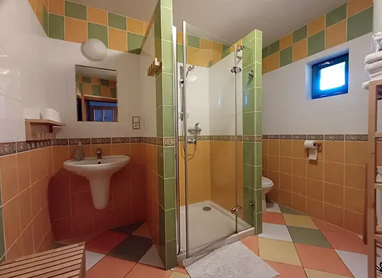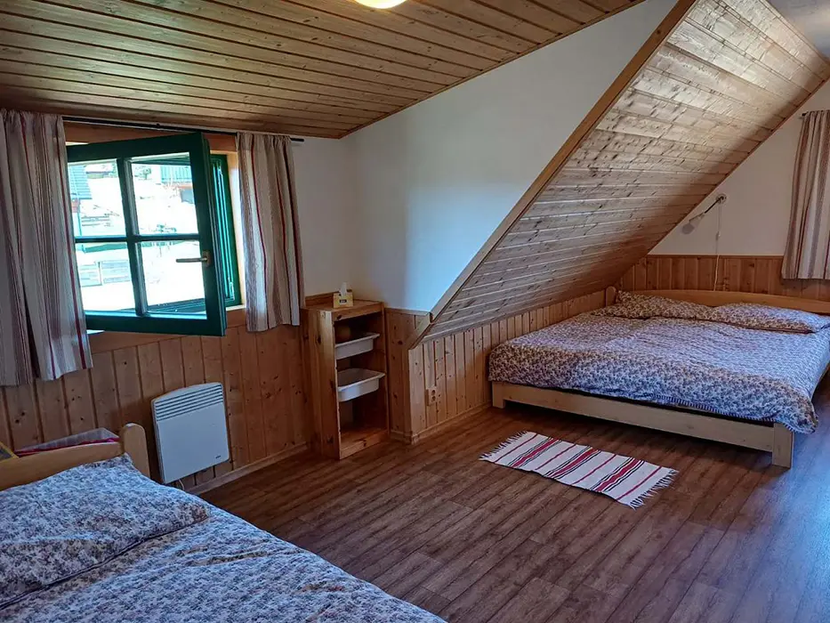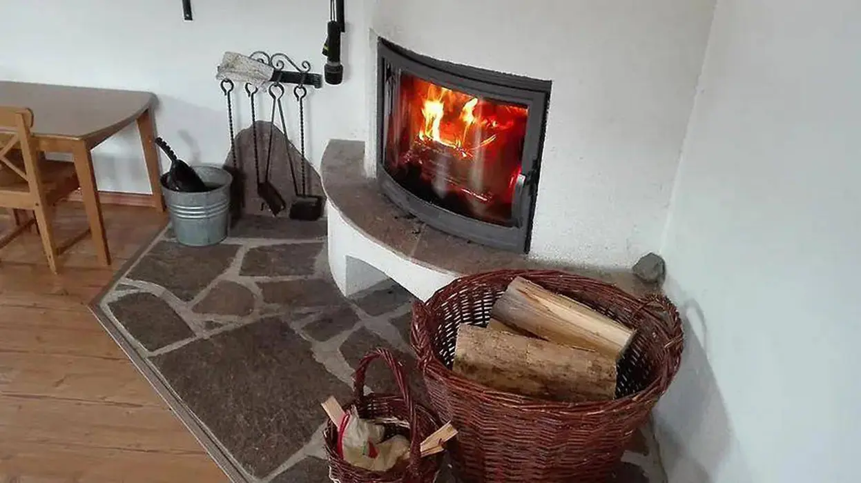 Obývací část s posezením, jídelní stůl, SAT-TV, krb, spojená s kuchyní - myčka nádobí, lednice s mrazákem, elektrická trouba, sklokeramická varná deska, mikrovlnná trouba, varná konvice, nádobí, utěrky, mycí prostředky. Pro děti - hrací koutek, stoleček s židličkami, plastové nádobí pro děti. V patře 2 ložnice 2x3 lůžka s úložným prostorem. Sociální zařízení - sprchový kout, ručníky, osušky, 2x WC, topný žebřík. Topení - krb + el. přímotopy