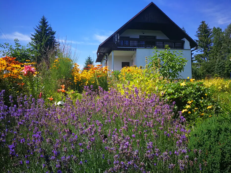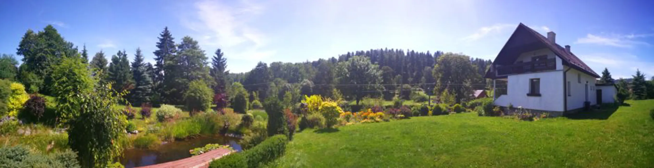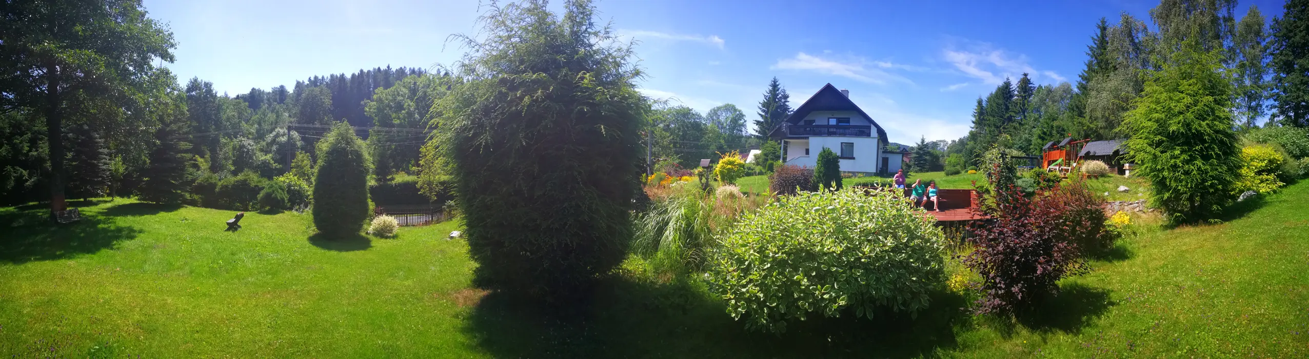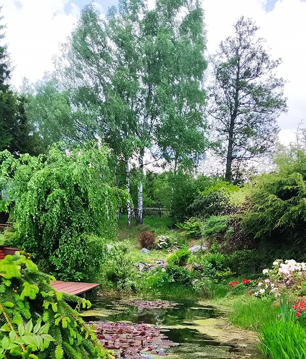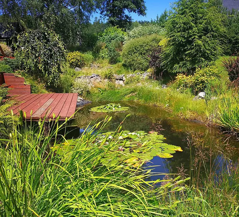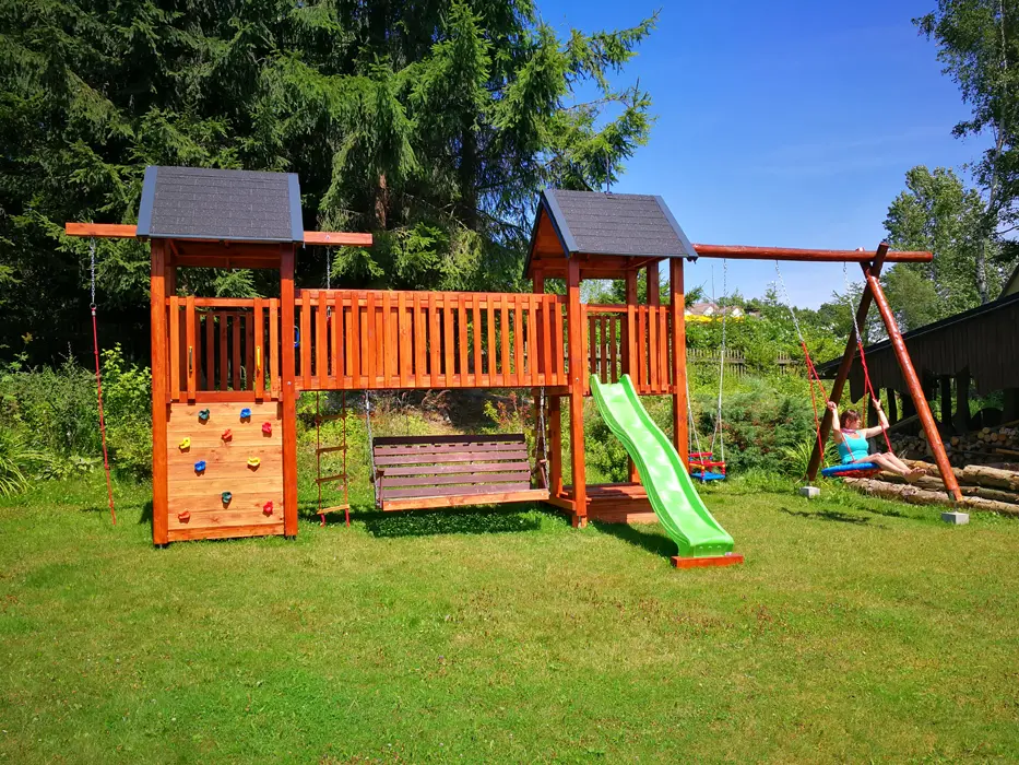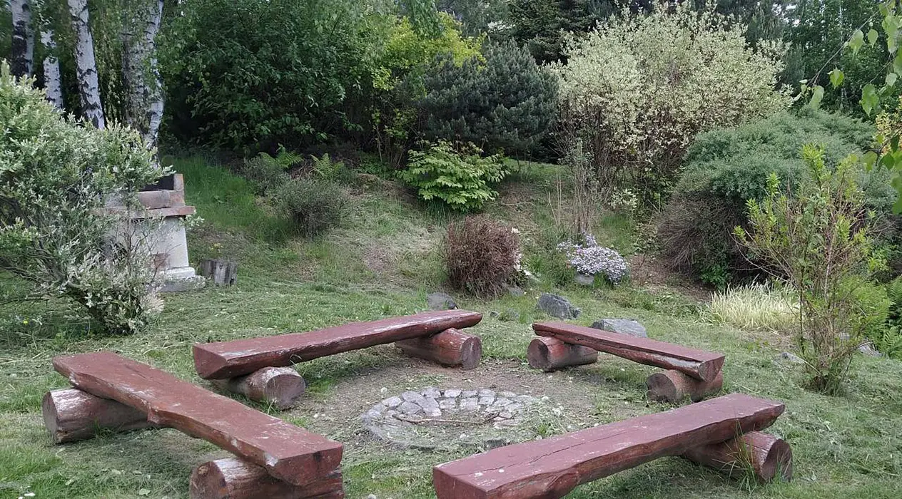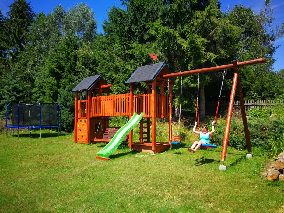 Zahrada s jezírkem a možností posezení, prolézačky, trampolína, kryté posezení, krb na grilování, ohniště