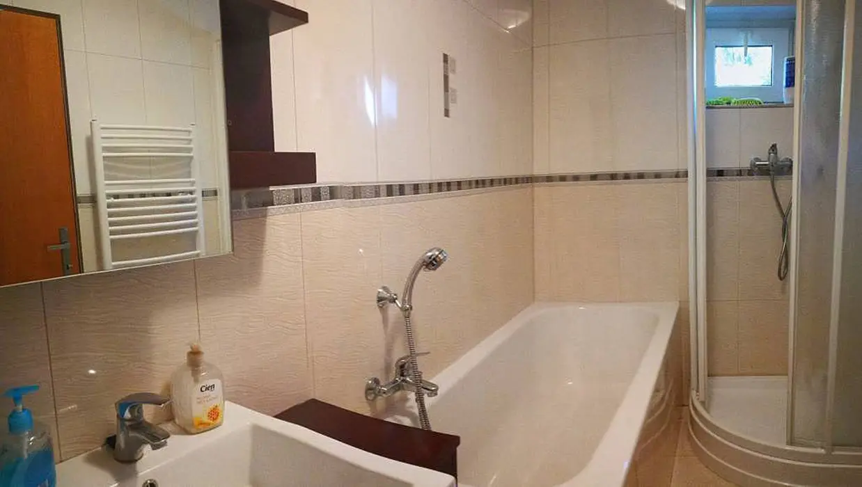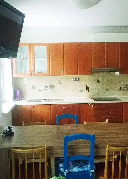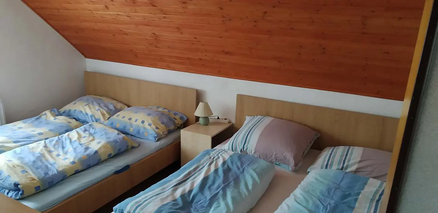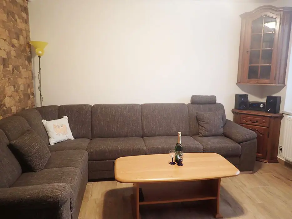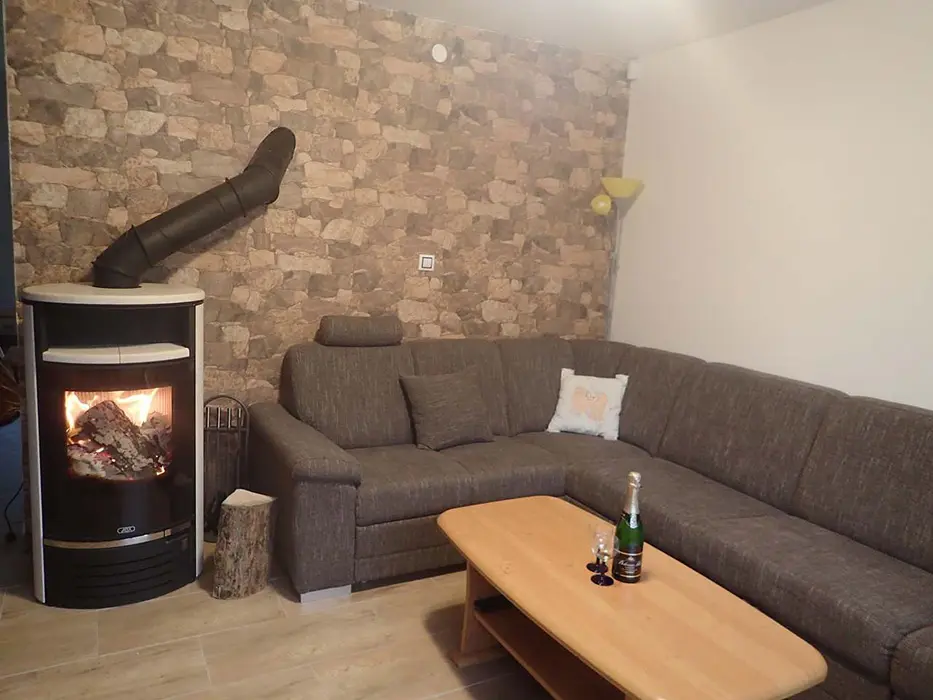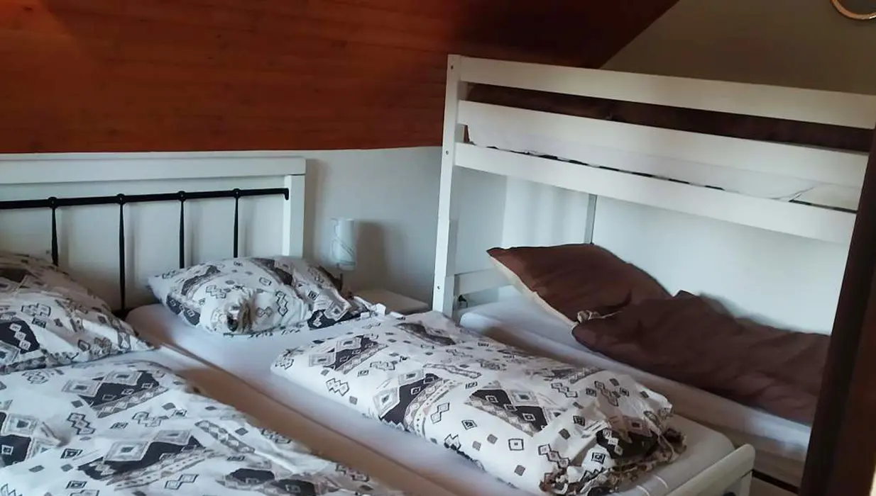 Obývací pokoj s posezením, sedací souprava, TV. Kuchyně - lednice, elektrická varná deska, trouba, mikrovlnná trouba, dostatek veškerého nádobí, myčka, rychlovarná konvice. 3 ložnice - 1x4, 1x4 ( manž. postel + dětská palanda ), 1x3 lůžka. Sociální zařízení - koupelna se sprchovým koutem a vanou, samostatné WC. Topení - elektrokotel + krbová kamna