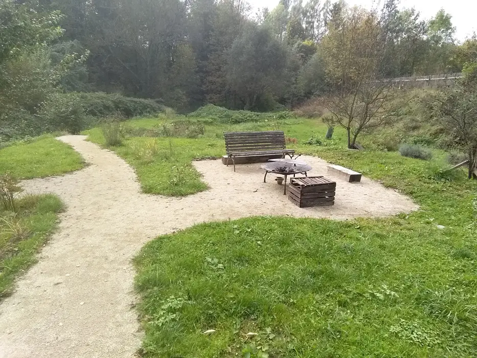 Velká zahrada, posezení u kamenného grilu, venkovního ohniště, přenosný gril