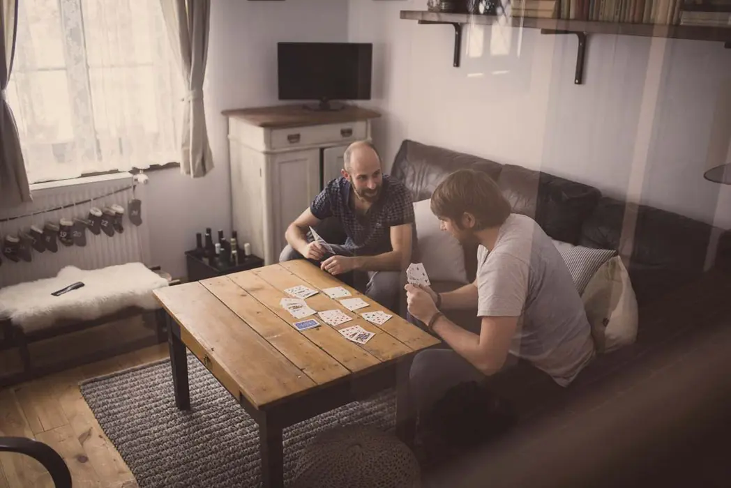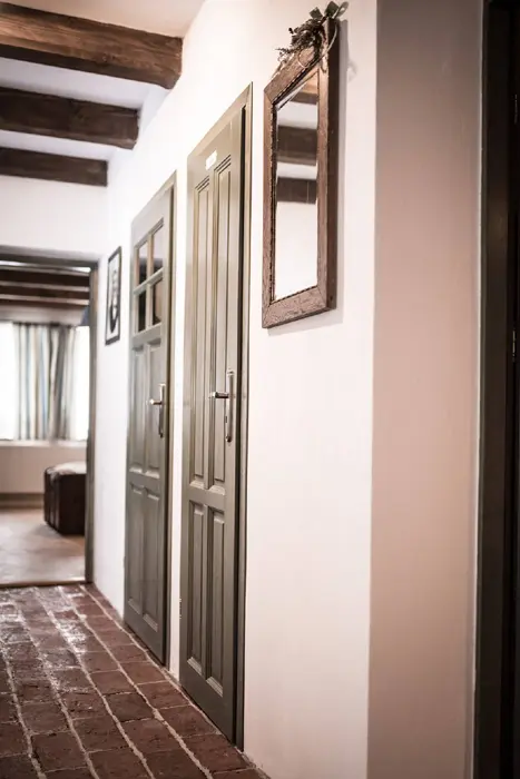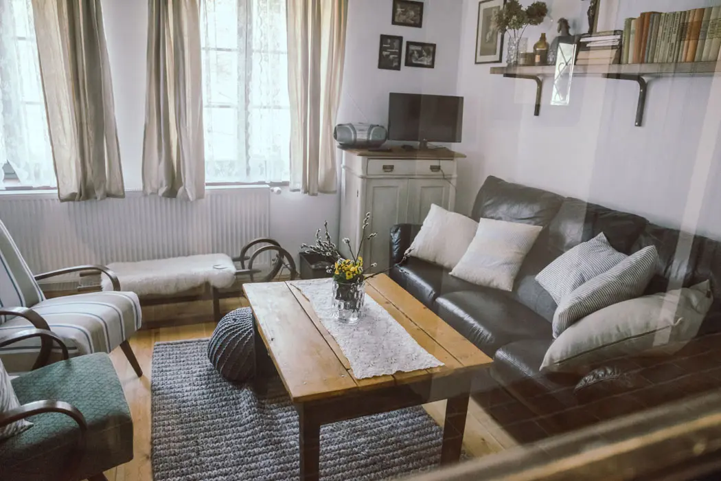Obývací pokoj spojený s kuchyní - posezení, krb, TV. Kuchyně - el. sporák a troubou, lednice s mrazákem, varná konvice, mikrovlnka, nádobí. 4 ložnice - v přízemí 1x3, v patře 1x2+2 přistýlky ( matrace na zemi ), 2x3+2 přistýlky ( matrace na zemi ), k dispozici dětská postýlka. Sociální zařízení - 2 koupelny (vana, sprchový kout), 2x WC, k dispozici pračka. Topení - v obývacím pokoji jsou krbová kamna s výměníkem, alternativa el. topení