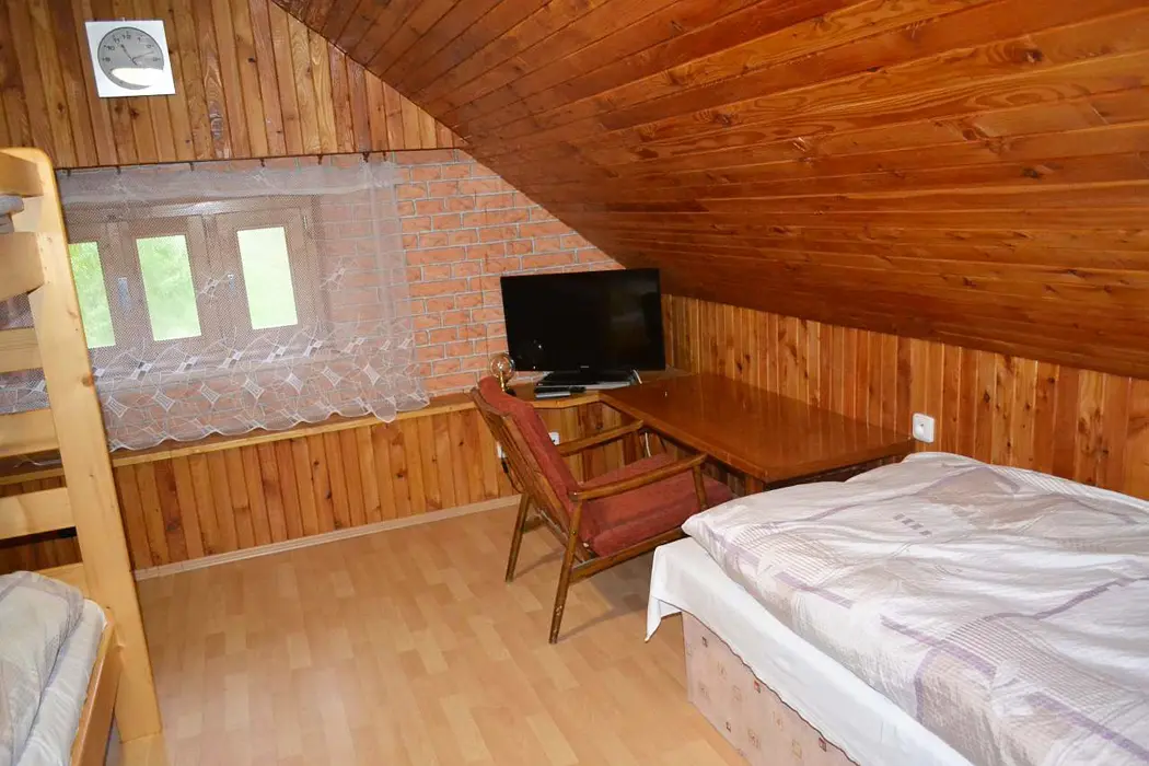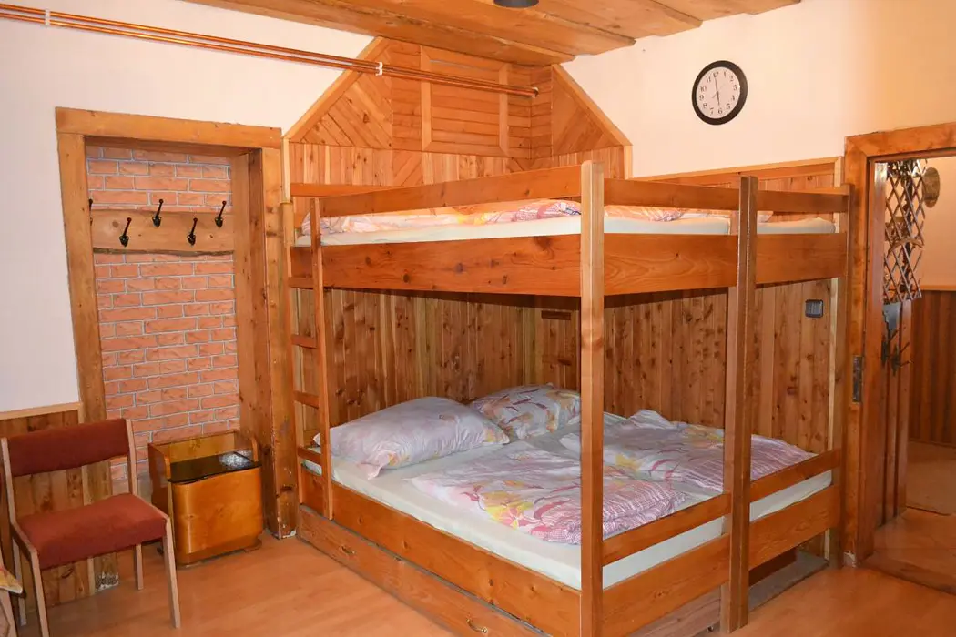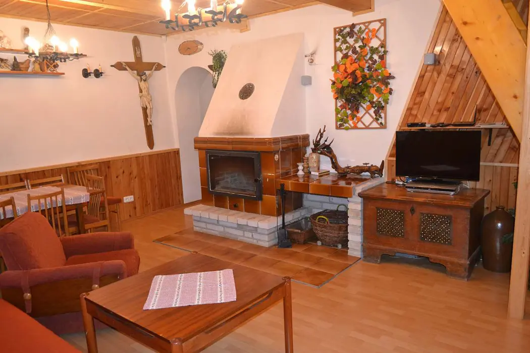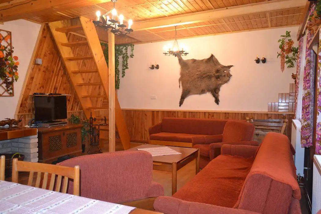 Společenská místnost - SAT, DVD, TV, WiFi, krb, společenské hry. Kuchyně - el.vařič, pečící trouba, mikrovlnná trouba, varná konvice, kamna, lednice, pračka. 3 ložnice - 2x4, 1x6 lůžek, dětská postýlka, kolébka, ve společenské místnosti 4 přistýlky. Sociální zařízení - koupelna s vanou, sprchový kout, WC, druhá koupelna - sprcha, WC, podlahové topení a pračka. Topení - podlahové.