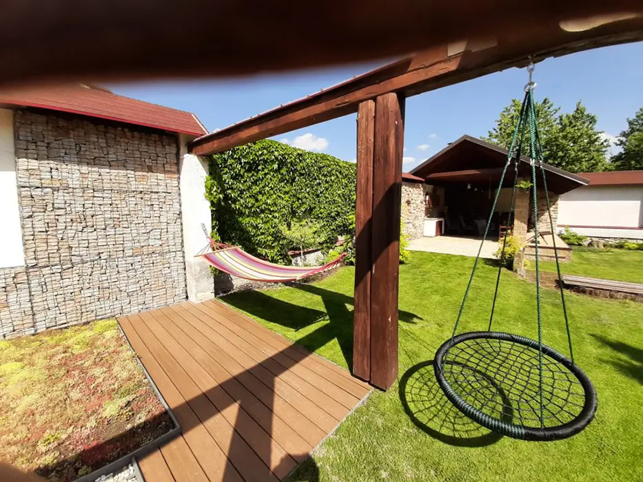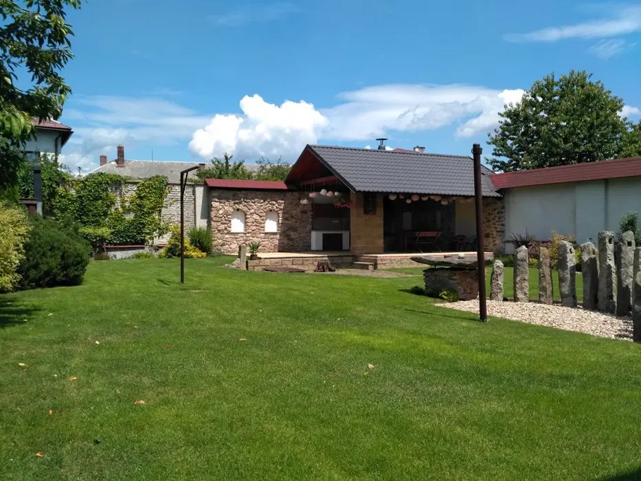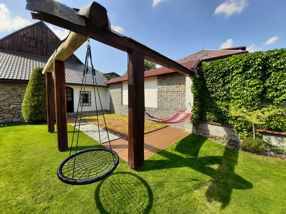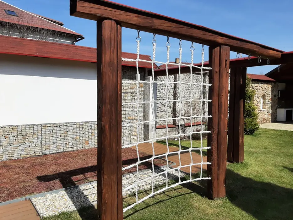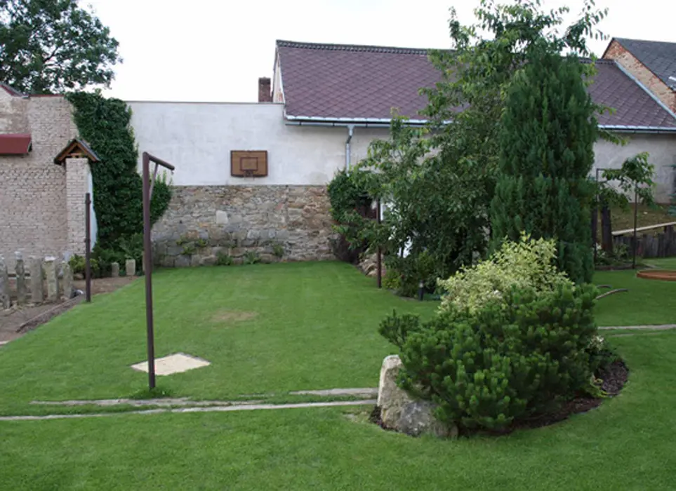 Na velkém uzavřeném dvoře (800 m2) venkovní krb s posezením, stolní tenis, dráha na minigolf, hřiště se sítí, petanque, koš na basketbal, ruské kuželky, dětské pískoviště, crocket, stolní fotbal, dětská houpačka