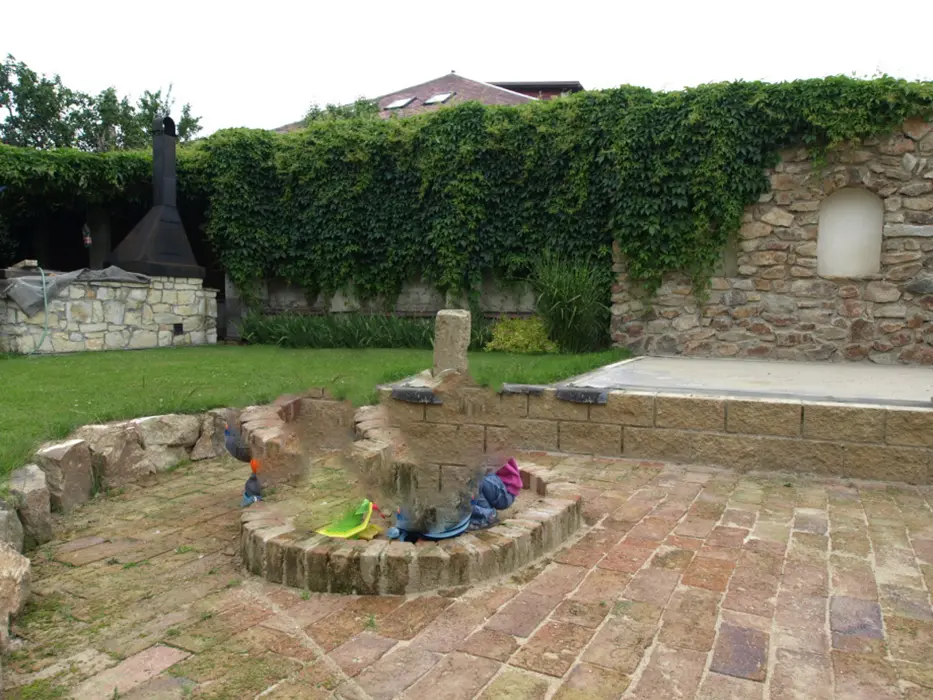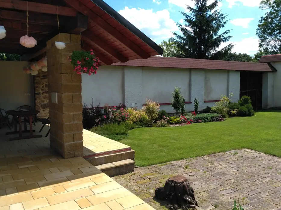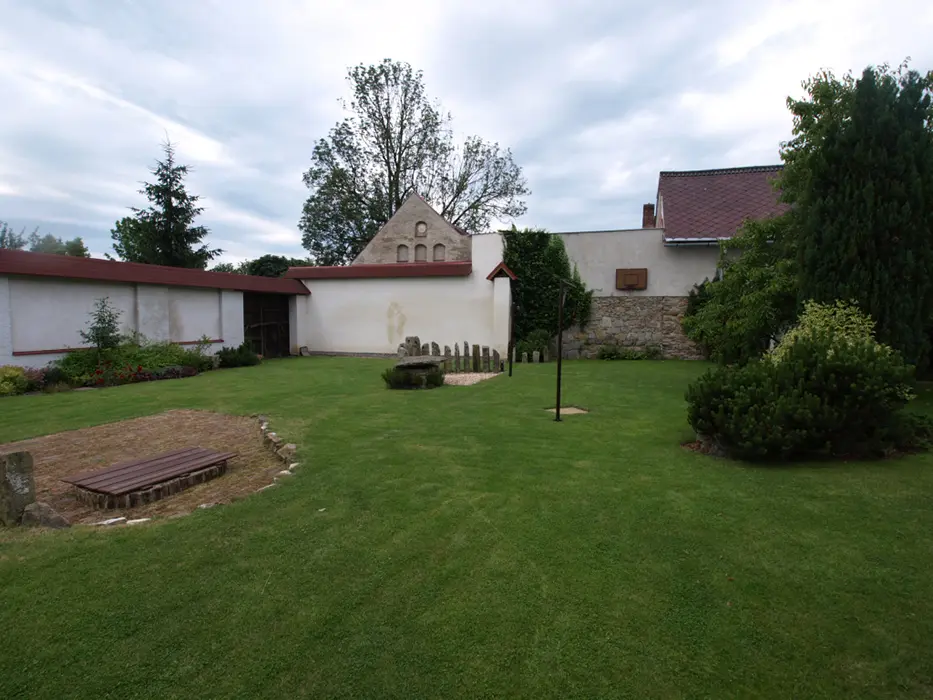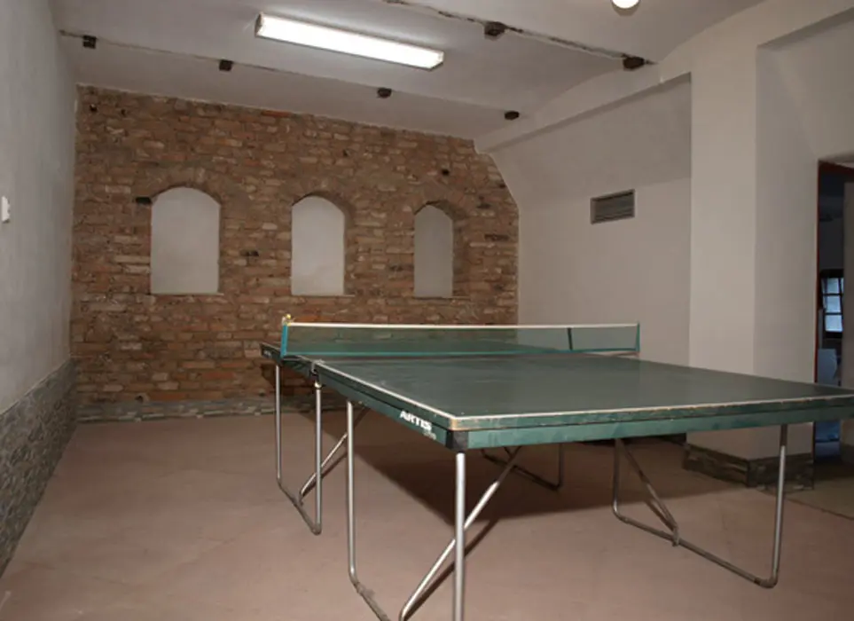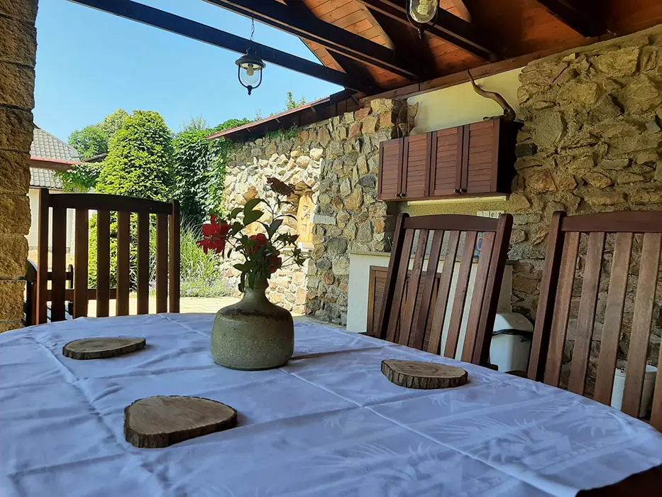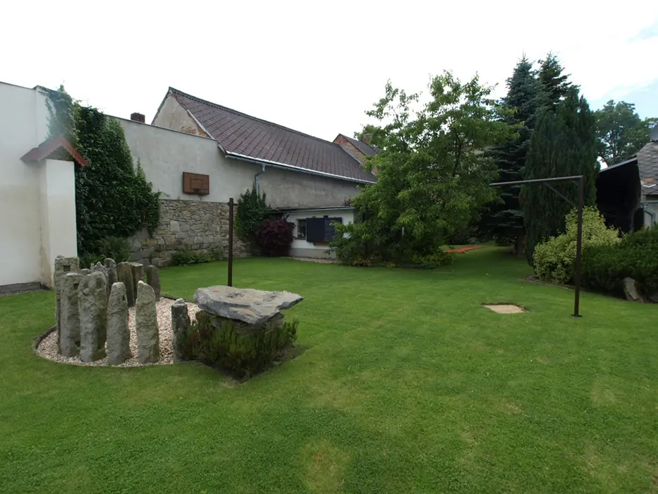 Na velkém uzavřeném dvoře (800 m2) venkovní krb s posezením, stolní tenis, dráha na minigolf, hřiště se sítí, petanque, koš na basketbal, ruské kuželky, dětské pískoviště, crocket, stolní fotbal, dětská houpačka