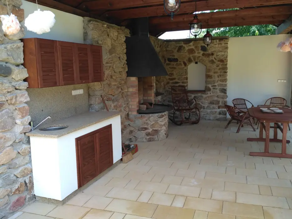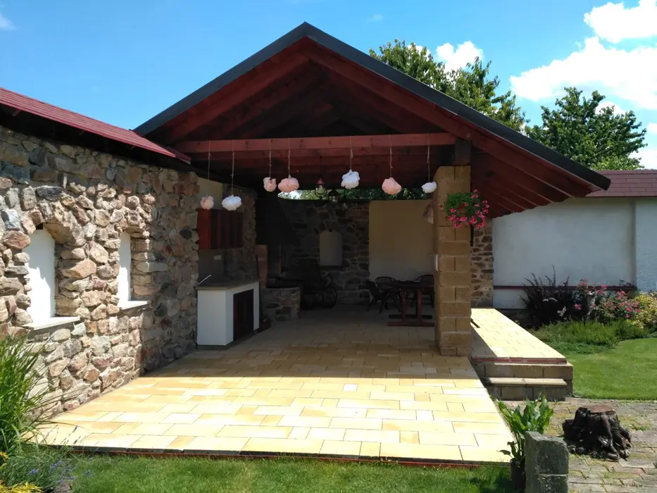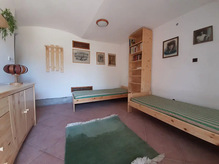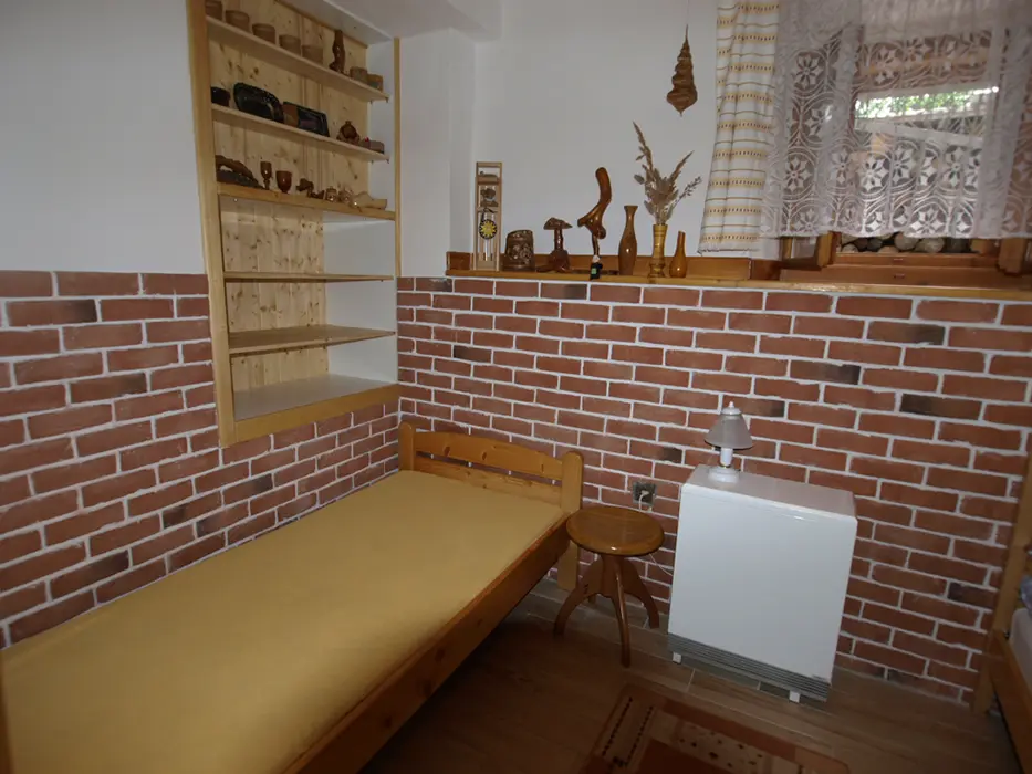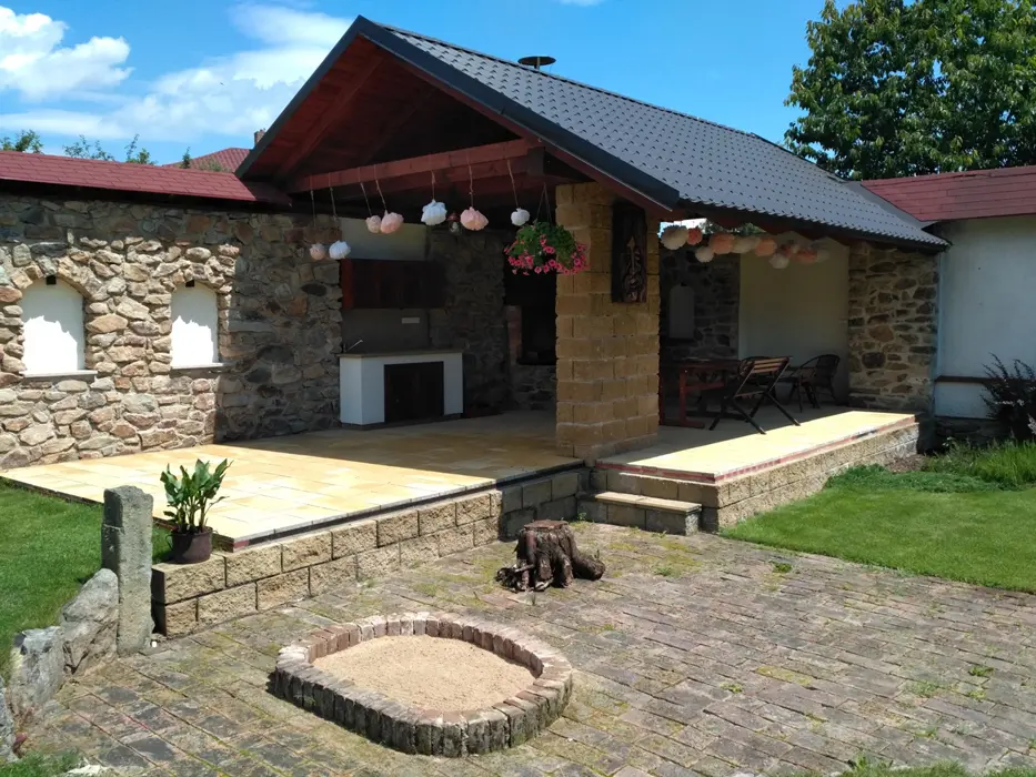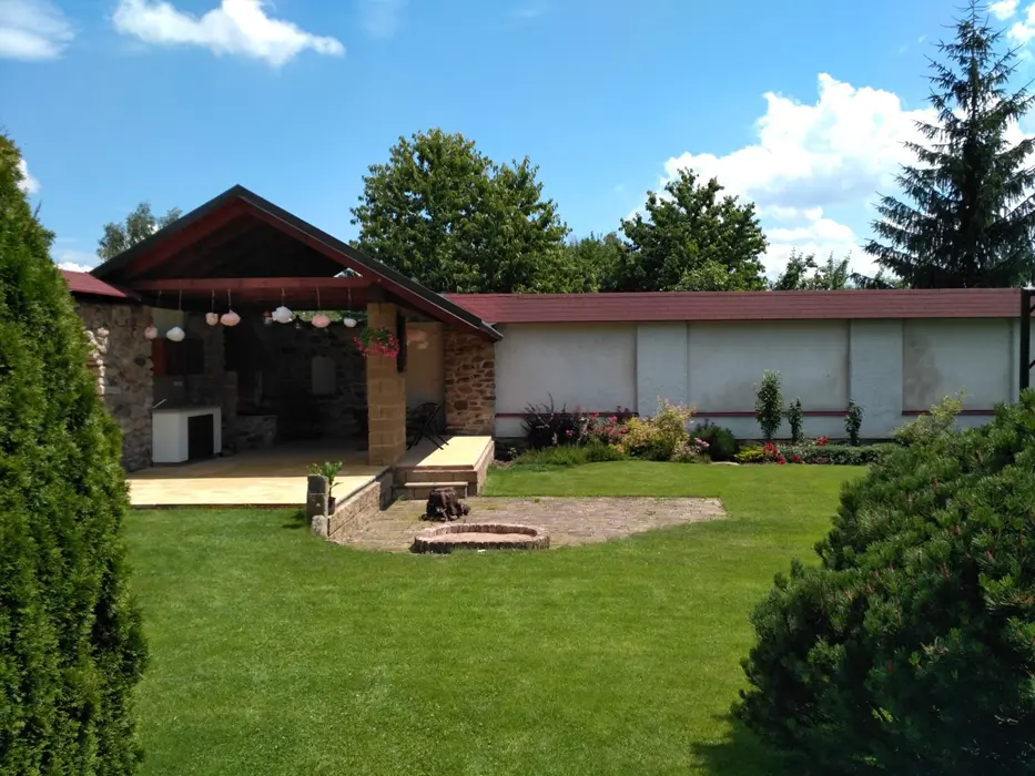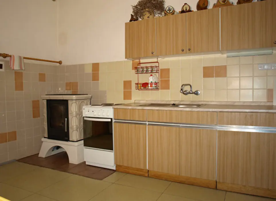 Obývací pokoj s posezením, krb, TV. Samostatná kuchyně - el. sporák, varná konvice, překapávač, MVT, lednice, stůl a židle, základní nádobí. 3 ložnice - 1x3, 1x3 ( palanda + lůžko ), 1x2 - tato je přístupná ze zahrady. Soc. zařízení - koupelna se sprchou, 2x samostatné WC. Topení kombinované - krbová vložka + akumulační kamna. K dispozici dětská postýlka a židlička.