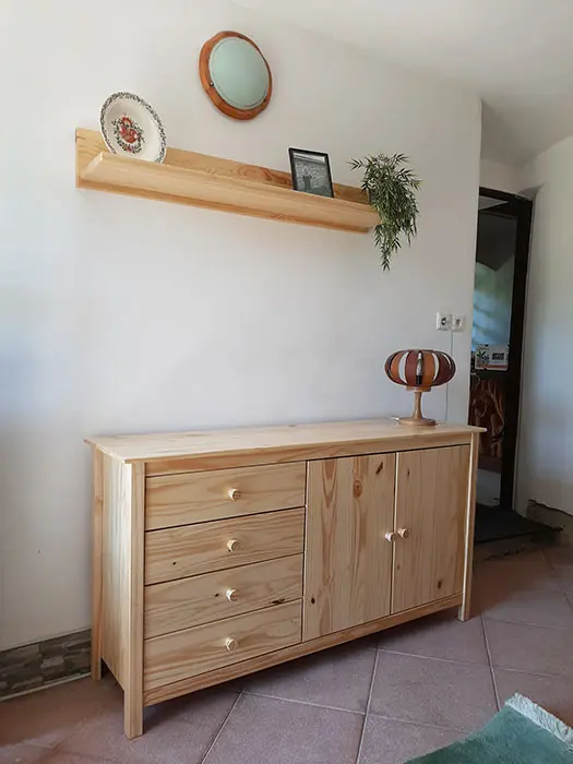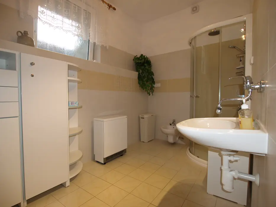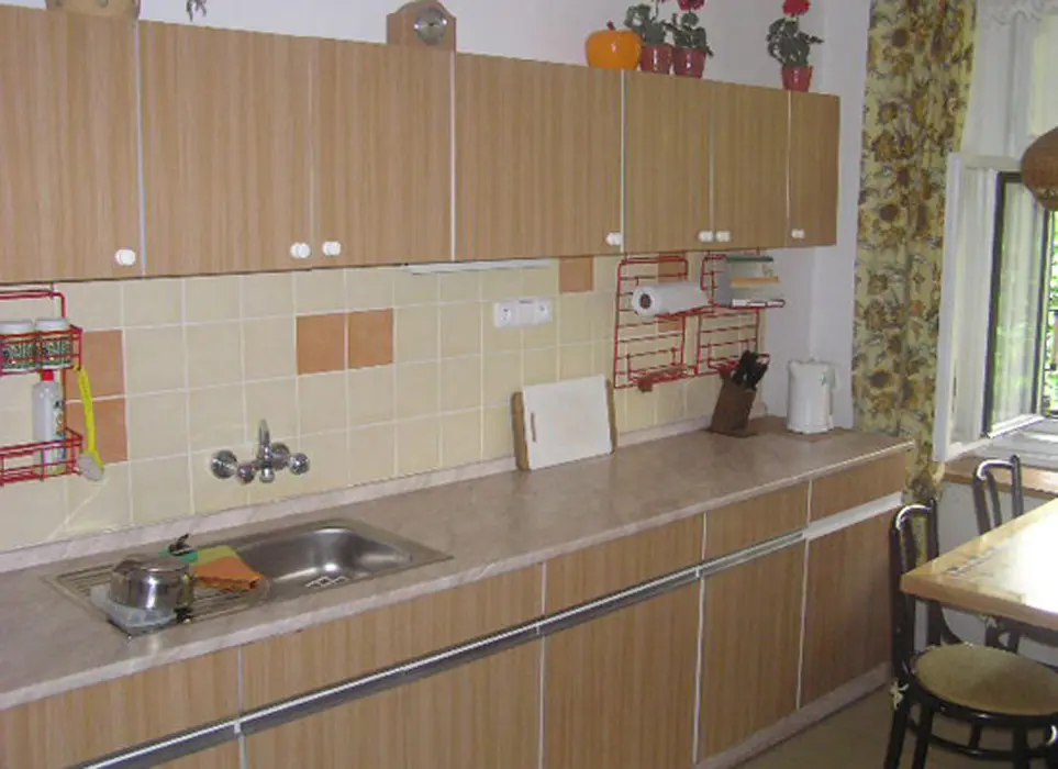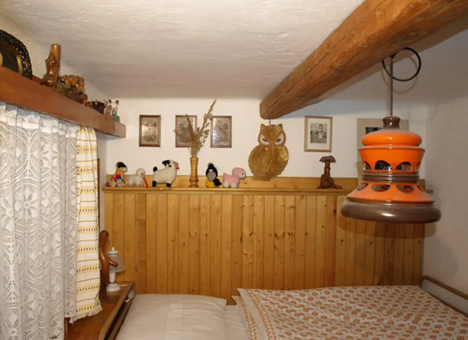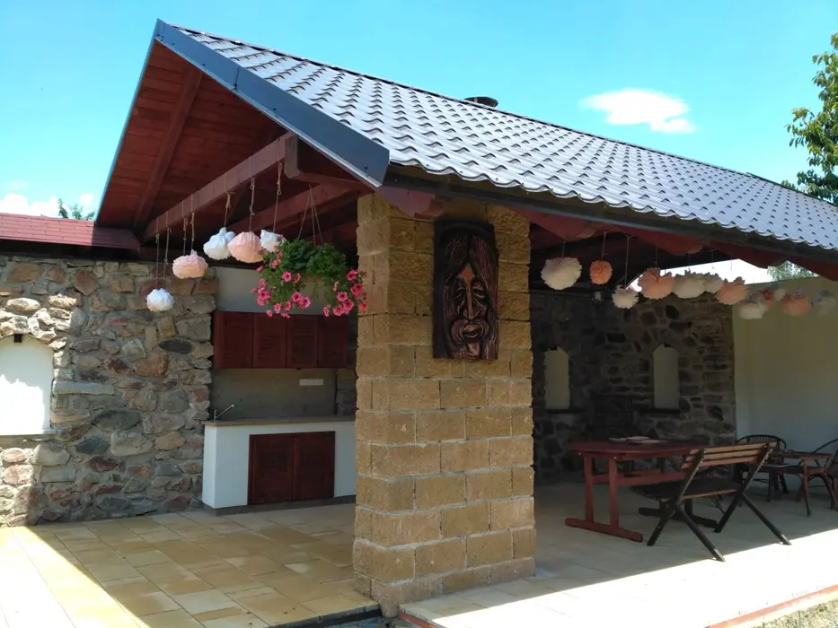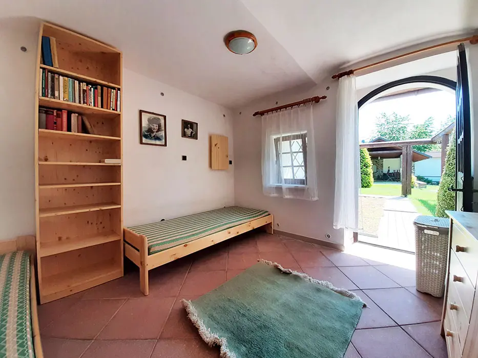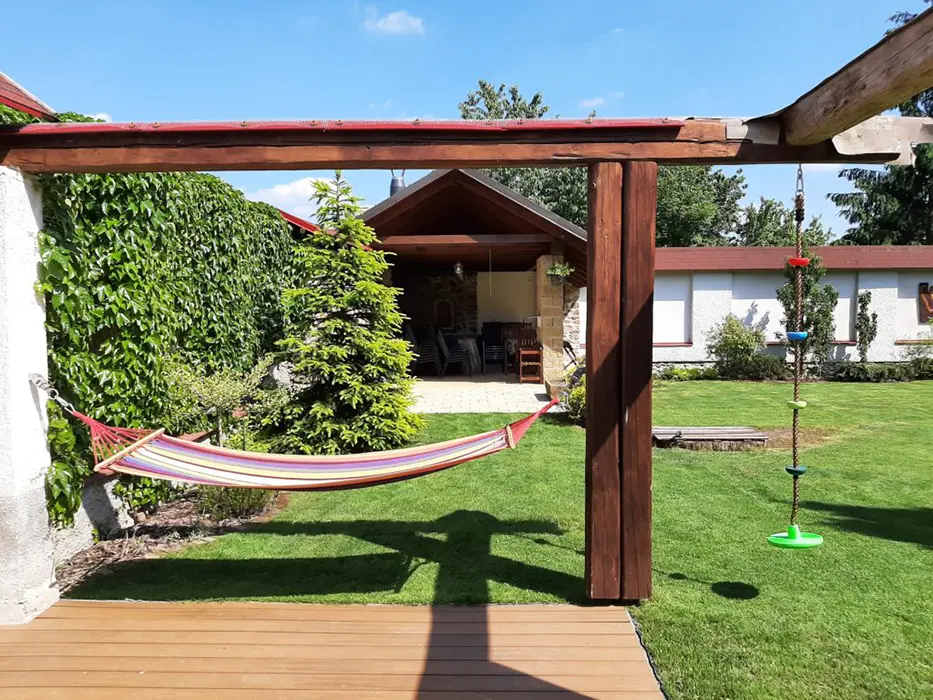 Obývací pokoj s posezením, krb, TV. Samostatná kuchyně - el. sporák, varná konvice, překapávač, MVT, lednice, stůl a židle, základní nádobí. 3 ložnice - 1x3, 1x3 ( palanda + lůžko ), 1x2 - tato je přístupná ze zahrady. Soc. zařízení - koupelna se sprchou, 2x samostatné WC. Topení kombinované - krbová vložka + akumulační kamna. K dispozici dětská postýlka a židlička.