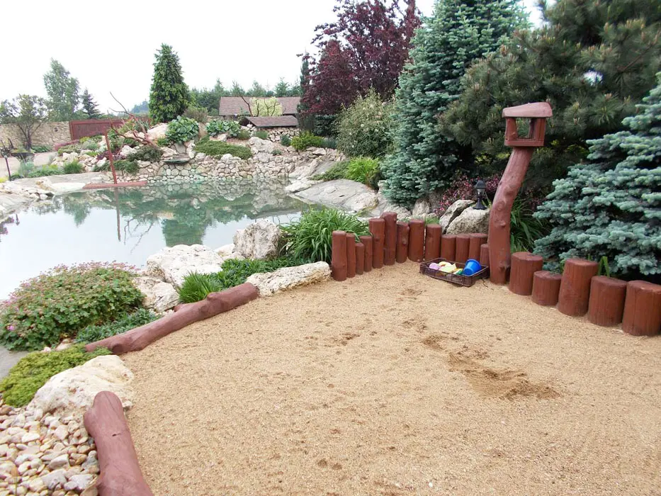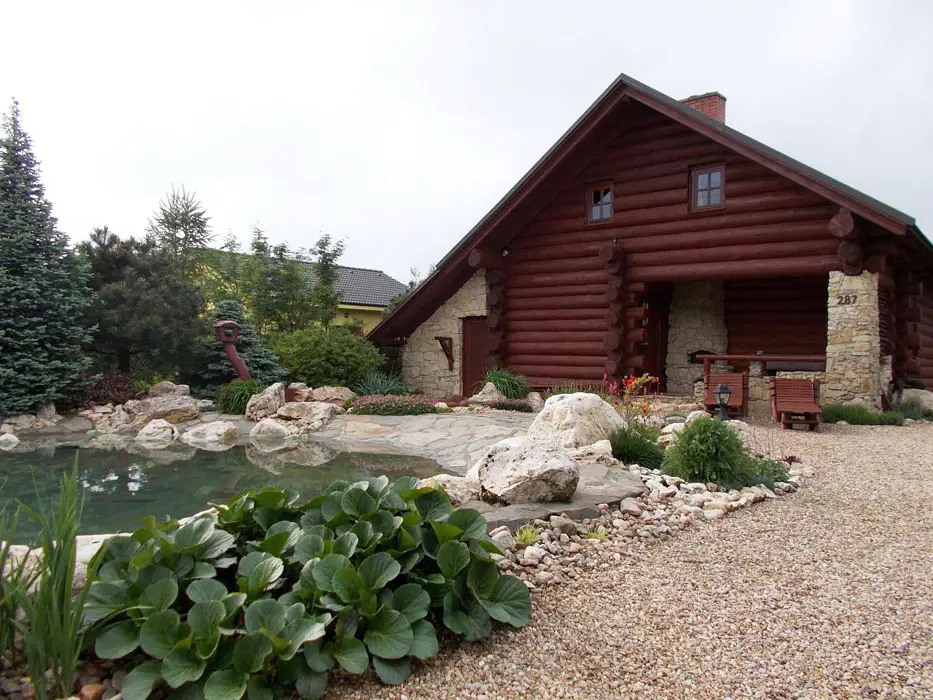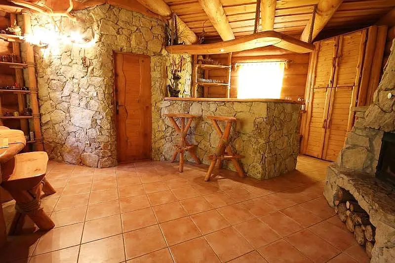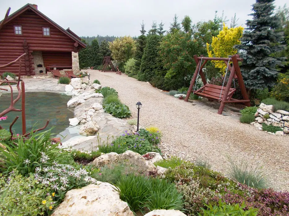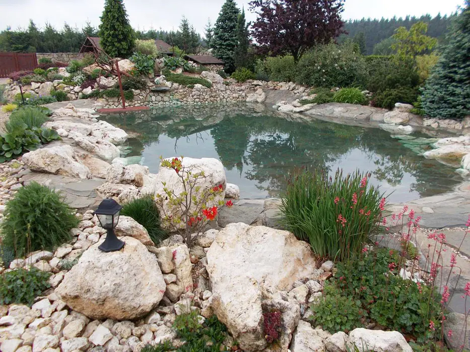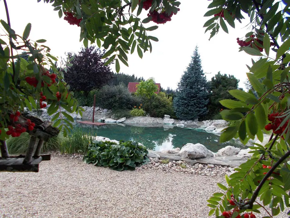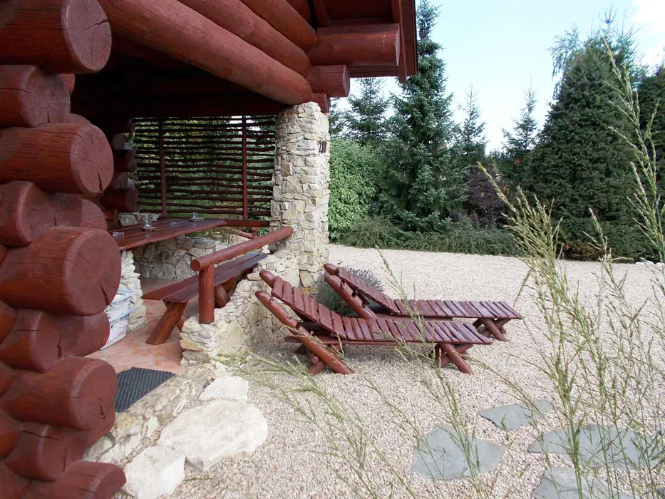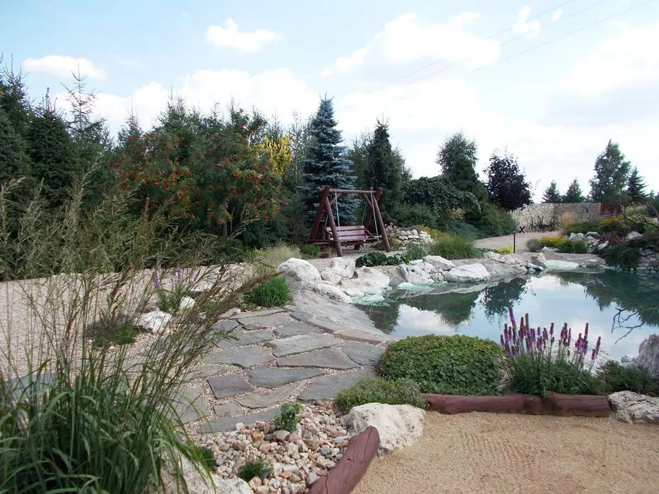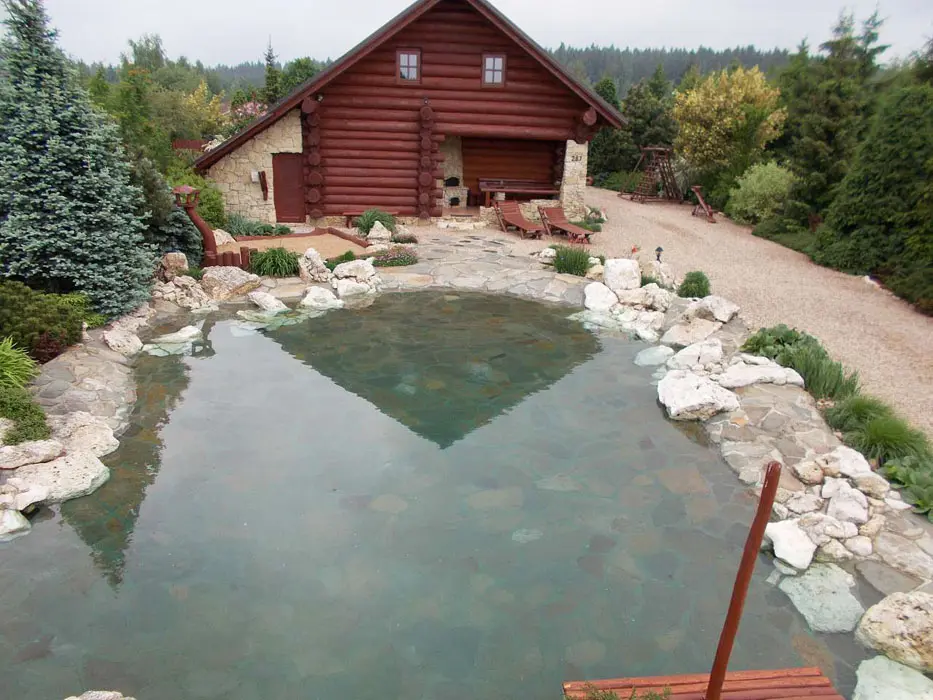 Jezero s vodopádem určené ke koupání, pozemek 1200 m2. Houpačky, lehátka, jeskyně pro děti, prolézačka, venkovní posezení na kryté verandě s krbem, k dispozici lávový gril