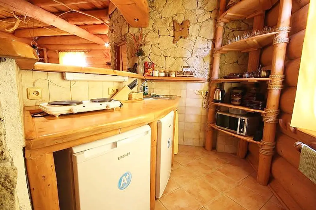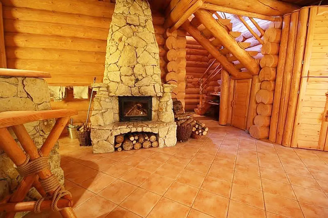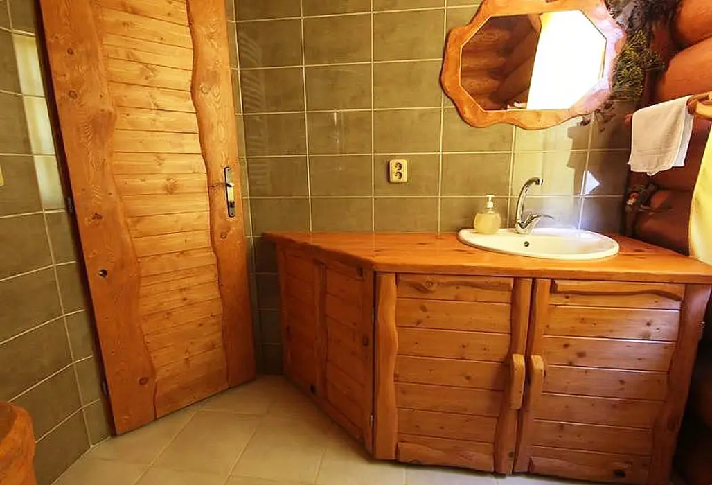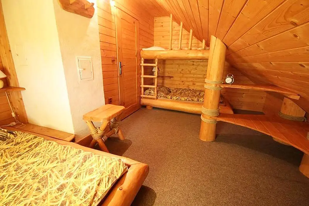 Obývací pokoj - sedací souprava, posezení u krbu, TV, DVD, domácí kino. Kuchyně - samostatná se základním vybavením 2 lednice, rychlovarná konvice, mikrovlnná trouba, vařič a toustovač. 2 ložnice - 2x3 lůžka. Sociální zařízení - 2x - v přízemí sprchový kout, umyvadlo, WC, v podkroví - velká vana, včetně WC. Topení - krb