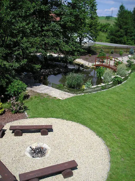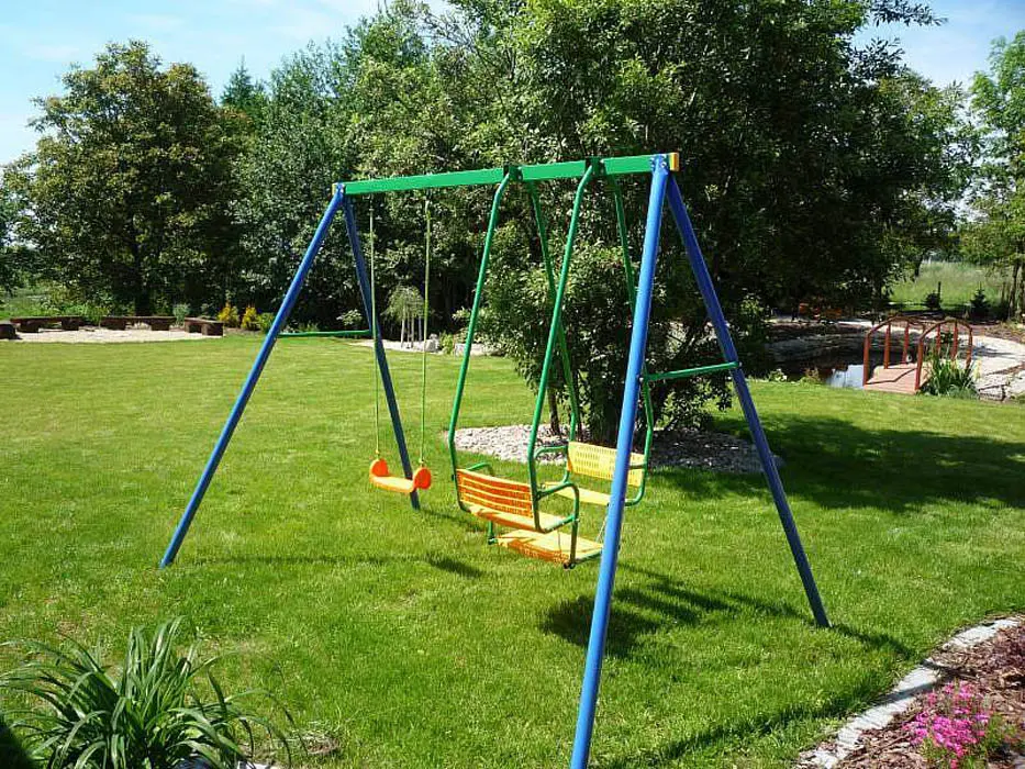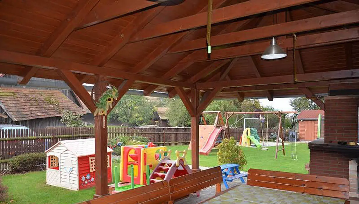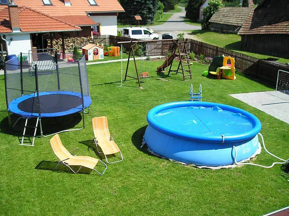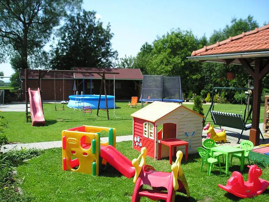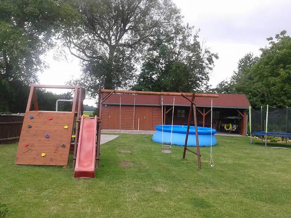 Posezení pod pergolou, zahradní krb, dětský koutek - hřiště, houpačky, pískoviště, skluzavky, nadzemní kruhový bazén, branky na minikopanou, přírodní jezírko, elektrický gril, ohniště s posezením, ruské kuželky a různé míčové hry, hračky na zahradu např. zahradní domeček pro malé děti, malá skluzavka a síť na volejbal, stolní tenis