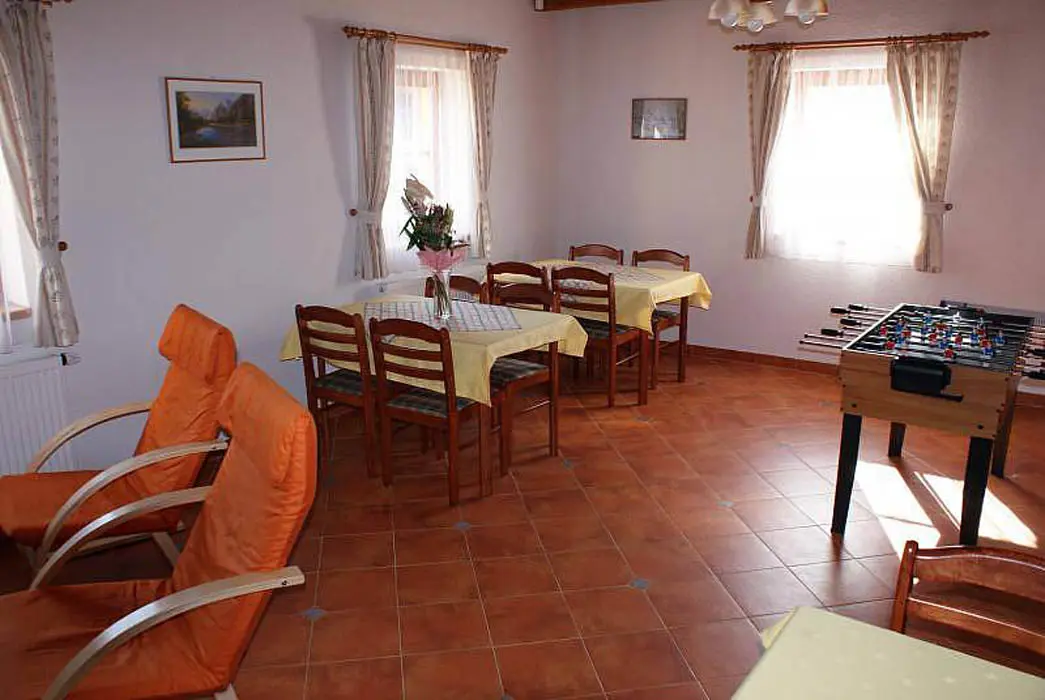 Společenská místnost - hrací stůl se stolním fotbalem, hokejem, kulečníkem, el. šipky. Kuchyně - el. spotřebiče, lednička s mrazákem, myčka nádobí, elektrický gril, kávovar, varná konvice, topinkovač, toustovač, mixer, nádobí. Za poplatek je možné pronajmout výčepní zařízení s kompresorem a chlazením. Úklidové prostředky, toaletní papír, utěrky a ložní prádlo jsou k dispozici. 4 ložnice - 2x2, 2x3 lůžka + možnost 4 přistýlek, v každé BTV, 2 ložnice mají balkón. Sociální zařízení - 3x WC, 2x plně vybavené koupelny se sprchovým koutem.