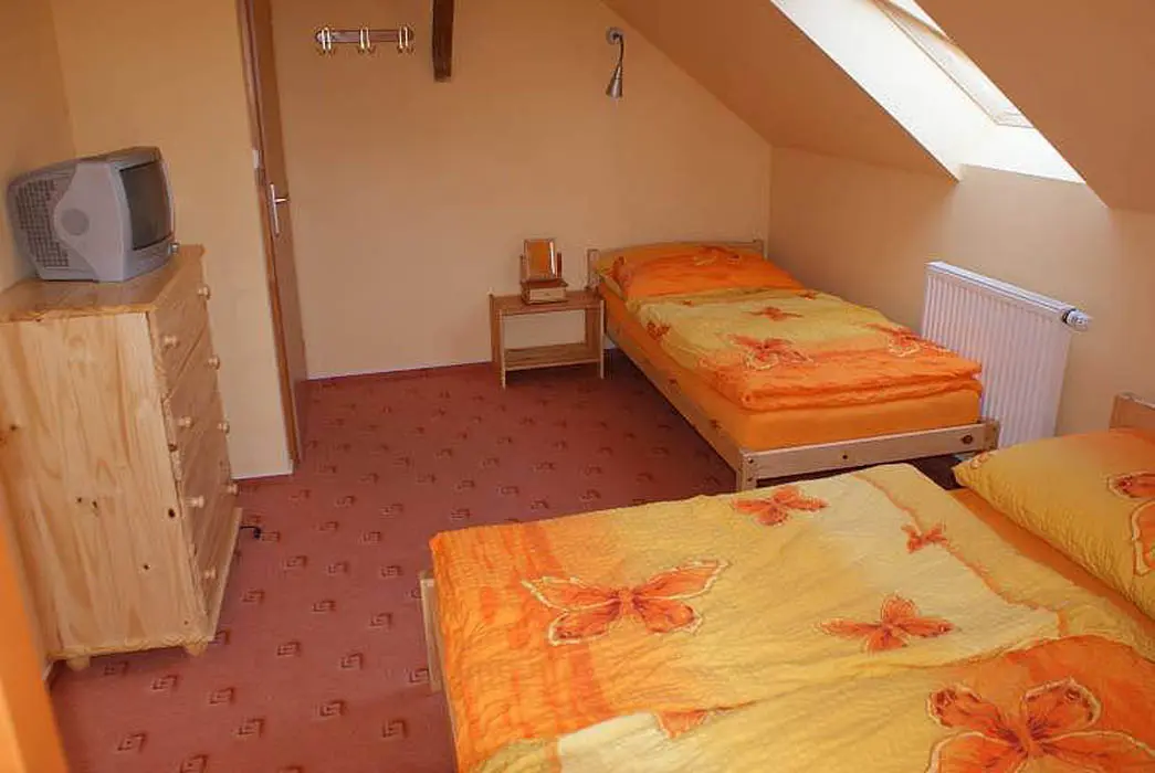 2 ložnice 1x2, 1x3 lůžka + v jedné rozkládací křeslo, v každé ložnici BTV a vstup na balkón. Soc. zařízení – 2 x WC, 1x plně vybavená koupelna se sprchovým koutem. NOVINKA - hrací stůl 9 v 1, k dipozici dětská postýlka + ohrádka