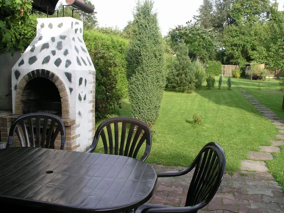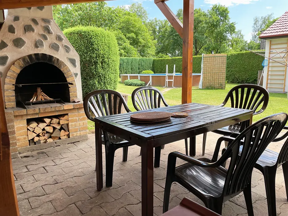 Kryté posezení u venkovního krbu, gril. Zapuštěný bazén 7,5 x 3,5 m