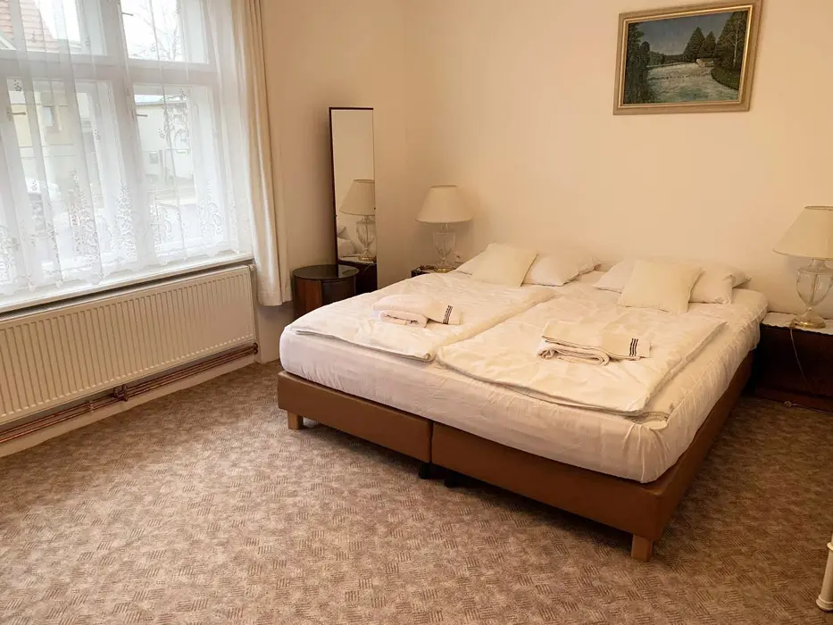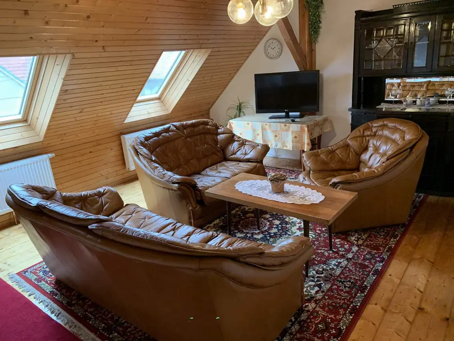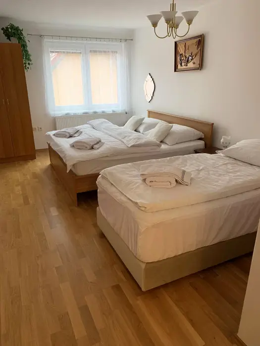 V přízemí obývací pokoj se sedací soupravou, BTV, SAT, DVD s možností přistýlky. Samostatná kuchyně s posezením - el.sporák se sklokeramickou deskou, lednice, mrazák, mikrovlnka, varná konvice a základní nádobí. 3 ložnice - v přízemí 1x3, v patře 2x3 lůžka. Soc. zařízení - přízemí 1x koupelna se sprchou a vanou, 1x WC samostatné, v patře koupelna se sprchou a s WC. Topení - el.přímotopy