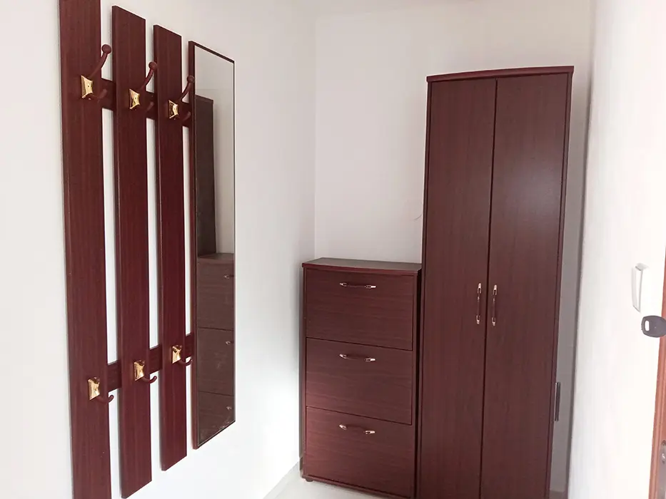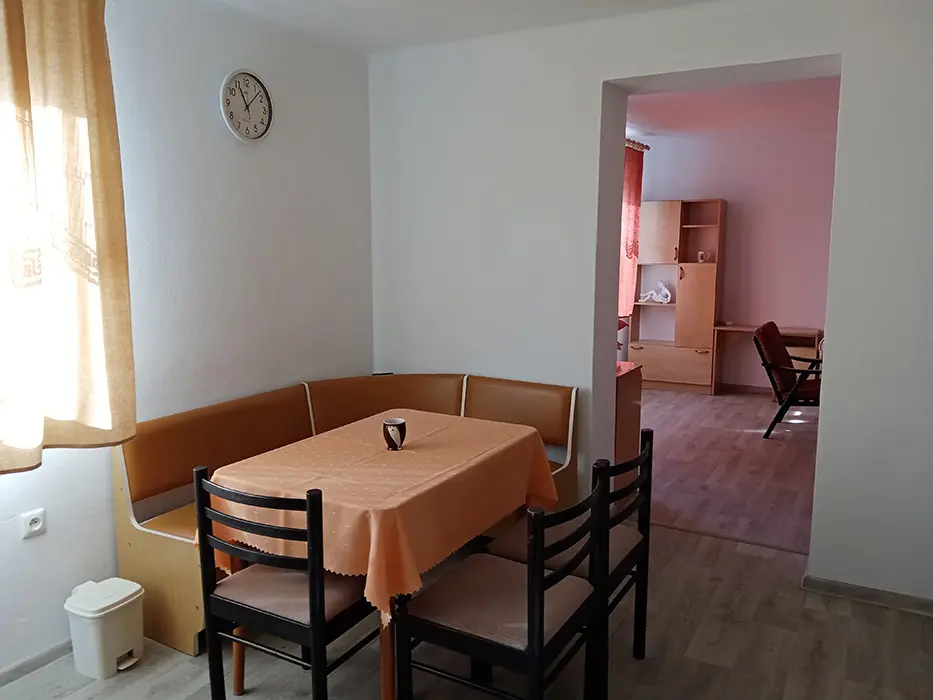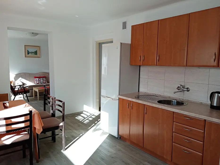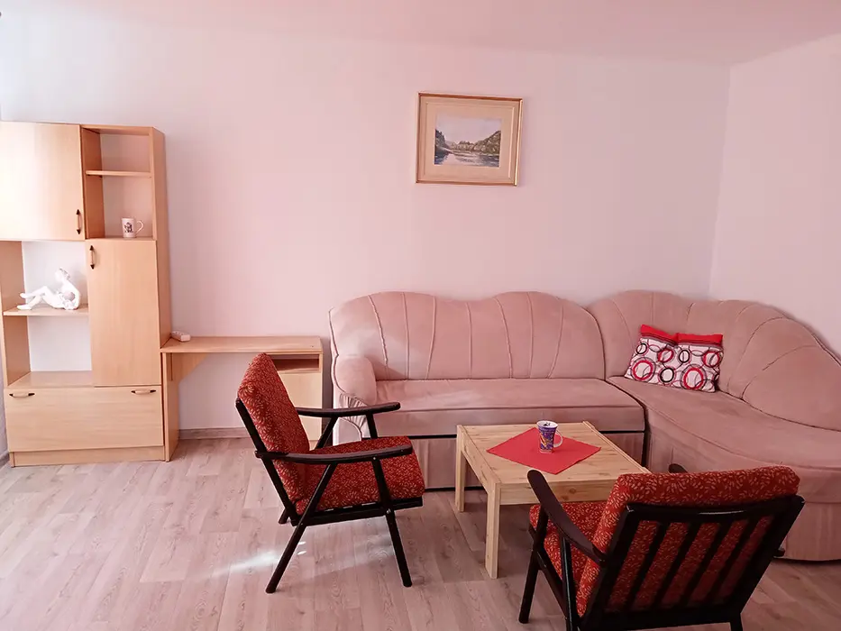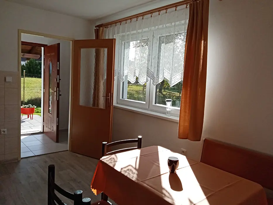 Obytná část s posezením, jídelní stůl a židle, TV - na vyžádání u majitele, 3 lůžka - prostorné rozkládací dvoulůžko + samostatná postel, kuchyně - lednice s mrazákem, mikrovlnka, el. sporák s troubou, varná konvice, nádobí. 1 ložnice - 1x2 lůžka. Soc. zařízení - koupelna s vanou, samostatné WC. Topení - úsporná halogenová topidla, v koupelně - el. žebřík