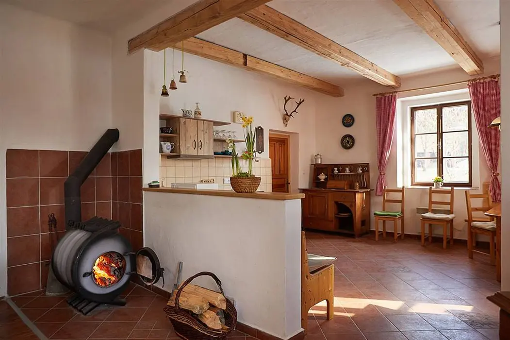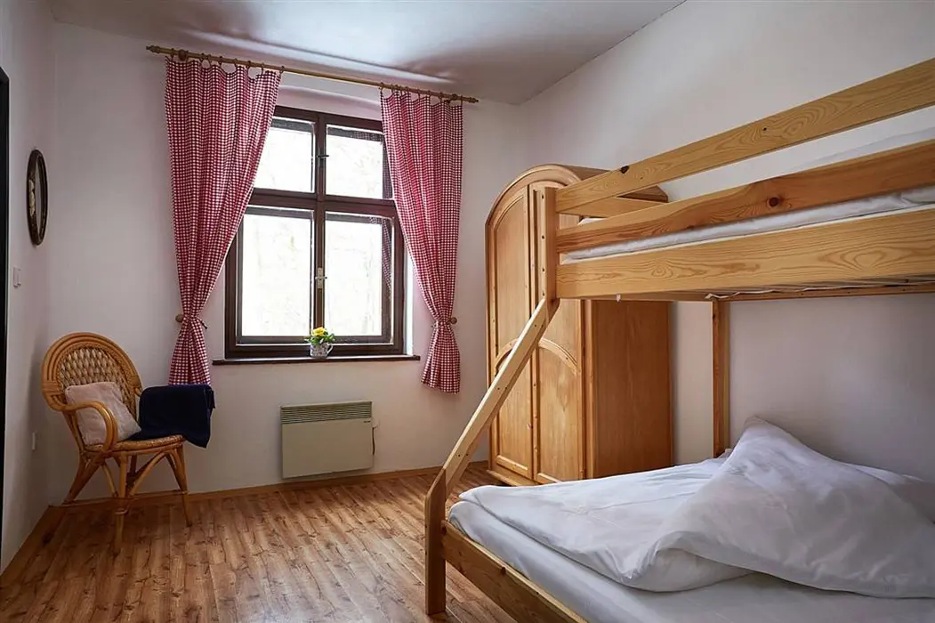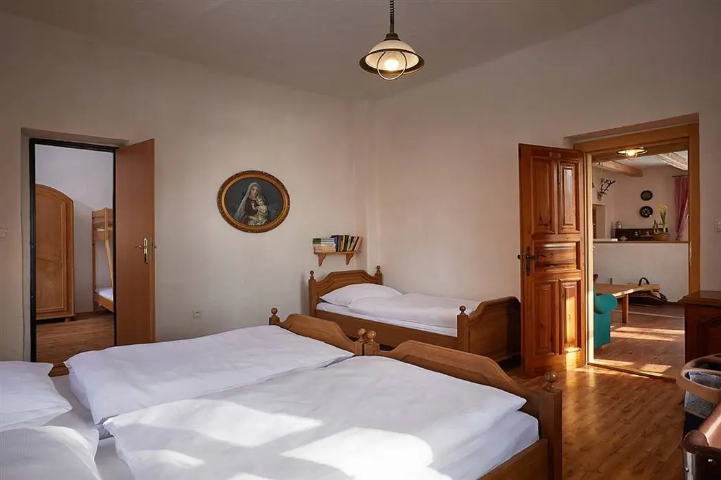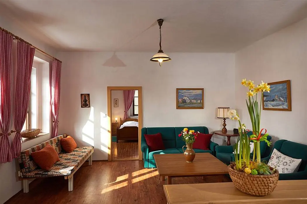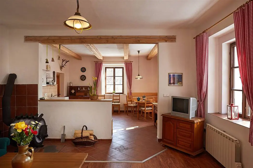 Vstupní chodba, prostorná obytná část spojená s kuchyní - sedací souprava možnost 3 lůžek - přistýlek na rozkládacím gauči, TV, krbová kamna, vybavení kuchyně - varná konvice, mikrovlnka, varná deska, lednice s mrazákem. 2 ložnice - 1x3 lůžka - tato je průchozí, další 1x3 lůžka - palanda. Soc. zařízení - koupelna se sprchou, umyvadlo, samostatné WC. Topení - stylová krbová kamna na dřevo, tepelné čerpadlo (regulace je možná na termohlavicích)