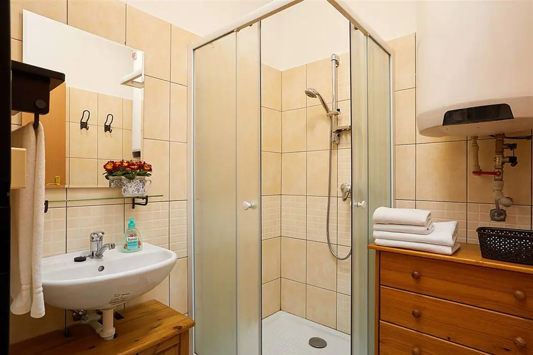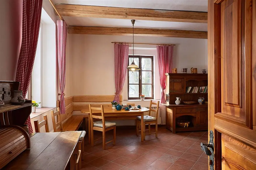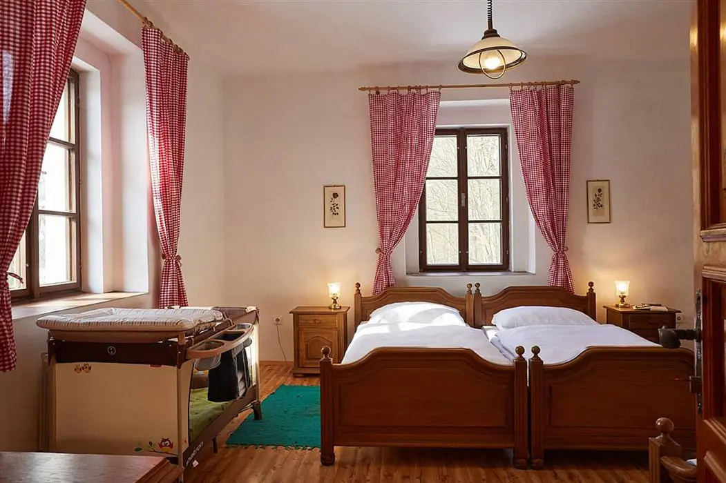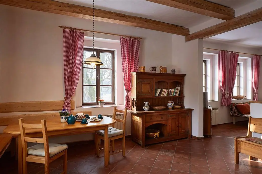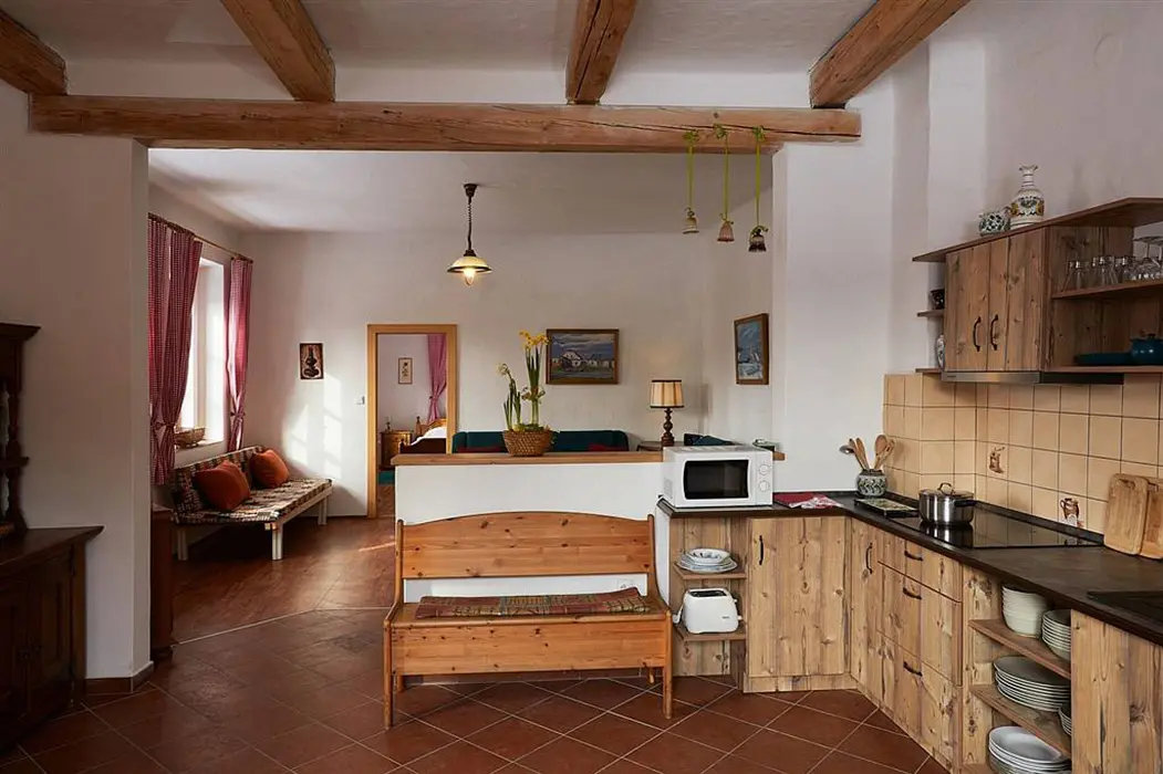 Vstupní chodba, prostorná obytná část spojená s kuchyní - sedací souprava možnost 3 lůžek - přistýlek na rozkládacím gauči, TV, krbová kamna, vybavení kuchyně - varná konvice, mikrovlnka, varná deska, lednice s mrazákem. 2 ložnice - 1x3 lůžka - tato je průchozí, další 1x3 lůžka - palanda. Soc. zařízení - koupelna se sprchou, umyvadlo, samostatné WC. Topení - stylová krbová kamna na dřevo, tepelné čerpadlo (regulace je možná na termohlavicích)