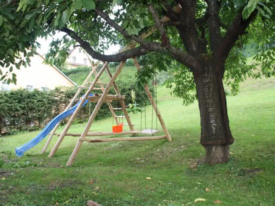 Zapuštěný bazén 7,5x4 m se solárním ohřevem, dětský koutek s houpačkami a klouzačkou, ohniště, velká zahrada, společná terasa, hřiště 10x20m, dětské hřiště