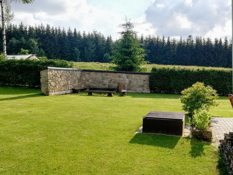 Pozemek cca 1000 m2 je celý oplocený a zatravněný, ohniště s grilem, zahradní sezení, pískoviště a dětská houpačka.