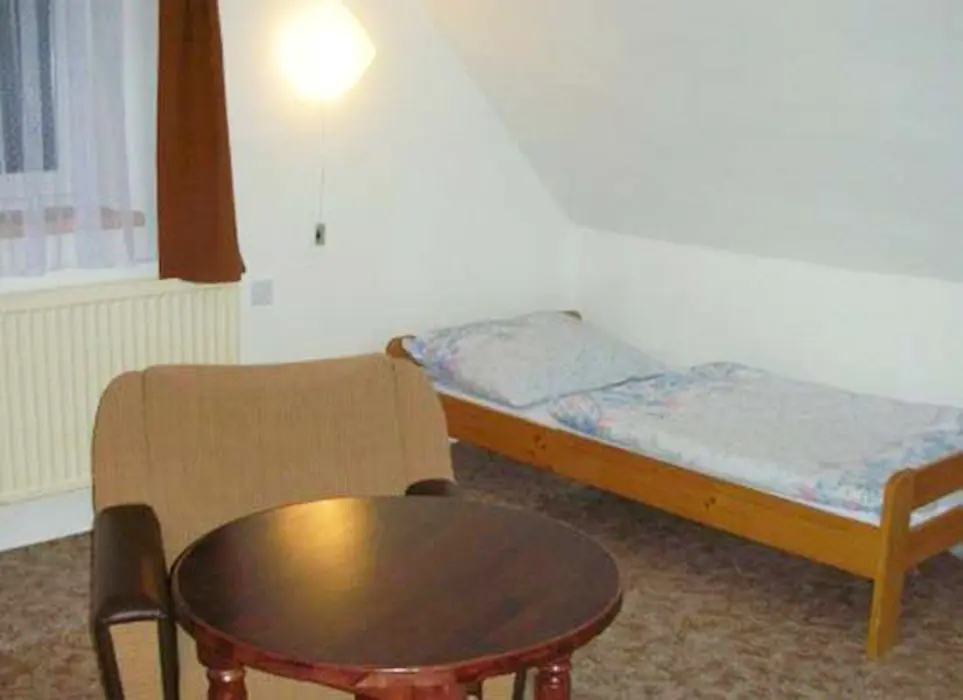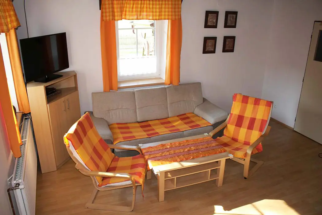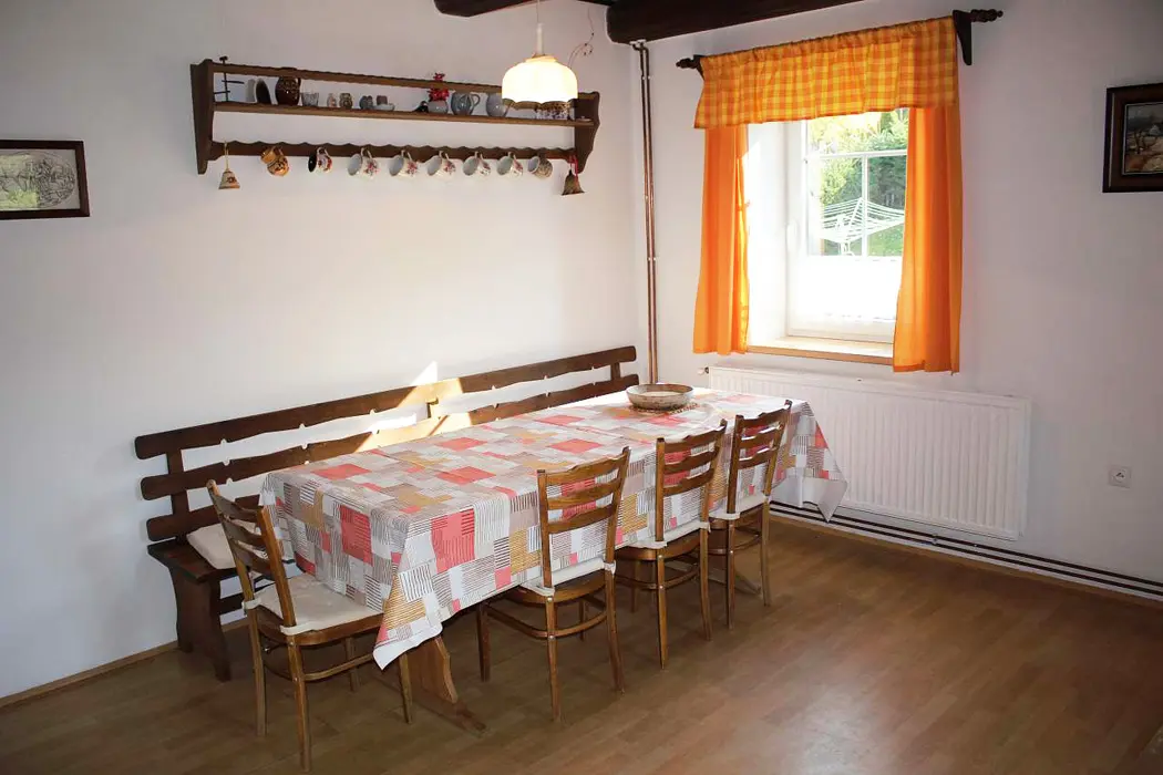V přízemí je rozlehlá vstupní hala, obývací pokoj s posezením, BTV, SAT, stůl a židle, stylová kachlová kamna, na který navazuje kuchyňský kout – lednice, el. sporák, mikrovlnka, varná konvice, základní nádobí. V suterénu je další místnost s krbem, sedací souprava, jídelní stůl, šipky. V patře 3 ložnice 1x2, 2x4 lůžka + k dispozici dětská postýlka. Koupelna s vanou, sprchou, umyvadlem, samostatné WC. Topení centrální el. kotlem + tuhá paliva