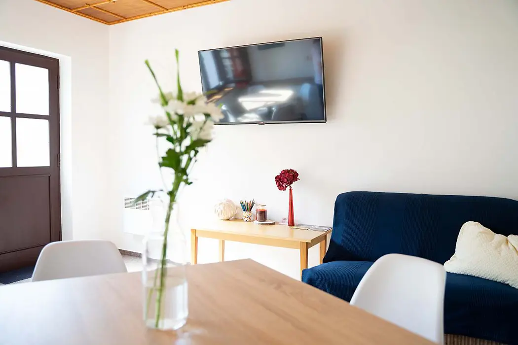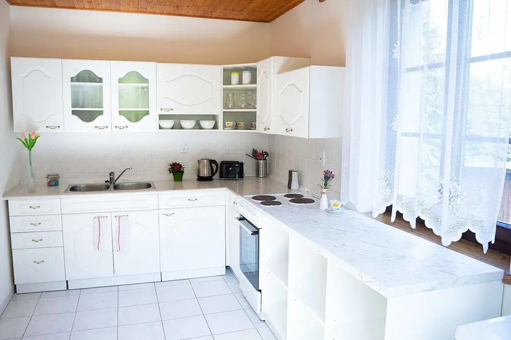 Společná samostatná kuchyně - el. sporák s troubou, mikrovlnka, lednice s mrazákem, nádobí, varná konvice, 3x jídelní stůl a židle. K dispozici 3 samostatné ložnice 3x4 lůžka - v každé vlastní soc. zařízení - sprcha + WC. Topení - el. přímotopy