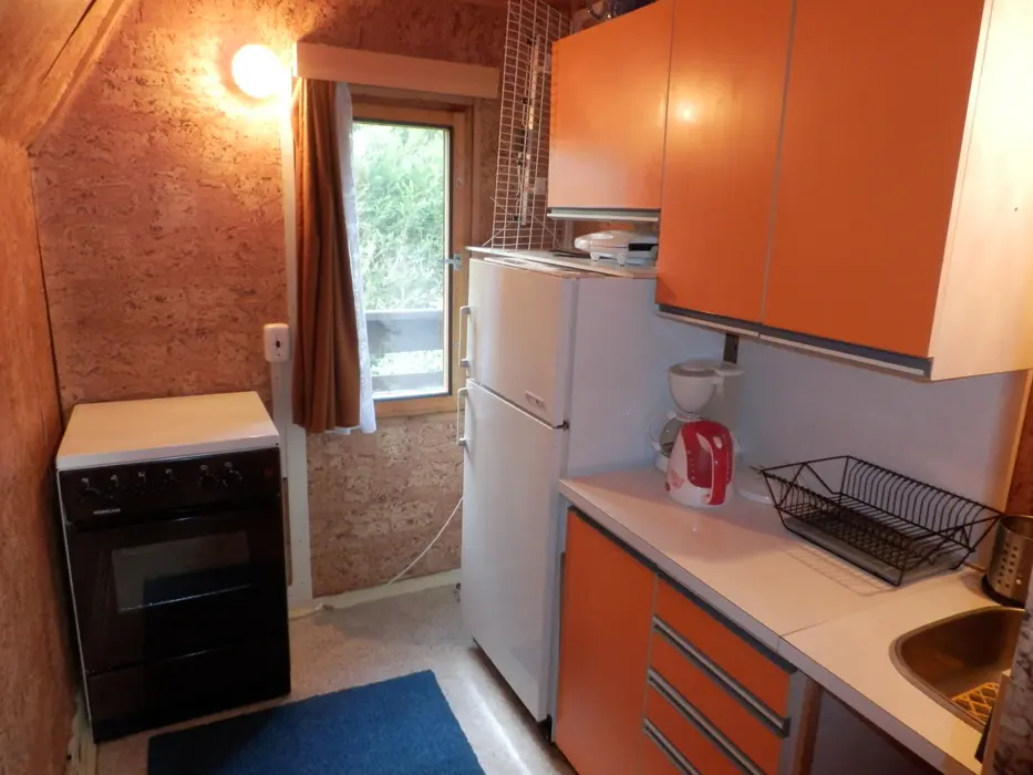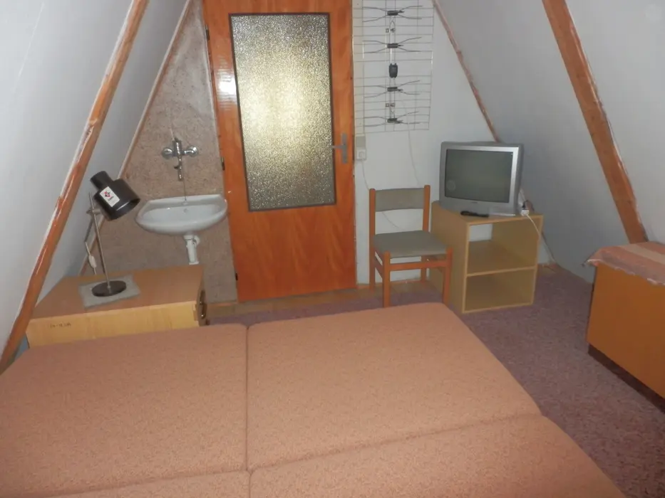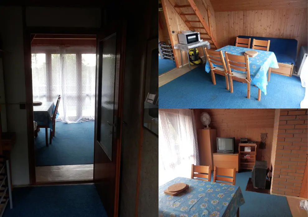 Obývací pokoj spojený s kuchyní, TV, rozkládací gauč. Kuchyňský kout - el. sporák, lednice s mrazákem, varná konvice, mikrovlnka, jídelní stůl a 5 židlí, sendvičovač, topinkovač, kávovar a nádobí. 2 ložnice 2x2 lůžka v podkroví. Sociální zařízení - 2 vany se sprchou, teplá voda z el. boileru,