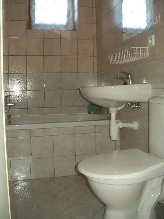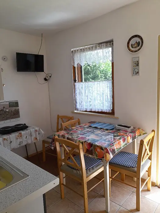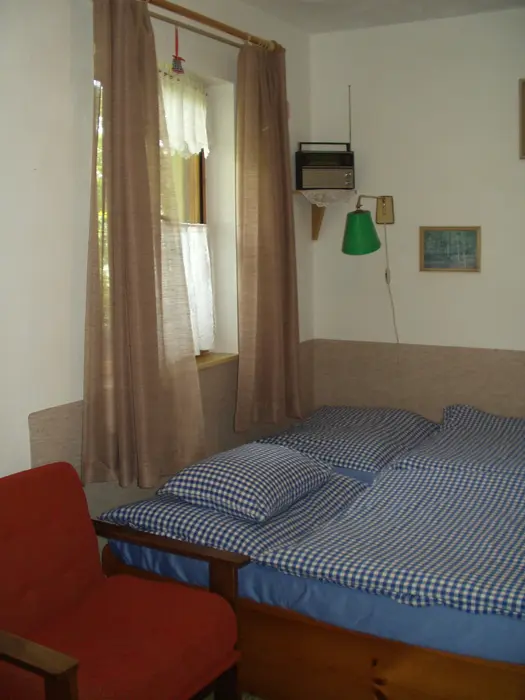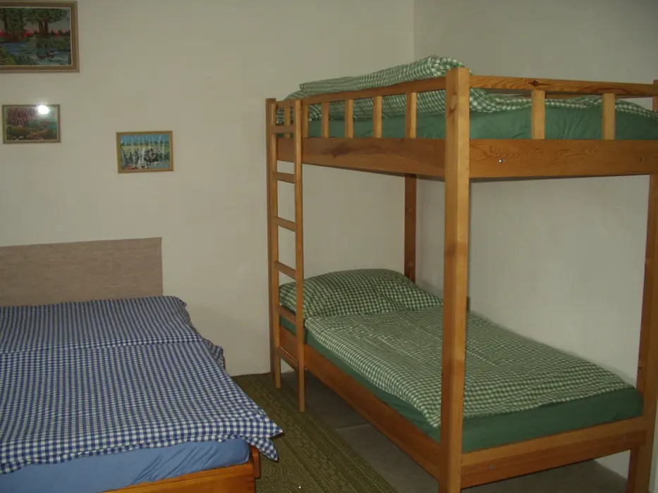 Obývací pokoj - spojený s kuchyní. Kuchyně - samostatná, kuchyňský kout, přenosný 2-plotýnkový elektrický vařič, lednice, varná konvice, TV, jídelní stůl a židle. 1 ložnice - 2 samostatná lůžka + 1 palanda, kamna na dřevo (dřevo za poplatek). Sociální zařízení - vana se sprchou, umyvadlo a WC, teplá voda. Topení - kamna na dřevo v ložnici, infra-zářič v koupelně.