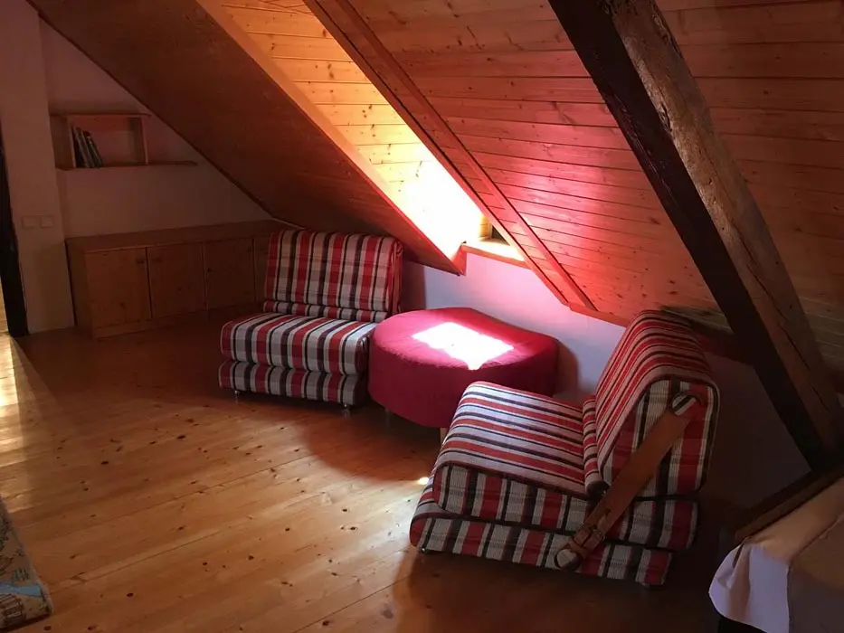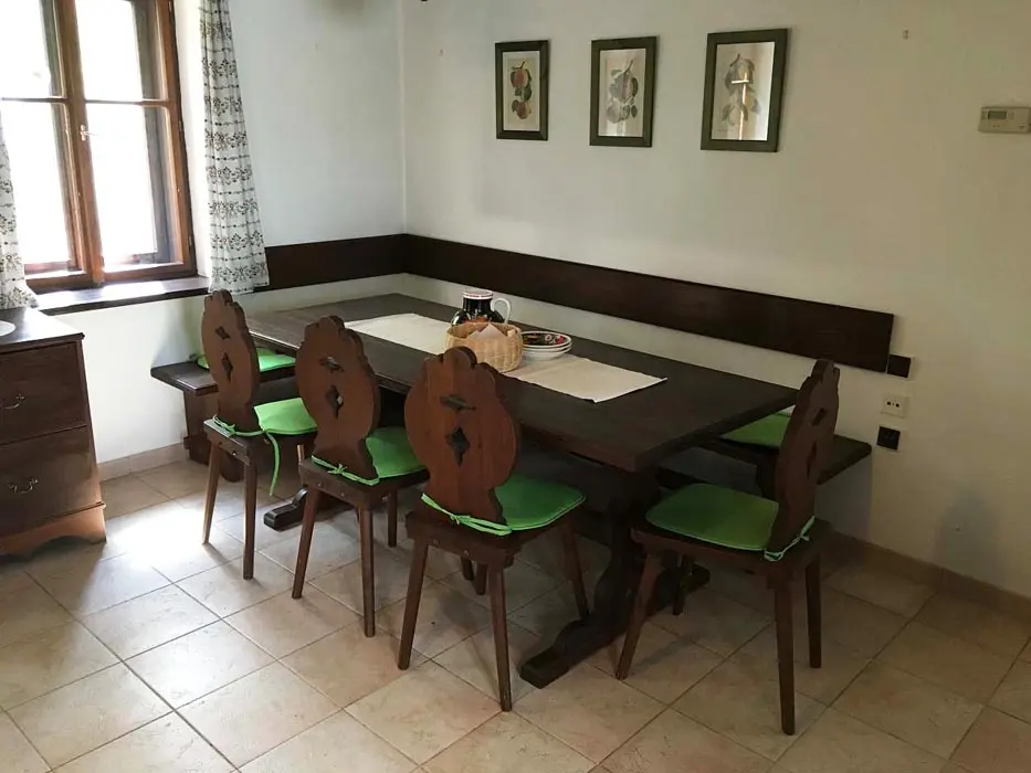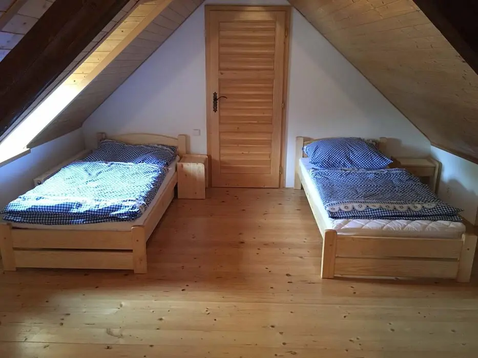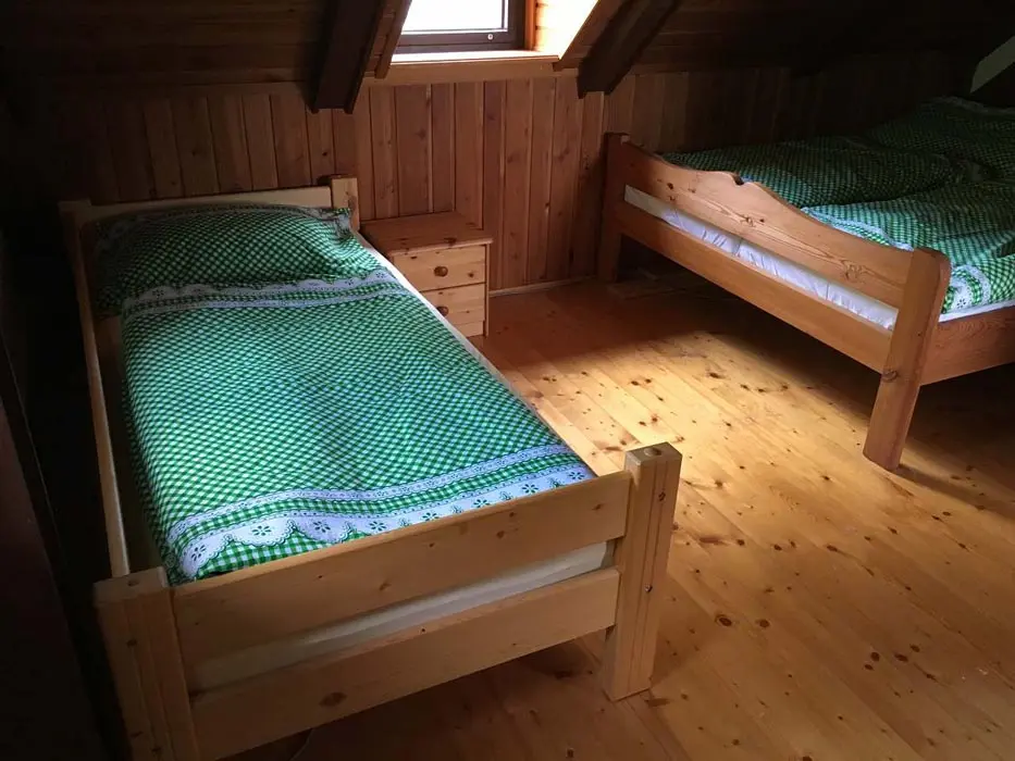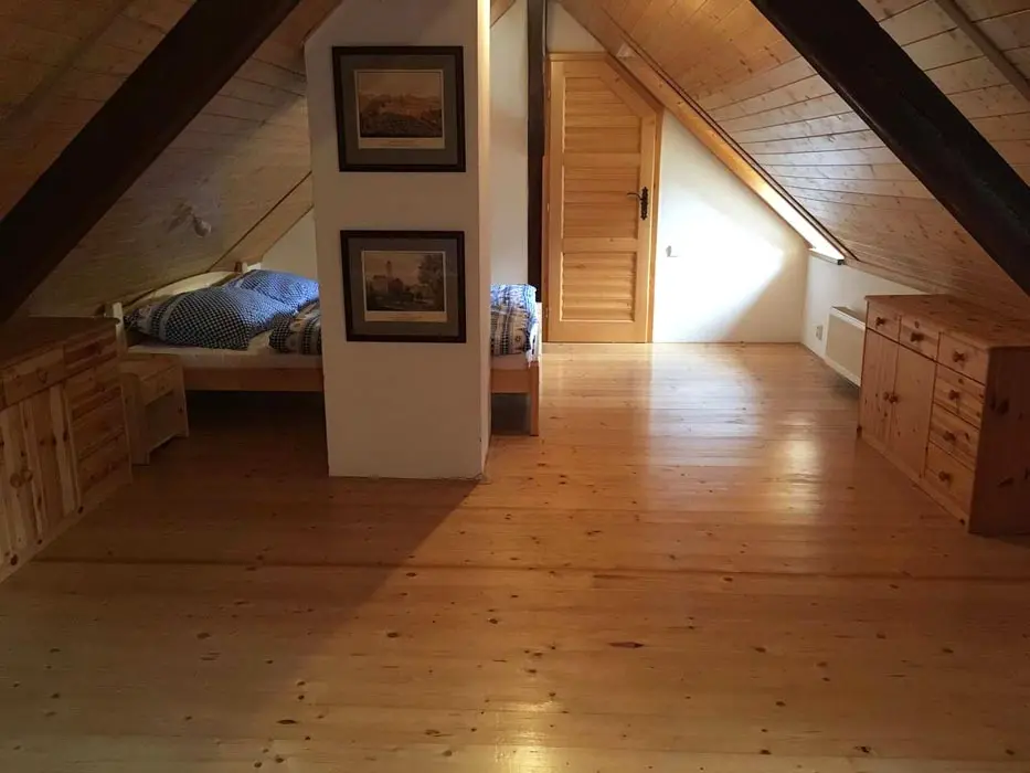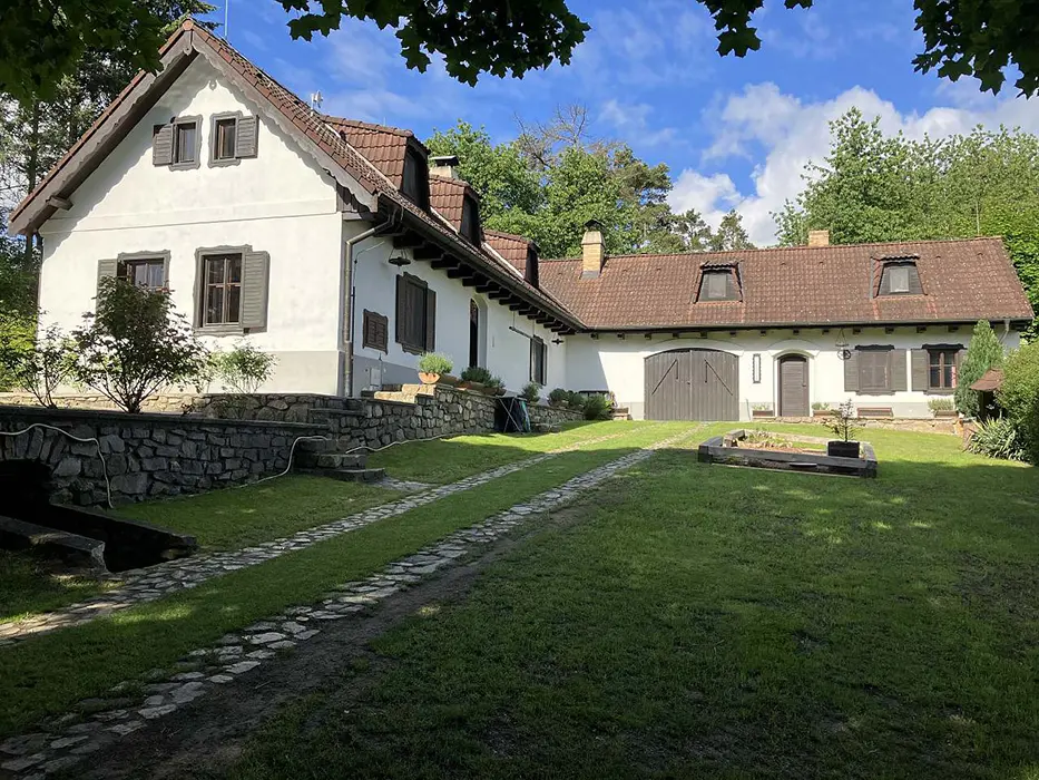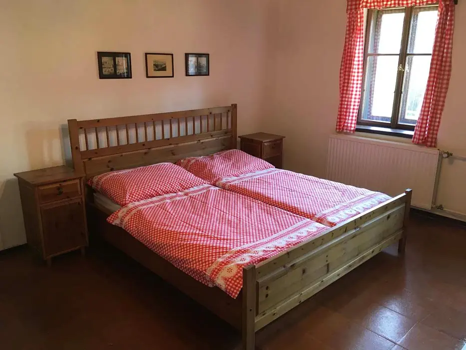 Jedná se o dvě budovy - hlavní + tzv. vejminek. Hlavní budova - prostorná sednice se starou pecí, sedací souprava, krb, TV, vinotéka. Velká kuchyně - sklokeramická varná deska, trouba, myčka, lednice s mrazákem, mikrovlnka, topinkovač, varná konvice, pressovač Tassimo, nádobí. 3 ložnice 3x4 lůžka, půdní prostor s dětským koutkem a odpočinkovou a spací zónou - 4 lůžka + 4 přistýlky. Soc. zařízení - v přízemí - koupelna s vanou a umyvadlem, samostatné WC, v podkroví koupelna se sprch. koutem a umyvadlem, WC. Část vejminek - 1 velký pokoj s manželskou postelí + kuch. kout, soc. zařízení - sprchový kout, WC. Topení - celý objekt - el. topení v kombinaci s kotlem na tuhá paliva, obývací pokoj i krbem a elektrickým podlahovým vytápěním