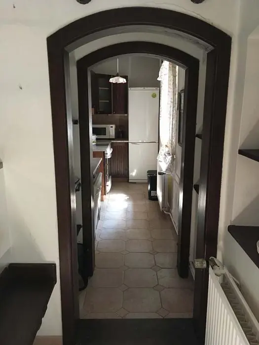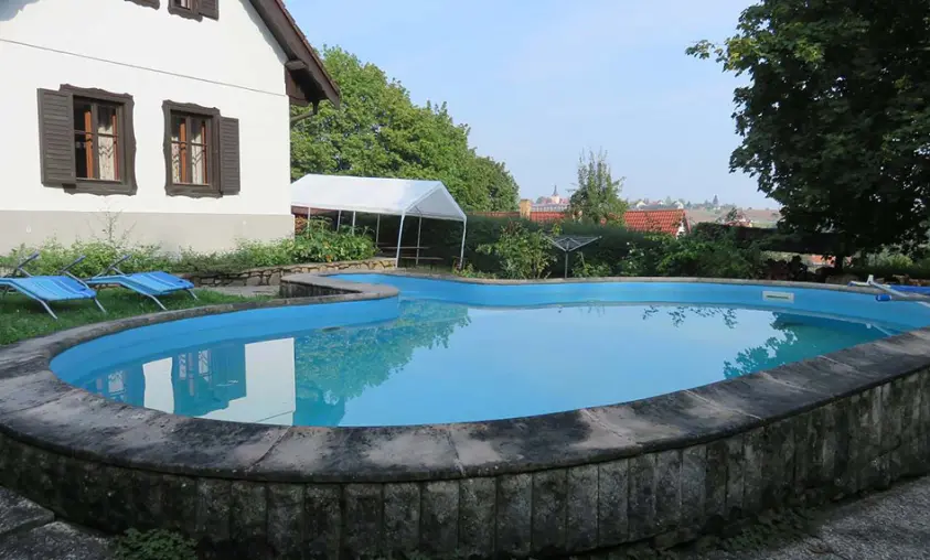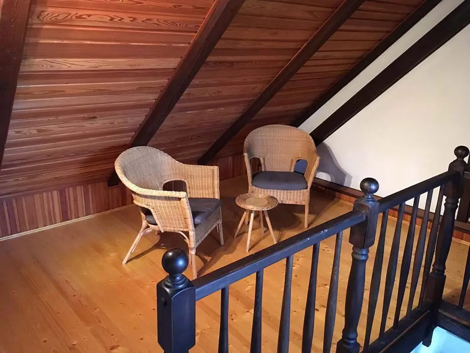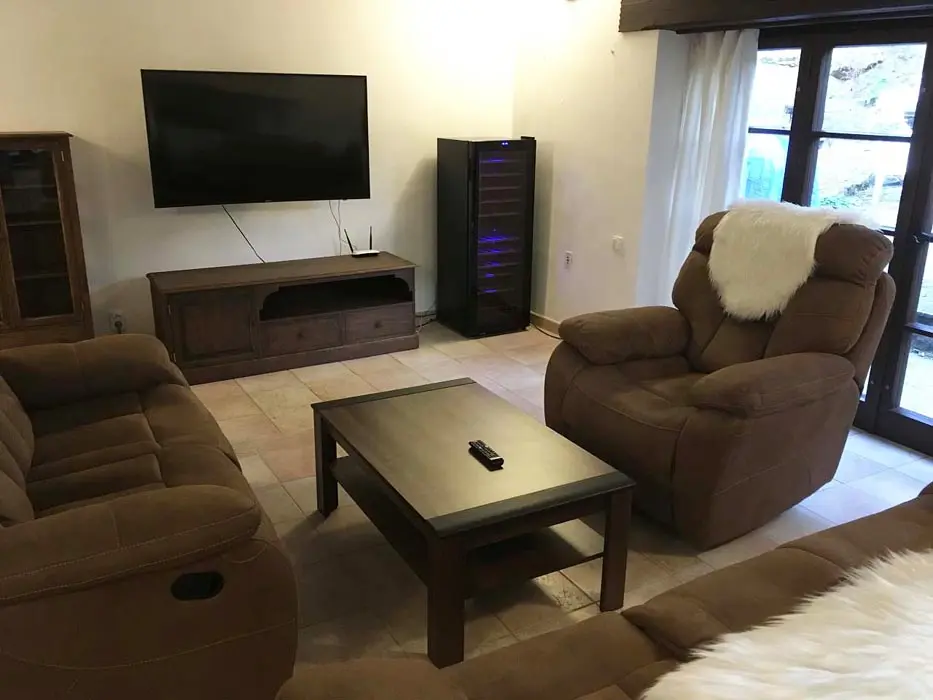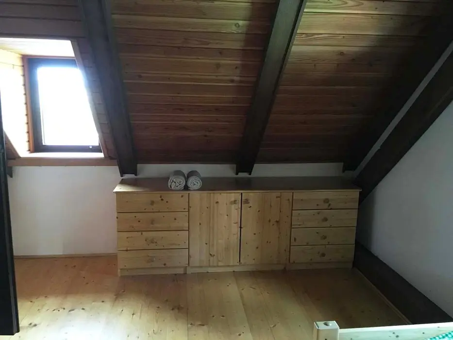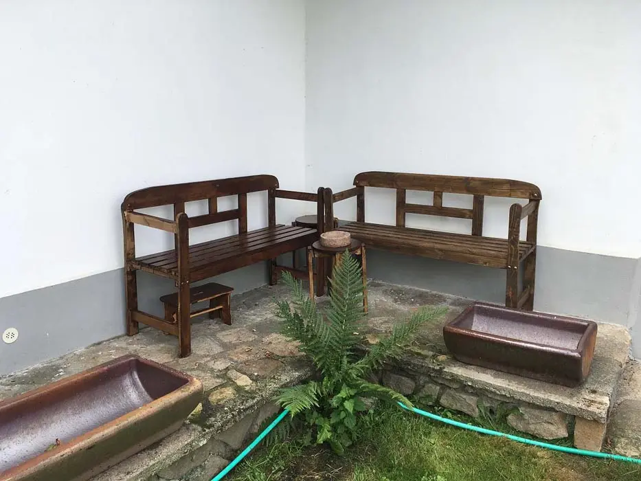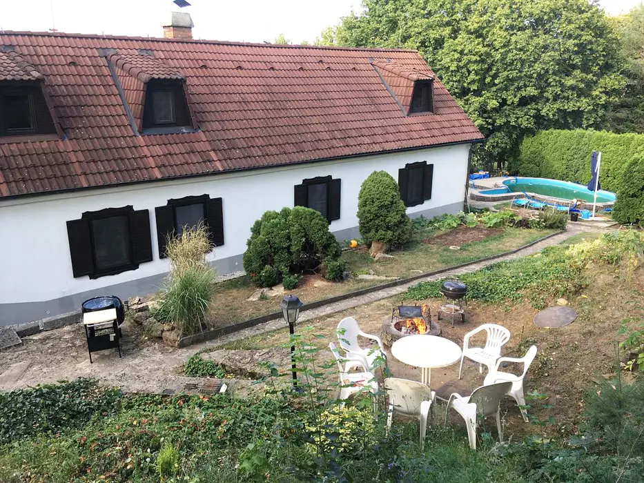 Jedná se o dvě budovy - hlavní + tzv. vejminek. Hlavní budova - prostorná sednice se starou pecí, sedací souprava, krb, TV, vinotéka. Velká kuchyně - sklokeramická varná deska, trouba, myčka, lednice s mrazákem, mikrovlnka, topinkovač, varná konvice, pressovač Tassimo, nádobí. 3 ložnice 3x4 lůžka, půdní prostor s dětským koutkem a odpočinkovou a spací zónou - 4 lůžka + 4 přistýlky. Soc. zařízení - v přízemí - koupelna s vanou a umyvadlem, samostatné WC, v podkroví koupelna se sprch. koutem a umyvadlem, WC. Část vejminek - 1 velký pokoj s manželskou postelí + kuch. kout, soc. zařízení - sprchový kout, WC. Topení - celý objekt - el. topení v kombinaci s kotlem na tuhá paliva, obývací pokoj i krbem a elektrickým podlahovým vytápěním