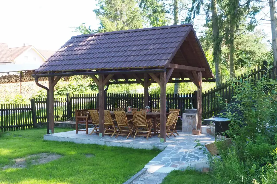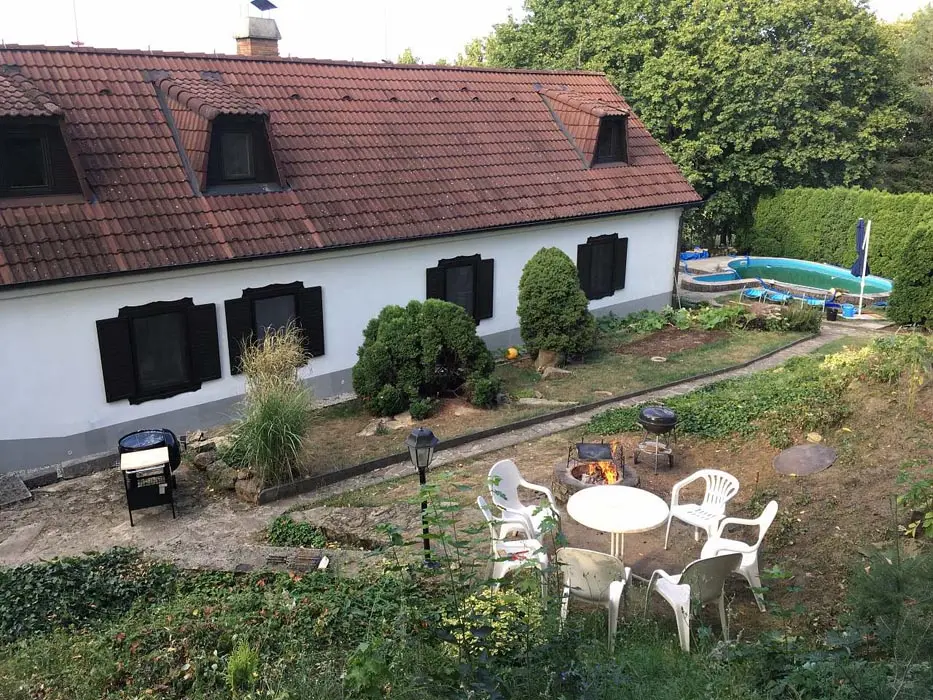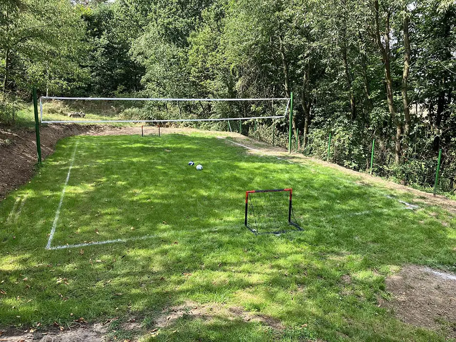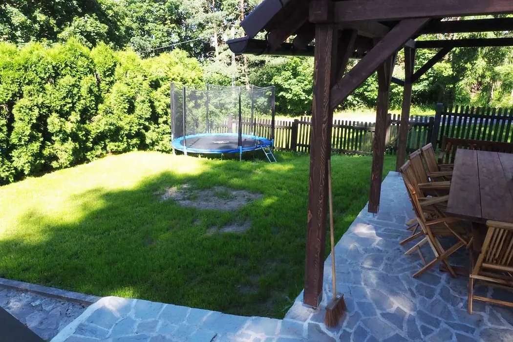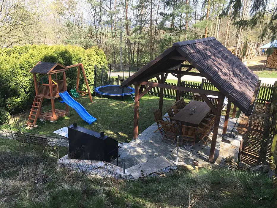 Kryté posezení, 2x gril, ohniště, skákací hrad, trampolína, zapuštěný bazén - 6x3 m, pro malé děti nafukovací brouzdaliště, na zápraží krytý kuřácký koutek ( v chalupě je přísný zákaz kouření ), venkovní hřiště (fotbal, volejbal)