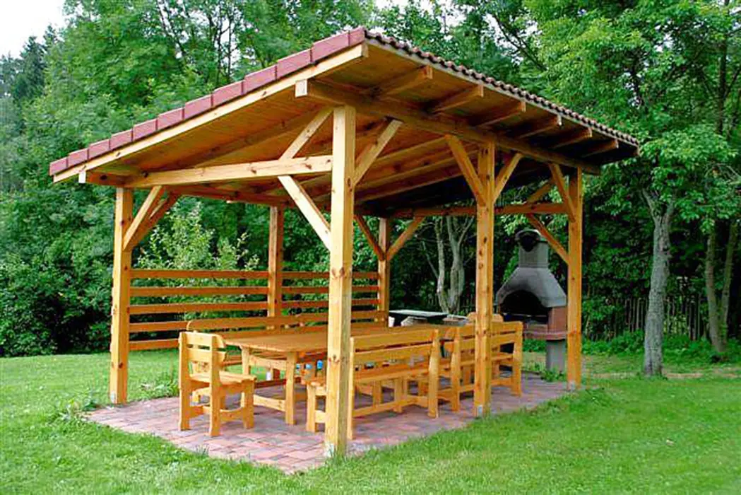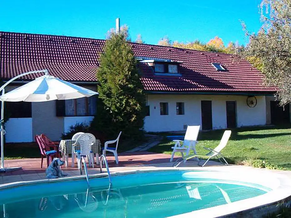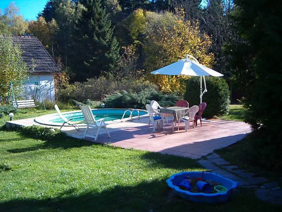 Na oploceném pozemku 1200 m2 krytá pergola s posezením, zapuštěný bazén 5,5 x 3,5 x 1,3 m, houpací lavice, trampolína, možnost uschování kol v garáži