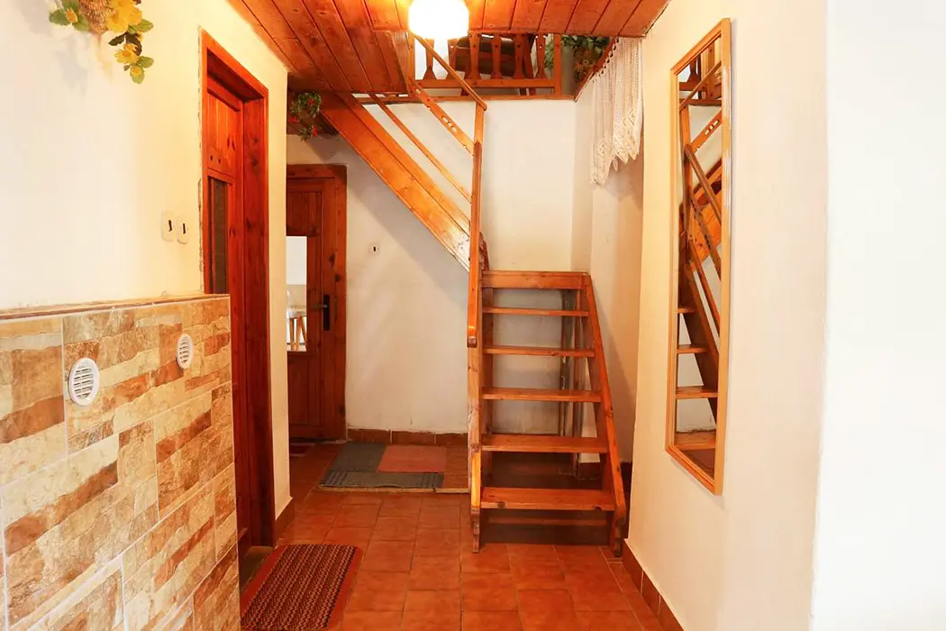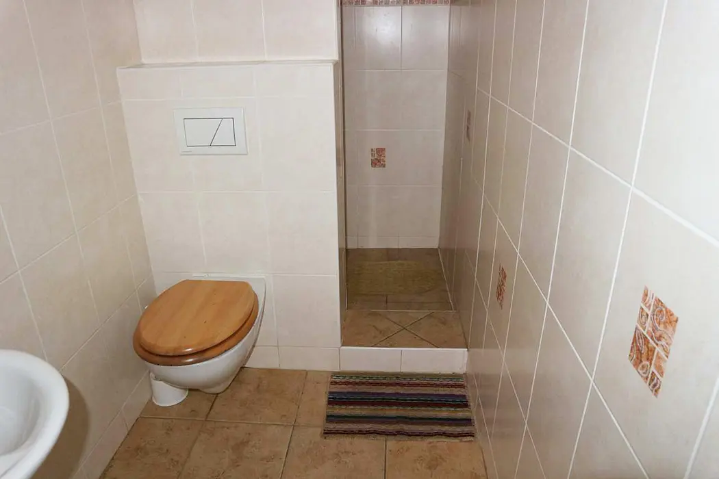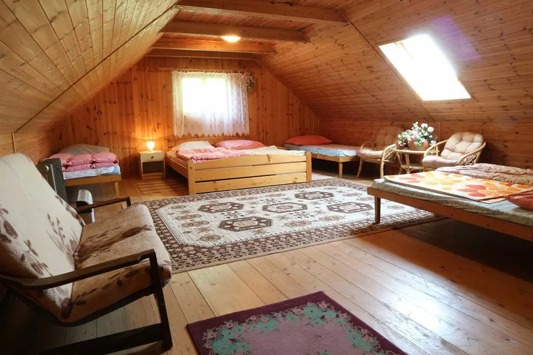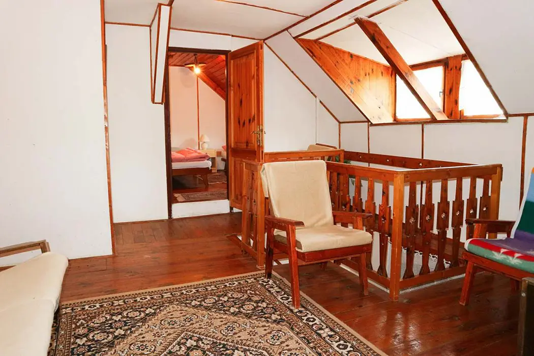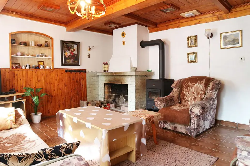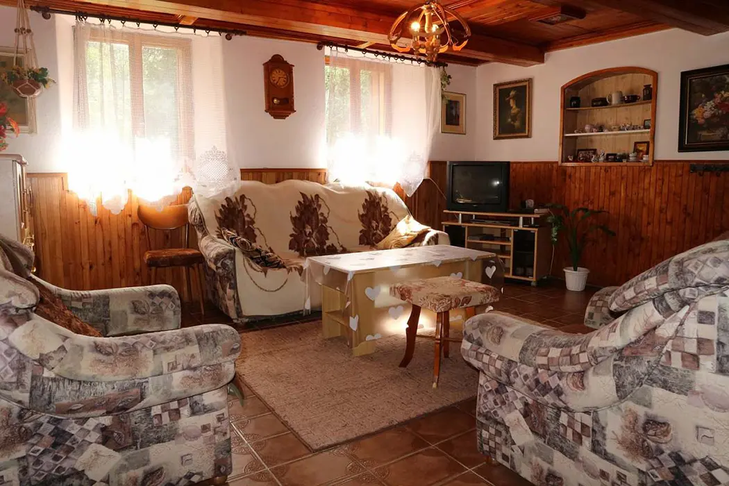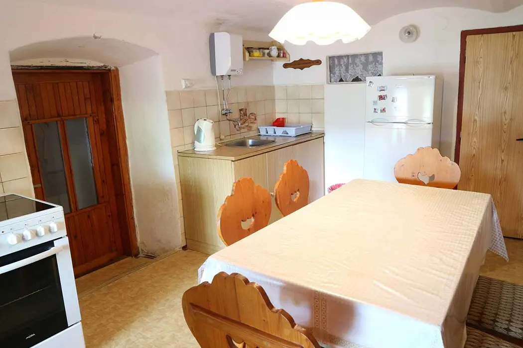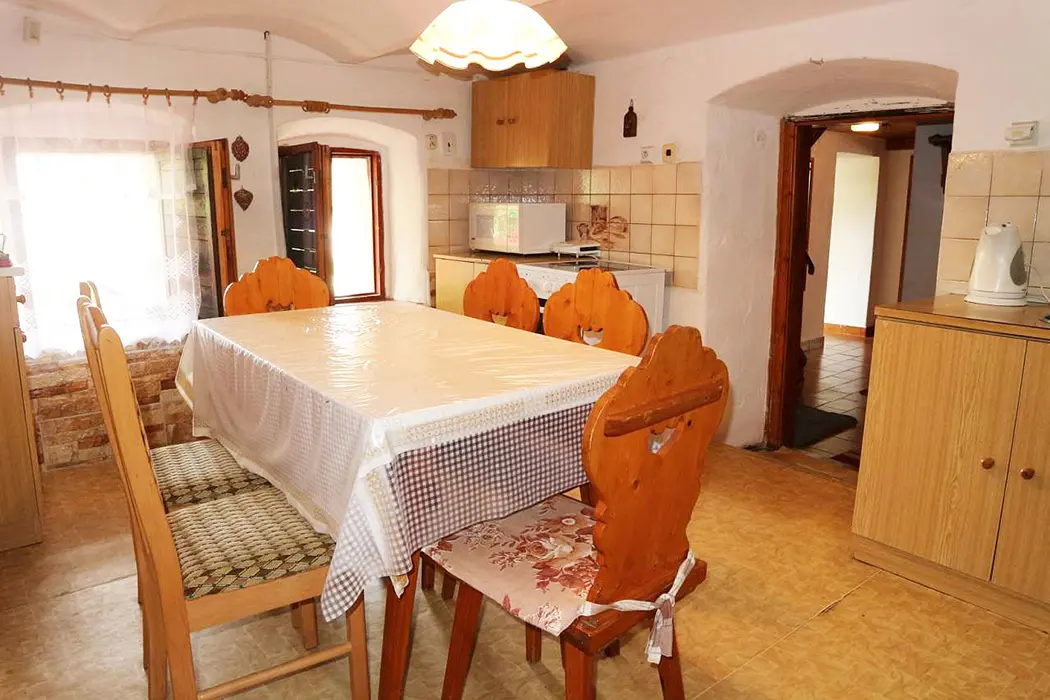 Obývací pokoj s posezením, krb, TV, v další místnosti stoly a lavice. Samostatná kuchyně - el. sporák, lednice 180 l s mrazícím boxem, kávovar, varná konvice, toustovač, mikrovlnka, nádobí. V patře 4 ložnice - 2x2, 1x3, 1x6 lůžek. Soc. zařízení - vana se sprchou + sprchový box, umyvadlo, samostatné WC. Další - přístup ze dvora - sprcha, umyvadlo, WC. Topení - krb + el.přímotopy