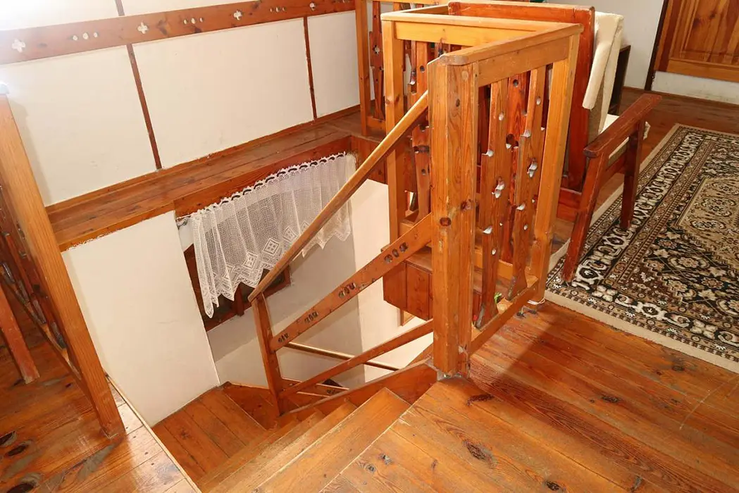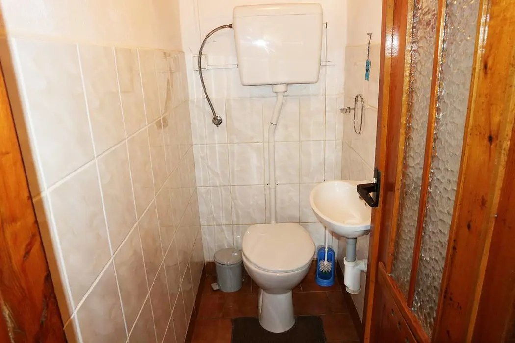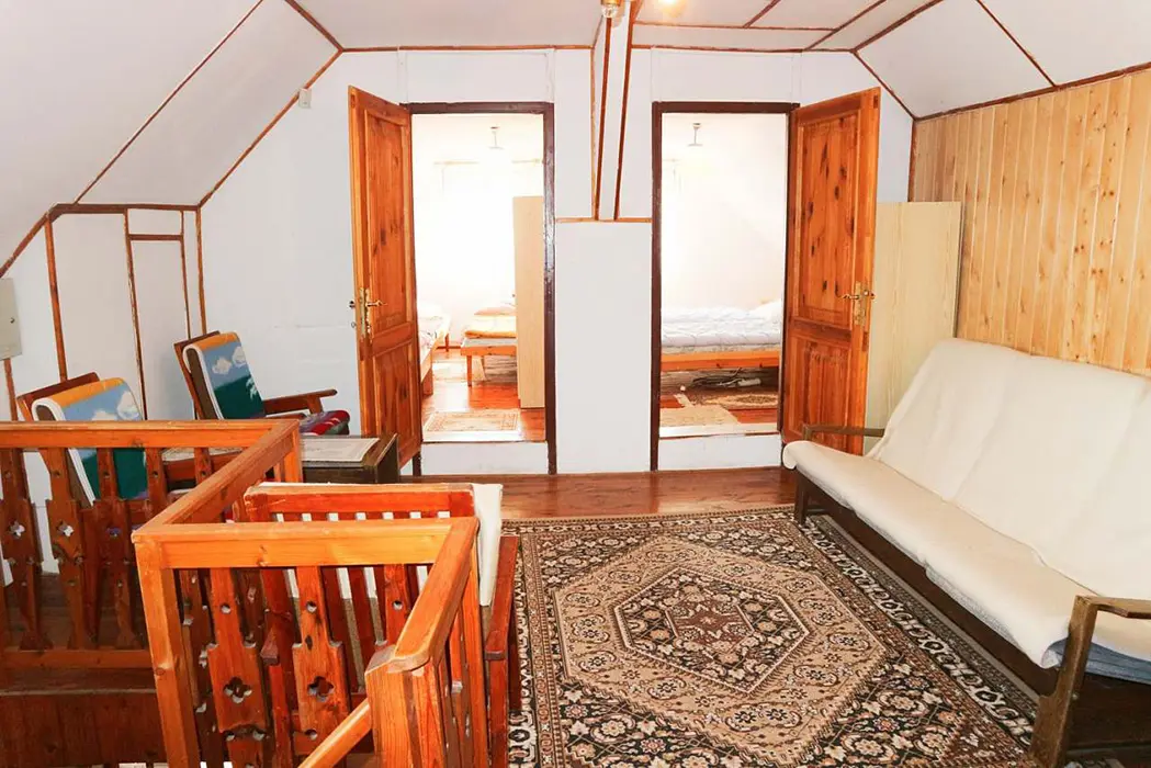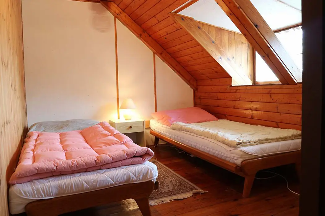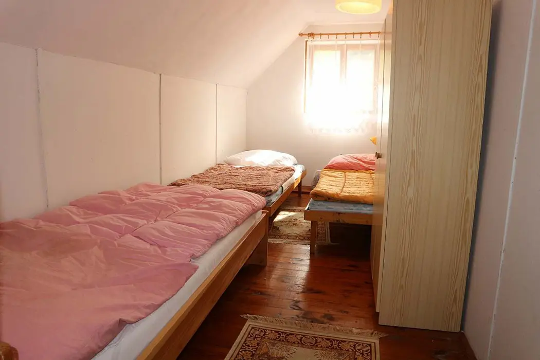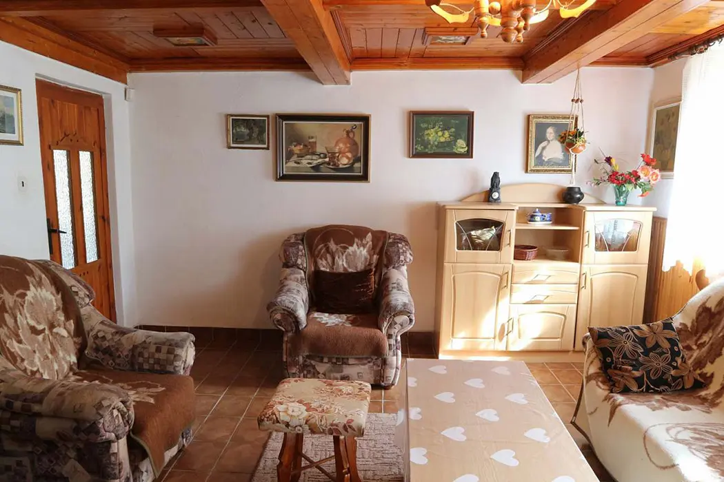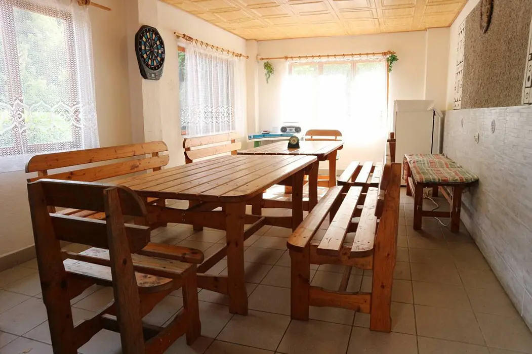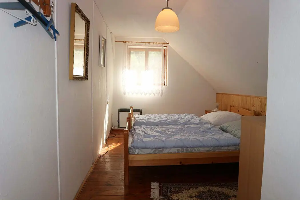 Obývací pokoj s posezením, krb, TV, v další místnosti stoly a lavice. Samostatná kuchyně - el. sporák, lednice 180 l s mrazícím boxem, kávovar, varná konvice, toustovač, mikrovlnka, nádobí. V patře 4 ložnice - 2x2, 1x3, 1x6 lůžek. Soc. zařízení - vana se sprchou + sprchový box, umyvadlo, samostatné WC. Další - přístup ze dvora - sprcha, umyvadlo, WC. Topení - krb + el.přímotopy