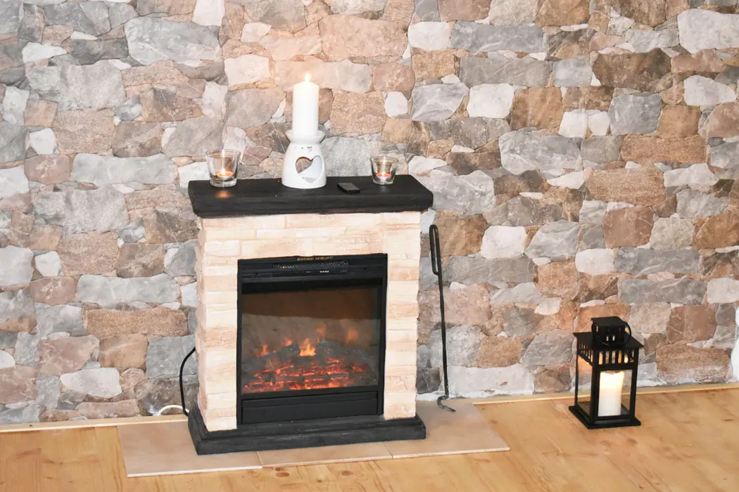 Obývací pokoj - sedací souprava ( možnost 1 přistýlky), manželská postel, el. krb, kuchyně - lednice, indukční varná deska, elektrická trouba, mikrovlnná trouba, nádobí, stůl a židle. 1 ložnice - 1x2 lůžka. Soc. zařízení - koupelna se sprchovým koutem a WC. Topení - el. krb, el. přímotopy